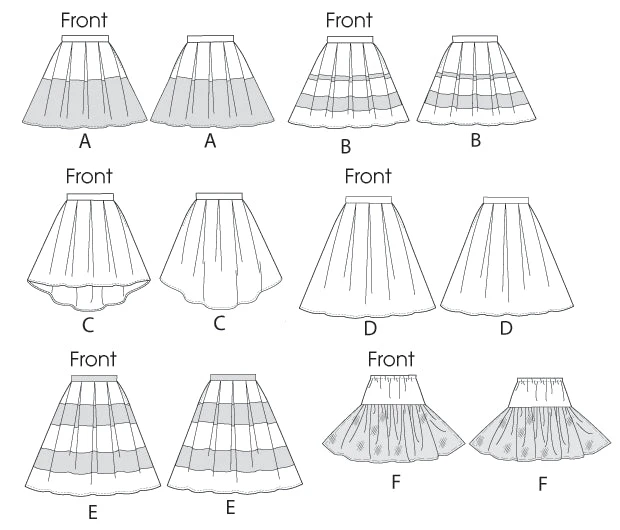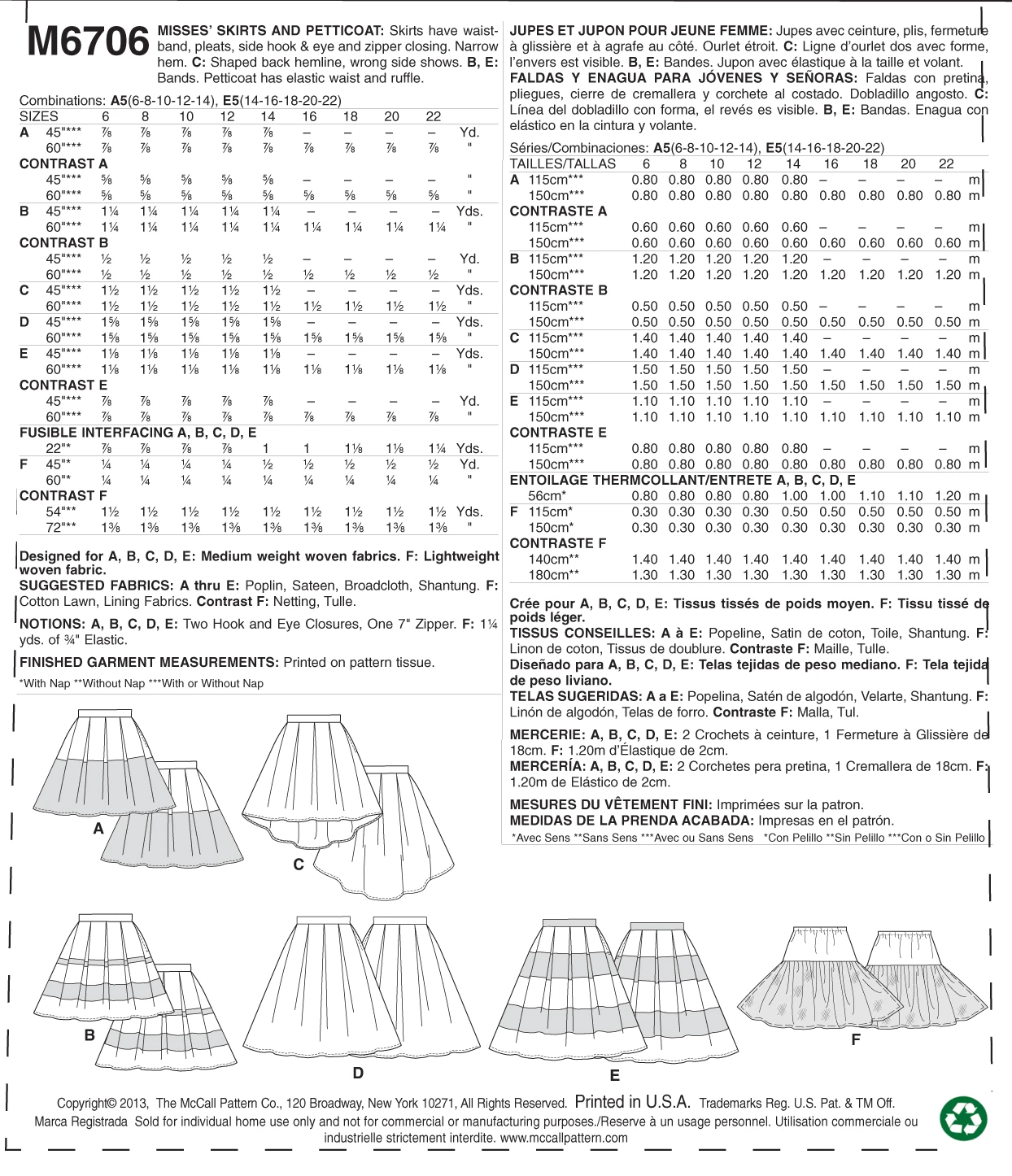 MISSES’ SKIRTS AND PETTICOAT: Skirts have waistband, pleats, side hook & eye and zipper closing. Narrow hem. C: shaped back hemline, wrong side shows. B,E: bands. Petticoat has elastic waist and ruffle. Designed for A,B,C,D,E: medium weight woven fabrics; F – light weight woven fabric. SUGGESTED FABRICS: A-E: Poplin, Sateen, Broadcloth, Shantung. F: Cotton Lawn, Lining Fabrics. Contrast F: Netting, Tulle. NOTIONS: A,B,C,D,E: Two Hook & Eye Closures, One 7″ Zipper. F: 11/4 yds. 3/4″ Elastic. * With Nap **Without Nap ***With or Without Nap Combinations: A5(6-8-10-12-14),E5(14-16-18-20-22)