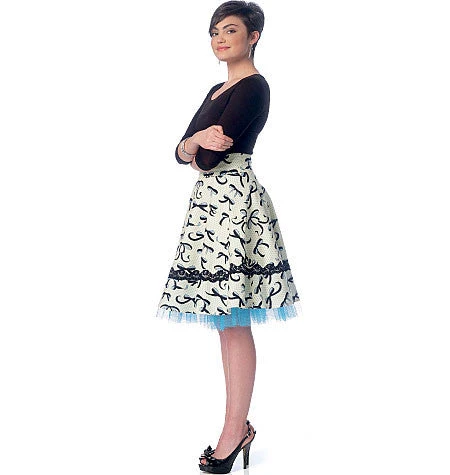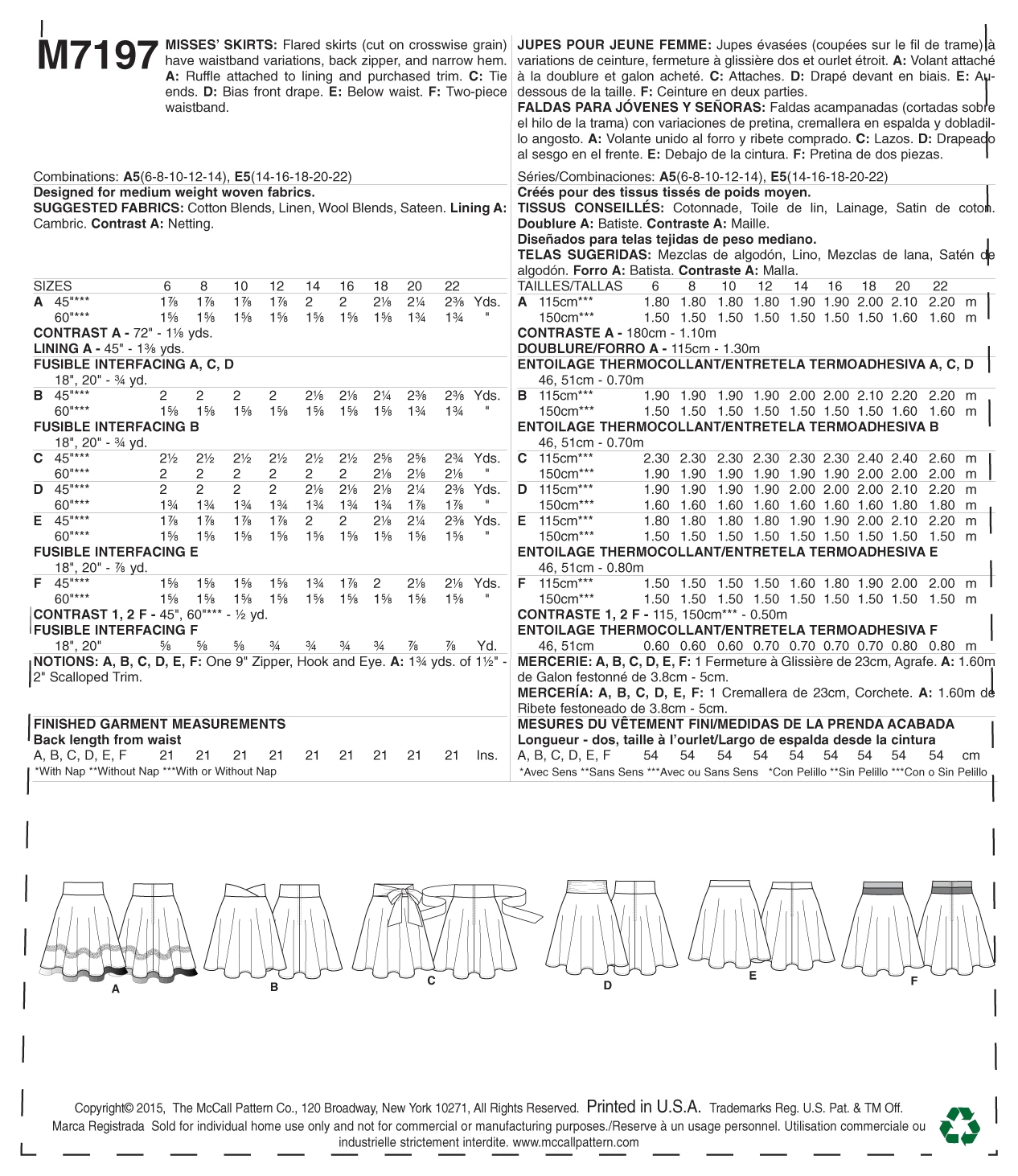 MISSES’ SKIRTS: Flared skirts (cut on crosswise grain) have waist waistband variations, back zipper and narrow hem. A: Ruffle attached to lining, and purchased trim. C: Tie ends. D: Bias front drape. E: Below waist. F: Two-piece waistband. Designed for medium-weight woven fabrics. FABRICS: Cotton Blends, Linen, Wool Blends, Sateen. Lining A: Cambric. Contrast A: Netting. *With Nap **Without Nap ***With or Without Nap NOTIONS: A, B, C, D, E, F: One 9″ Zipper and Hook and Eye. A: 13/4 yds. of 11/2” – 2″ Scallop Trim. Size Combinations: A5(6-8-10-12-14), E5(14-16-18-20-22)