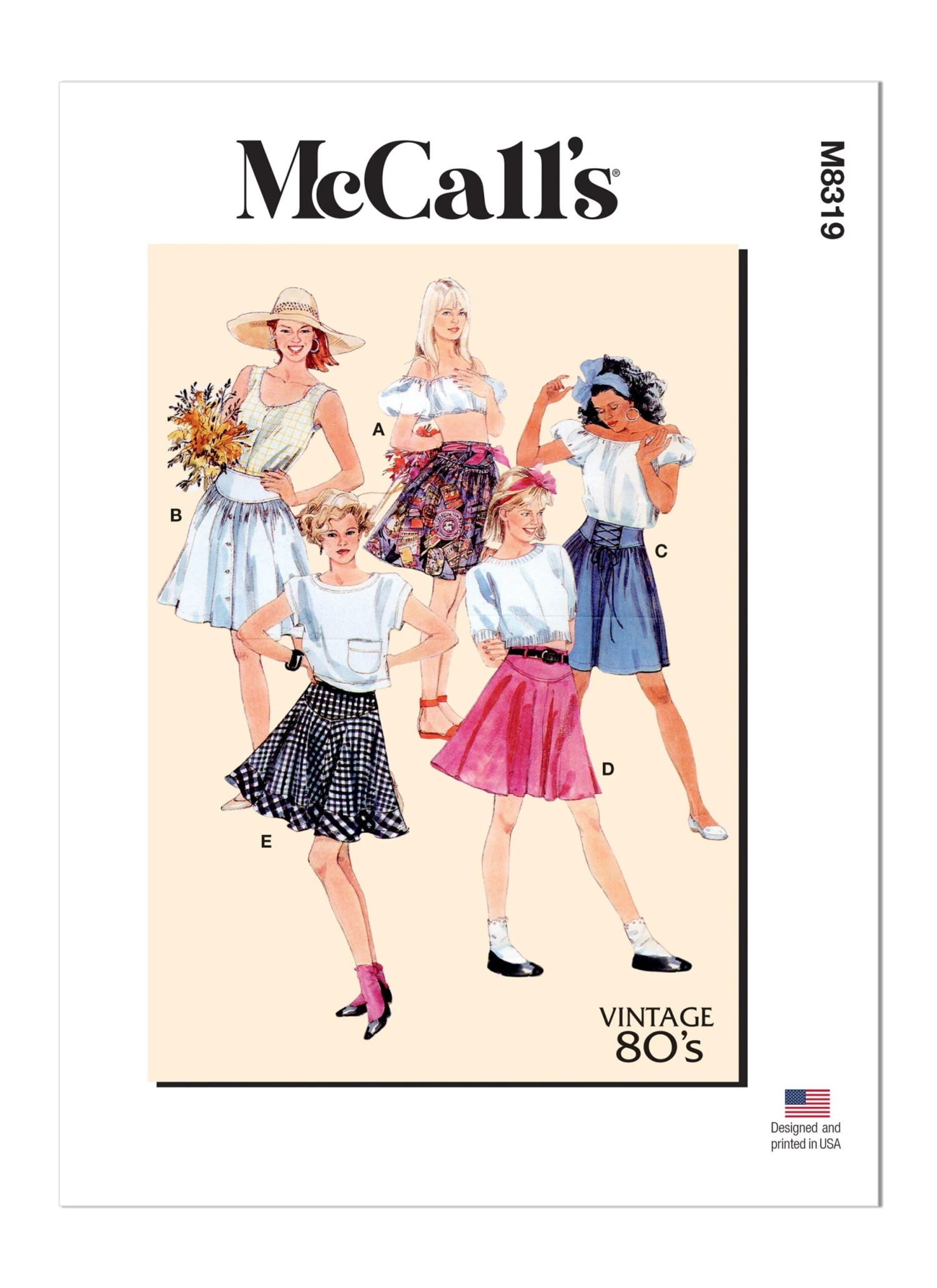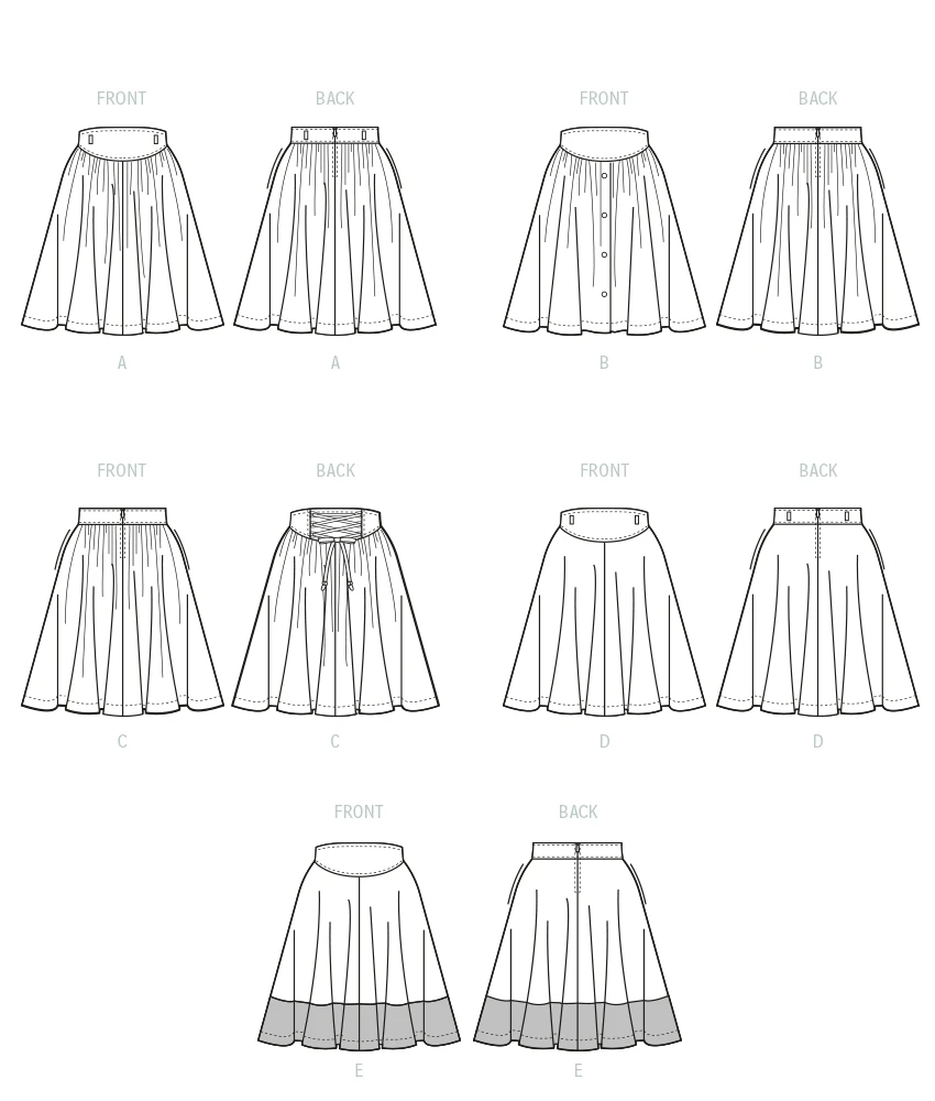 McCall’s sewing pattern for 1980’s Vintage Reissue Sewing Pattern. Skirts have shaped waistband, back zipper opening and side seam pockets. Views A, B, C are gathered skirts. View A has belt loops. View B has front button opening. View C has lacing. Views D and E are flared skirts. View E has contrast lower band.
