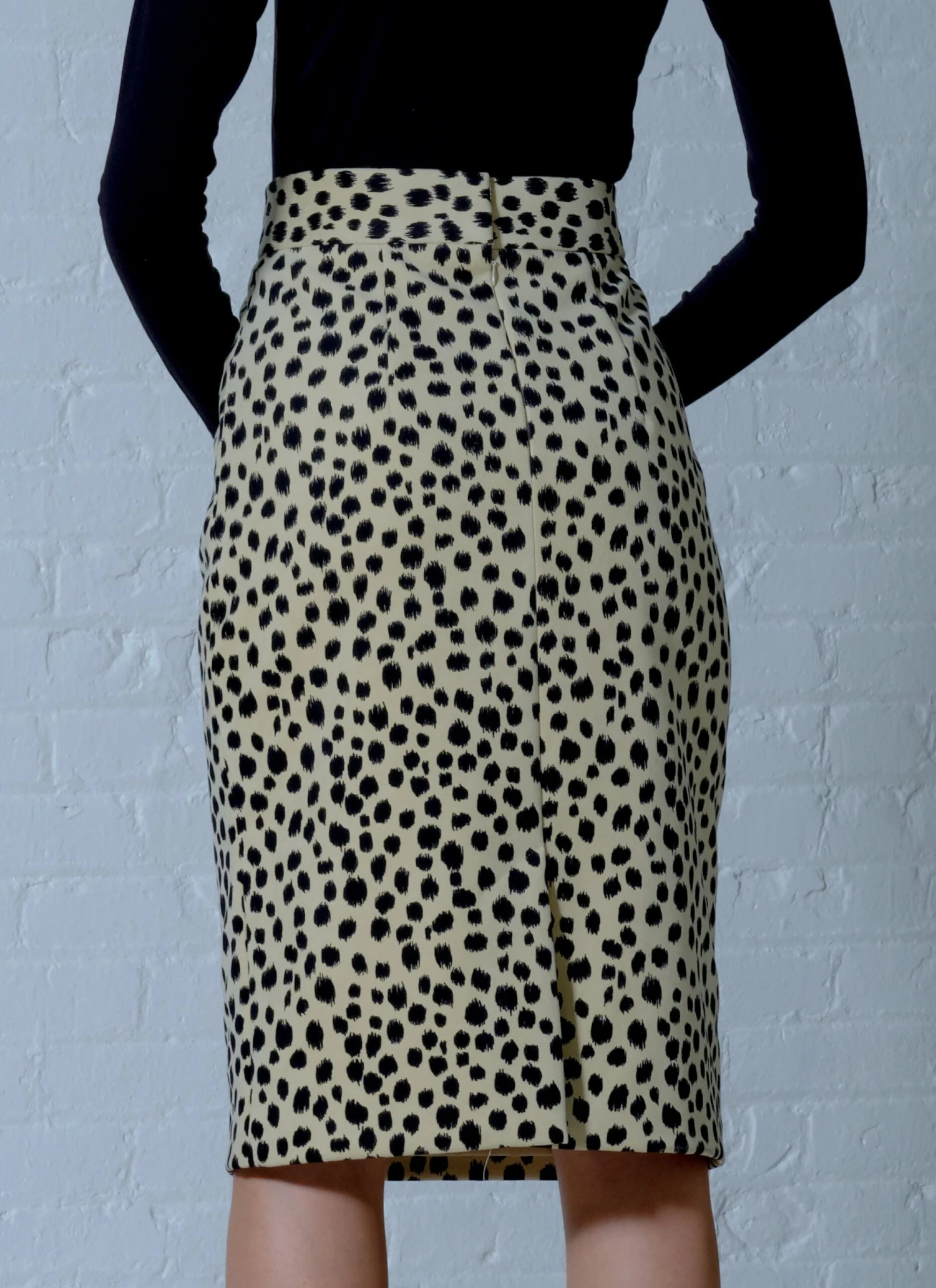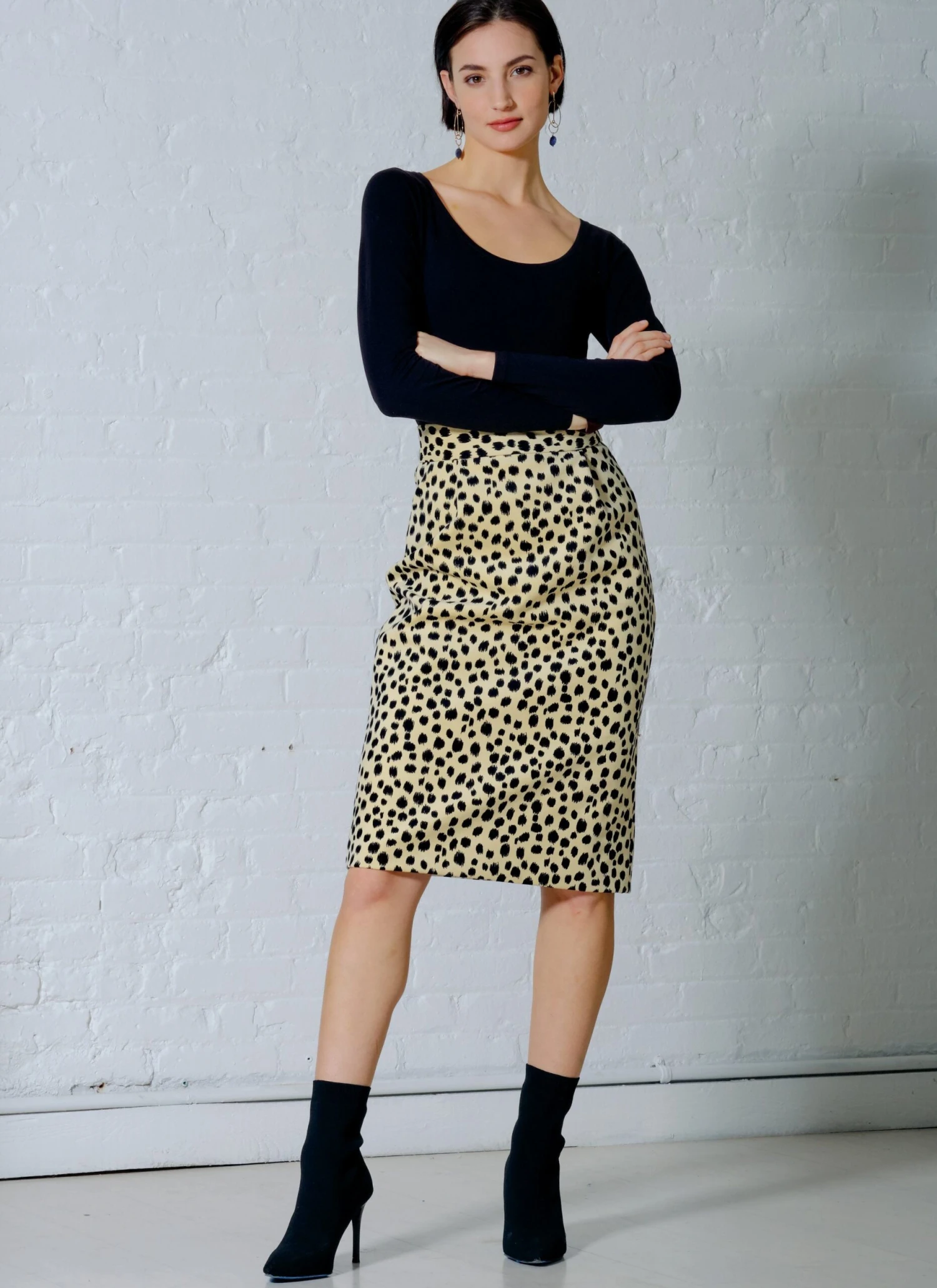 Fitted, lined skirts have front pleats, back darts, invisible zipper, hook and bar closure, and length variations. A: waistband tucks. B, C: back vent. C: Belt and carriers.