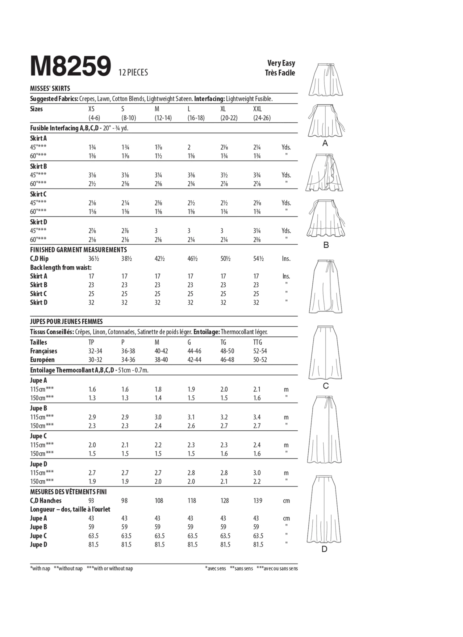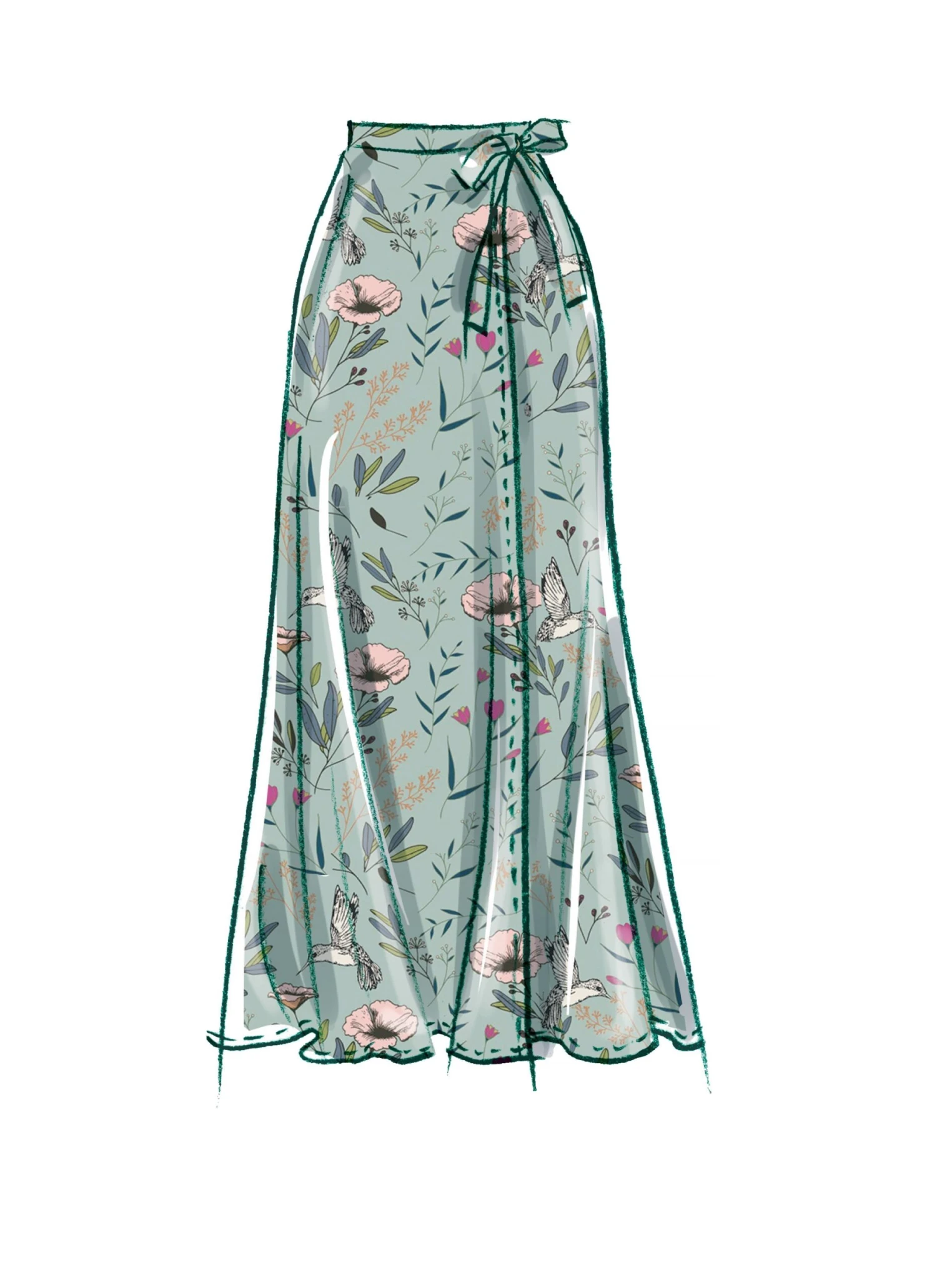 Learn to sew a true wrap skirt with waistband and self tie. Views A and B ballet skirts are above the knee. View B has a flounce. View C has a curved shaped hem and hits below the knee. View D is lower than calf length.