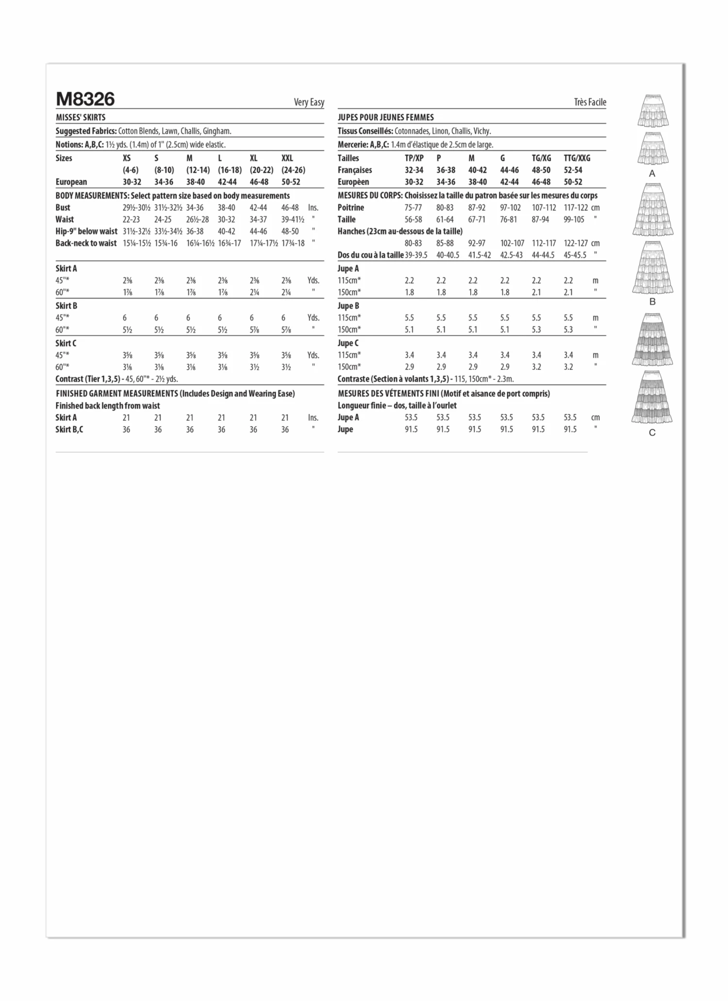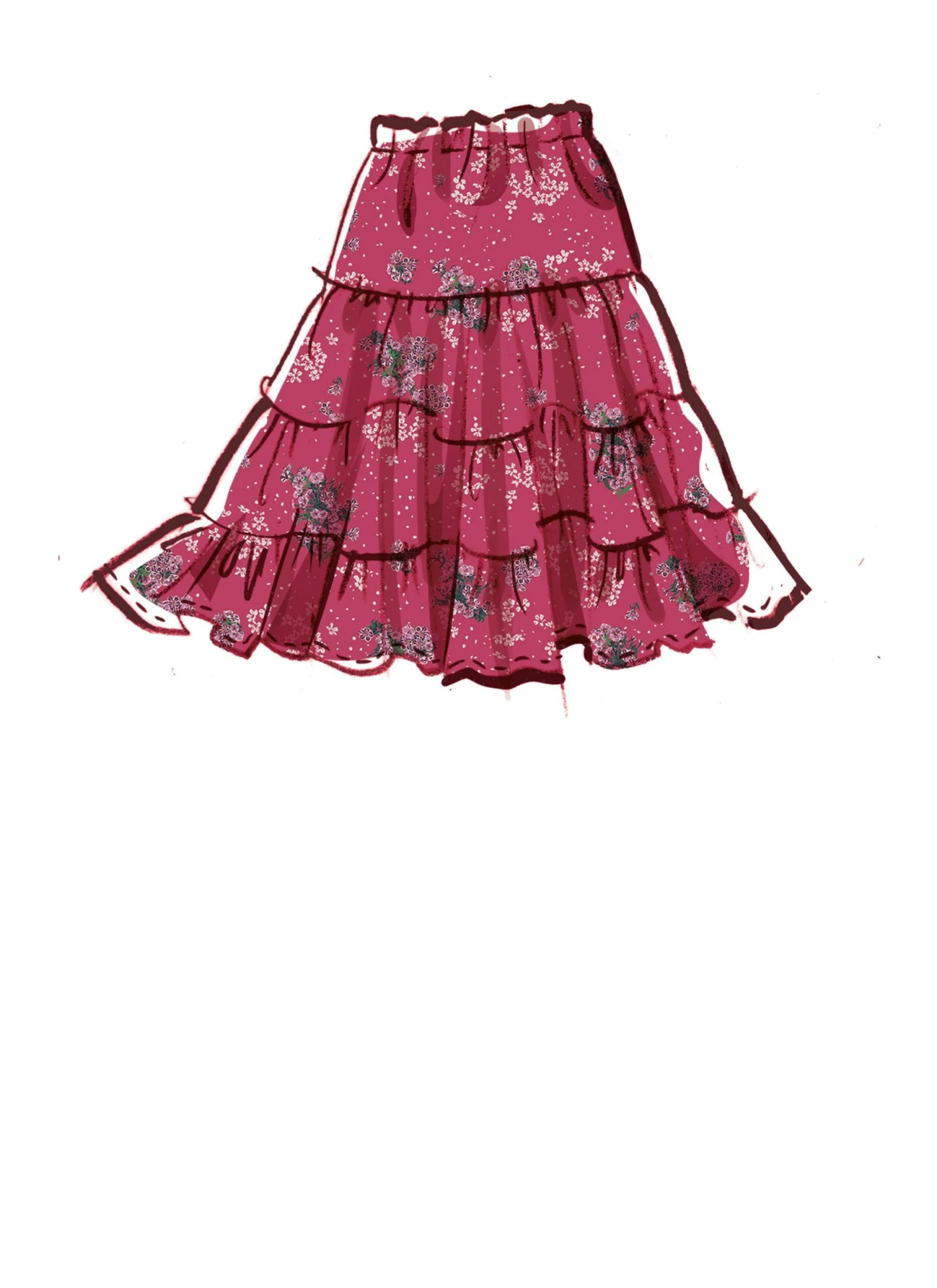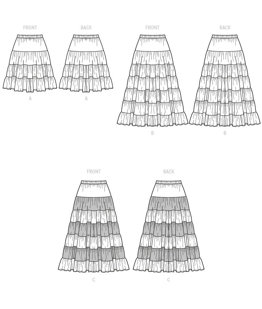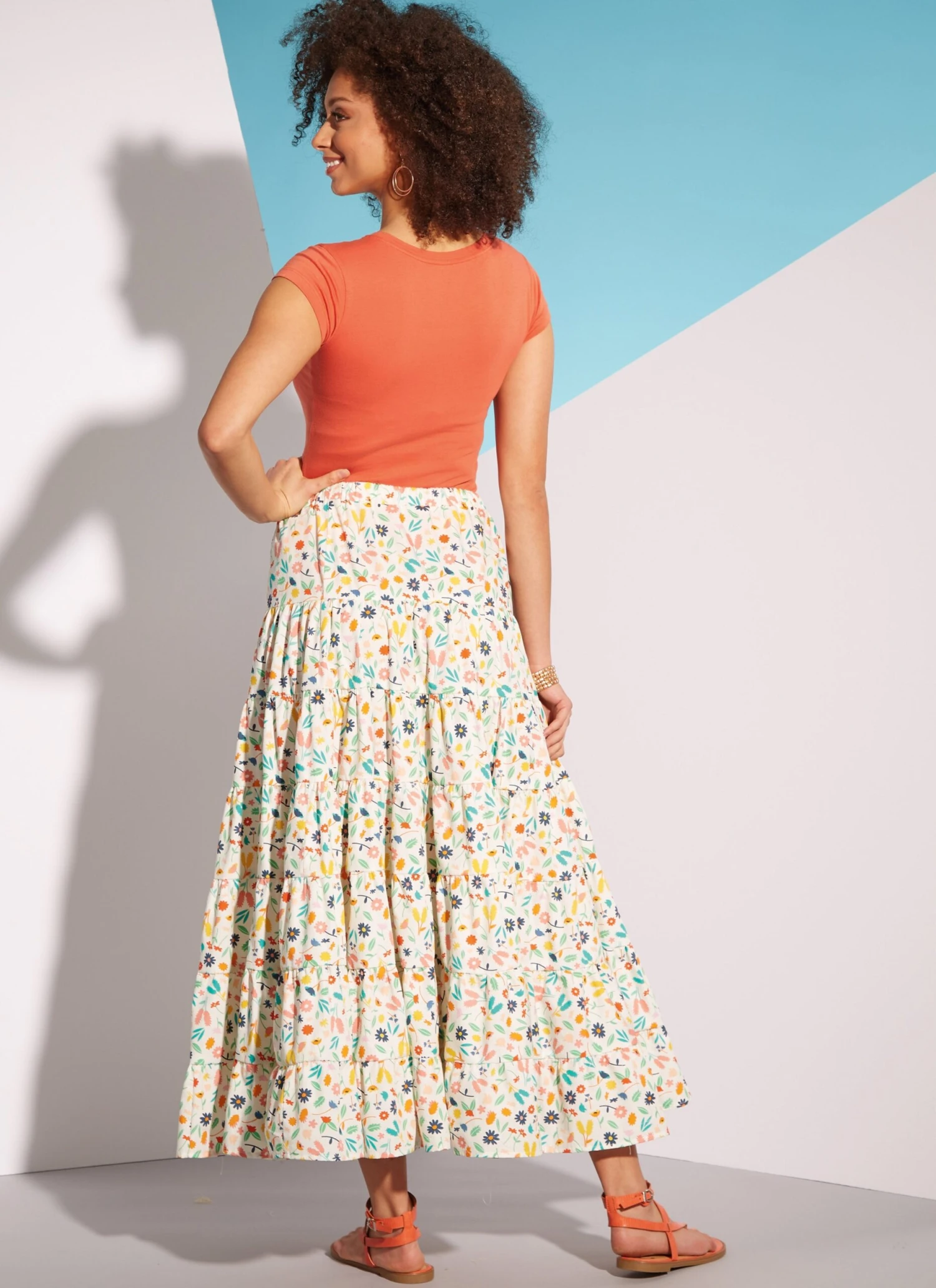 McCall’s sewing pattern for Pull-on elastic waist gathered and tiered boho skirts in two lengths are finished with narrow hems. View C has contrast tiers.