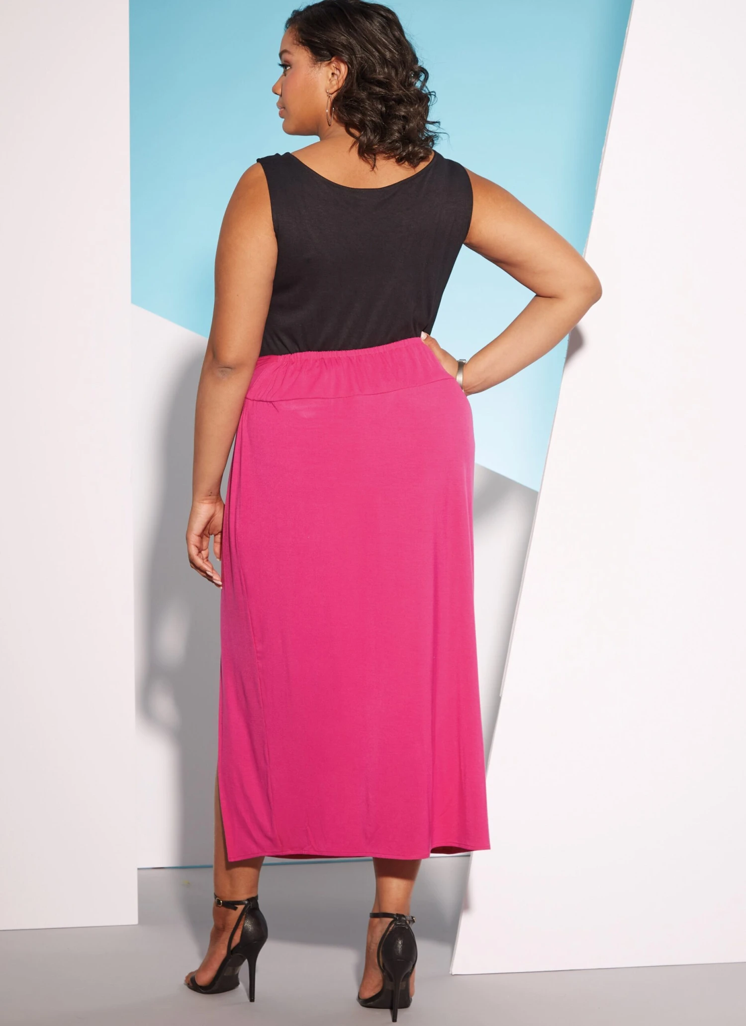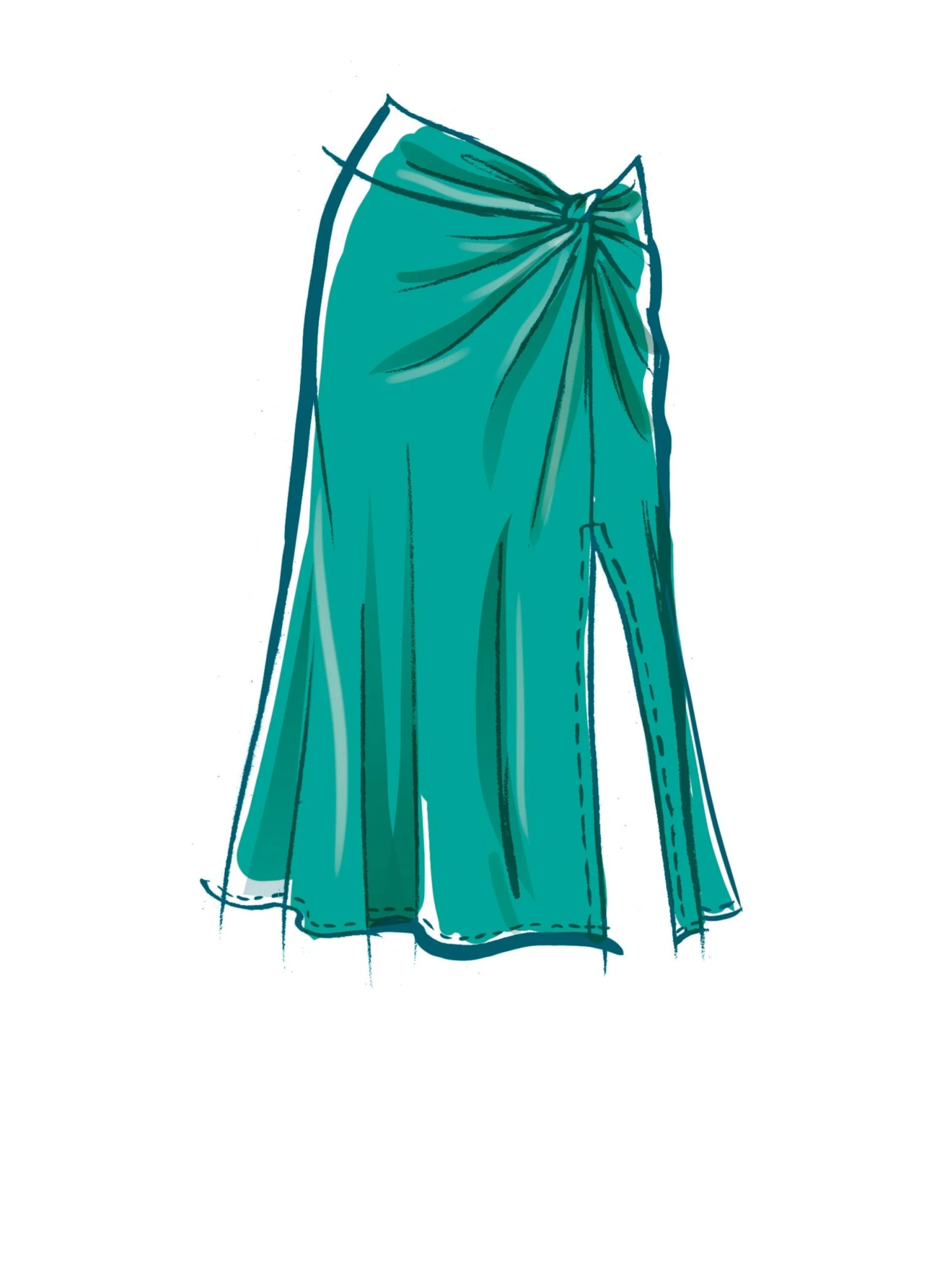 McCall’s sewing pattern for Knit twist knot skirts with front slit come in two lengths. Views A and B are straight skirts. View C is flared.