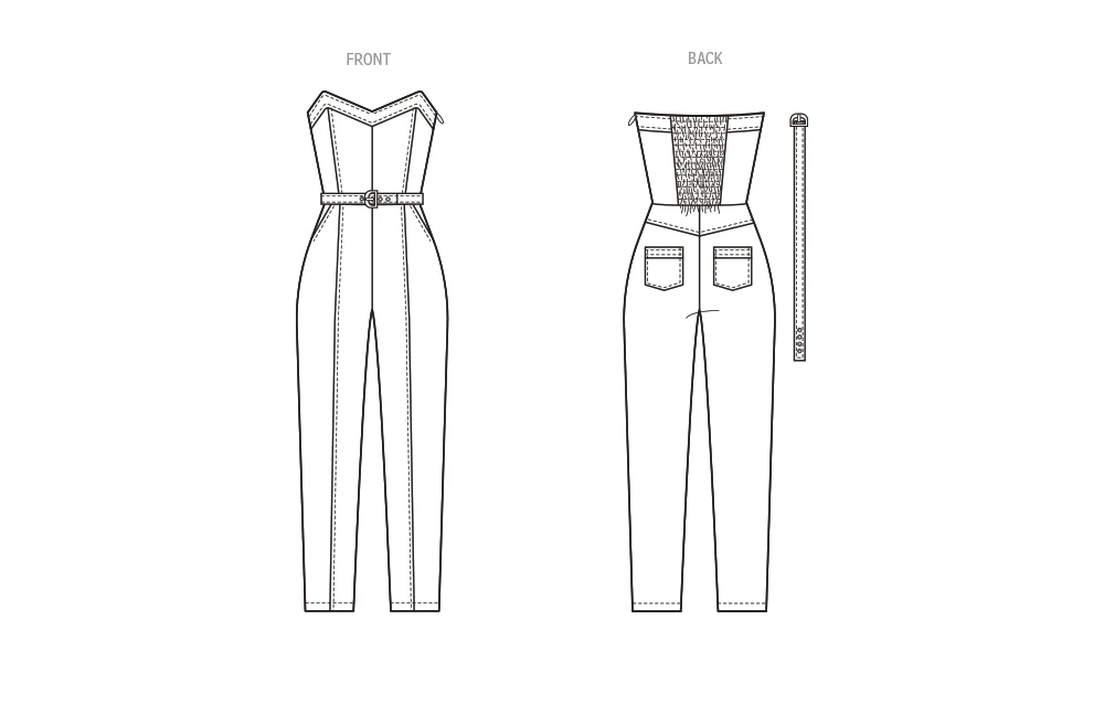 Brandi Joan jumpsuit has slant pockets, back patch pockets, smocked back with invisible side zipper closure, and detachable belt.