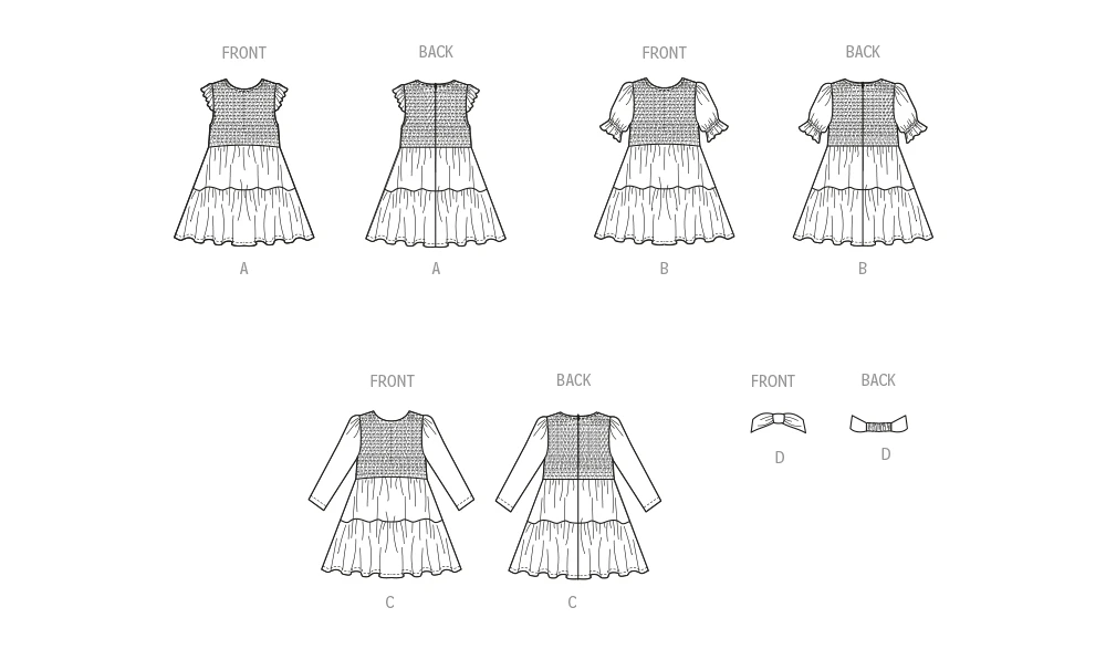 McCall’s sewing pattern for adorable children’s dress with sleeve variations has shirred bodice, narrow hem, tiered skirt and invisible back zipper. Headband has elastic and a knot on top of the band.