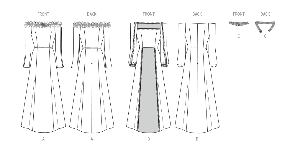 McCall’s sewing pattern for Long dresses have fitted bodice with front and back darts and flared skirt. Both dresses are off the shoulder sleeves. Dress B has separate belt.