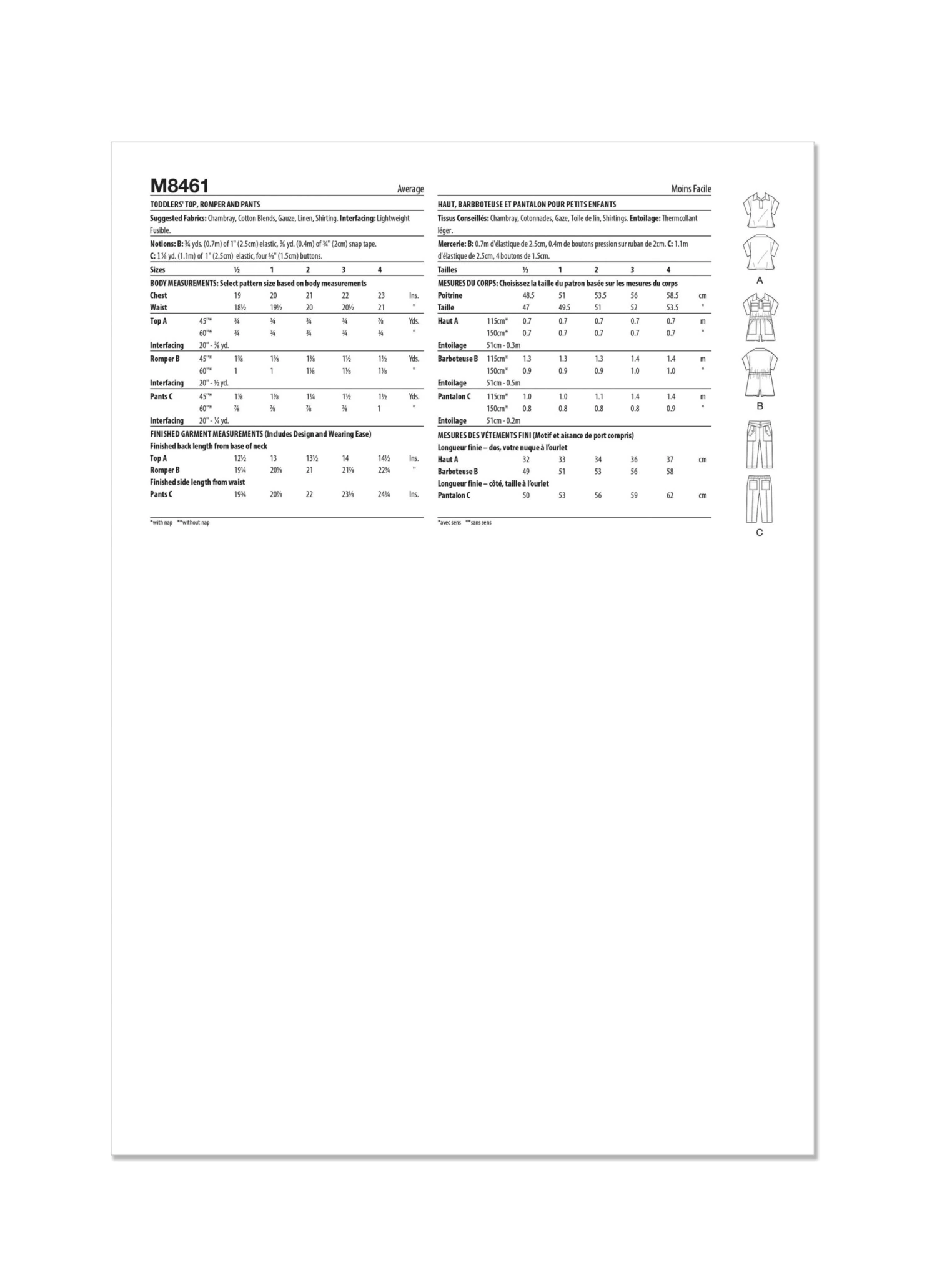 Create these stylish toddler outfits for Spring! Top and romper have short sleeves, collar and placket. Romper has elastic at waist, front pockets and purchased snap tape at the crotch. Ankle length pants have seam details, front yoke, decorative buttons at the pocket flap and elastic waistband.
