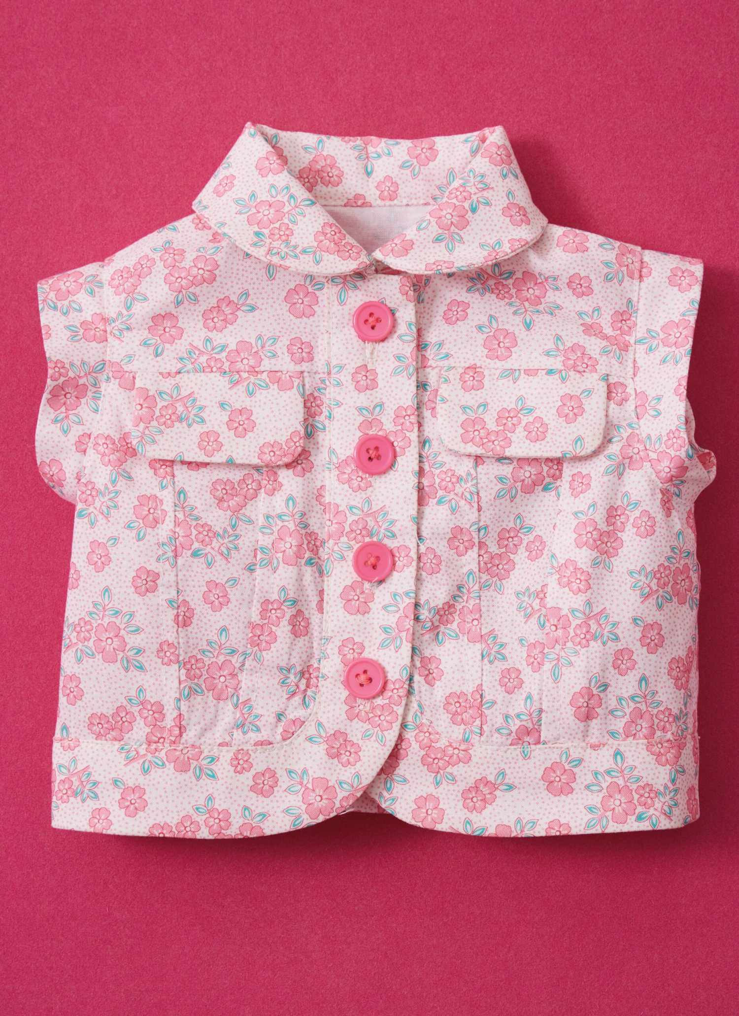 Be prepared this spring with adorable sportswear gear for Babies. Pattern includes vest, jacket and overalls in two lengths. Jacket and vest have pockets, collar, and front button closure. Overalls have button straps, patch pocket and front pleats.