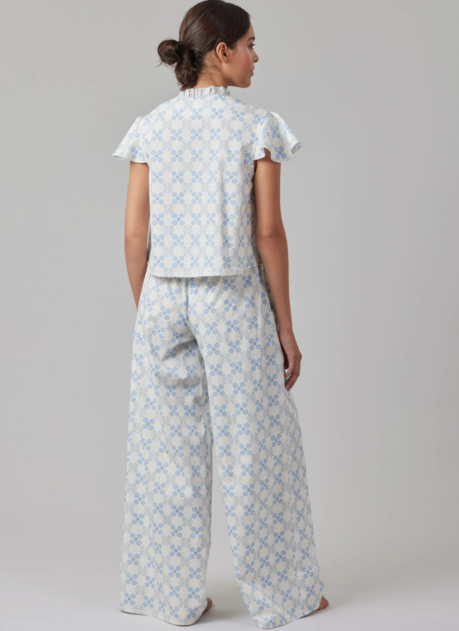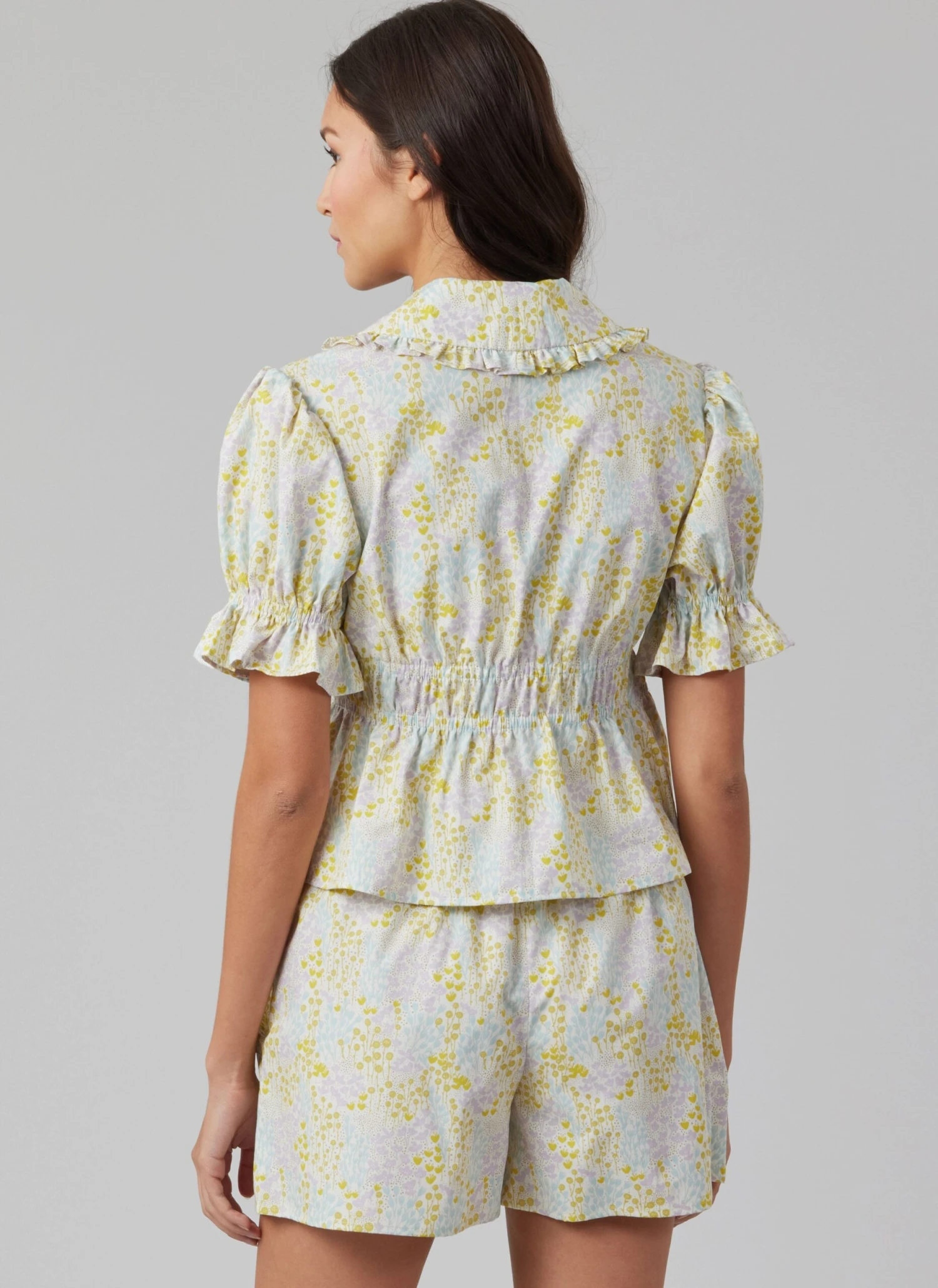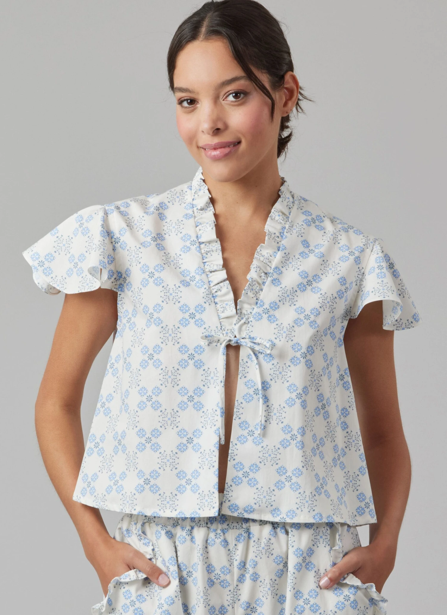 Sewing pattern for Tie front top has flounce sleeve and ruffles at neckline. View B top has front button opening, collar with ruffle detail, short puff sleeves and shirred bodice. Pull on shorts and pants have elastic waist and side pockets with self ruffle detail.