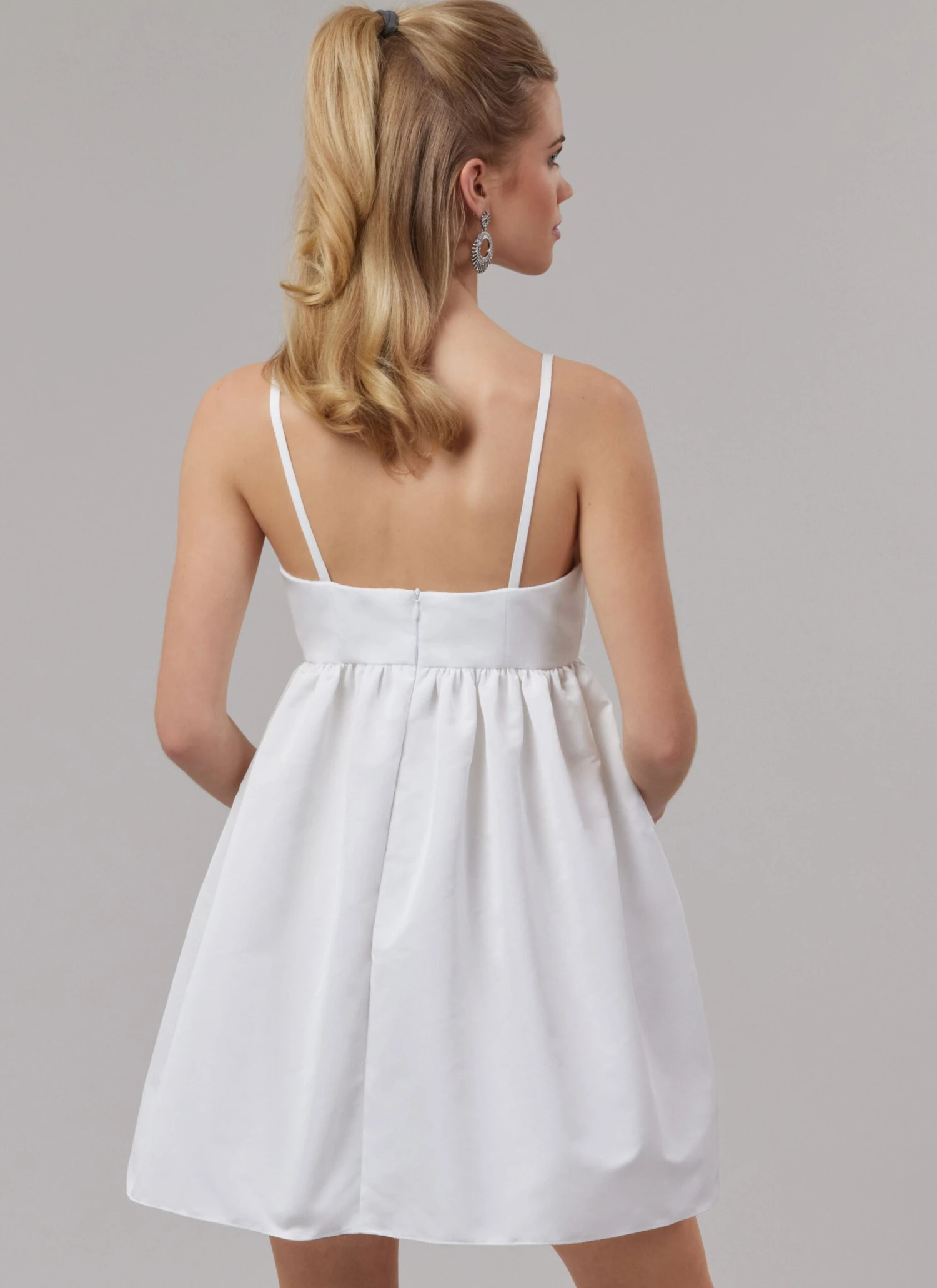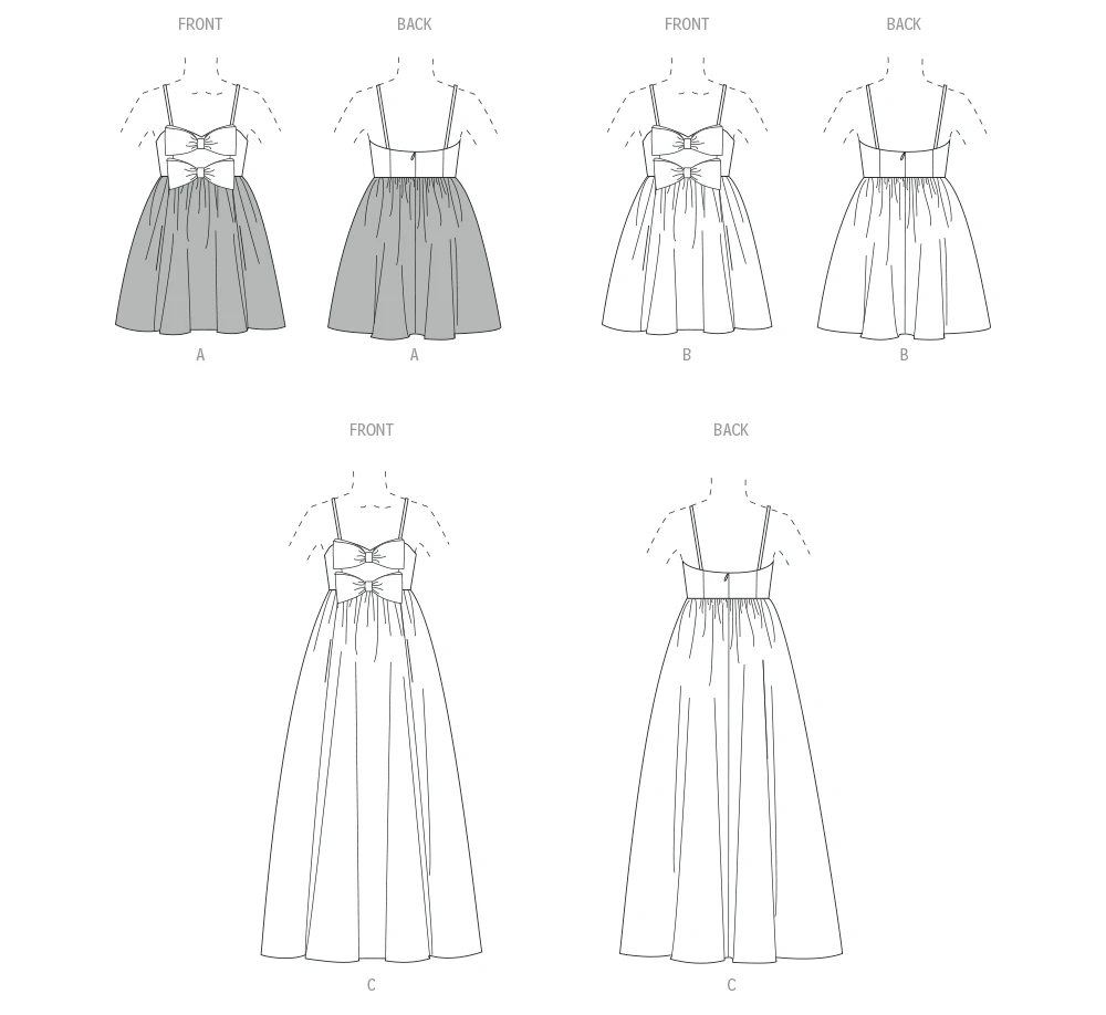 McCall’s sewing pattern for Empire waist dress, close-fitting through bust, has sweetheart neckline, double bow front, lined bodice and narrow straps. Full skirt has side front pockets, no side seams. Invisible back zipper and unlined skirt.