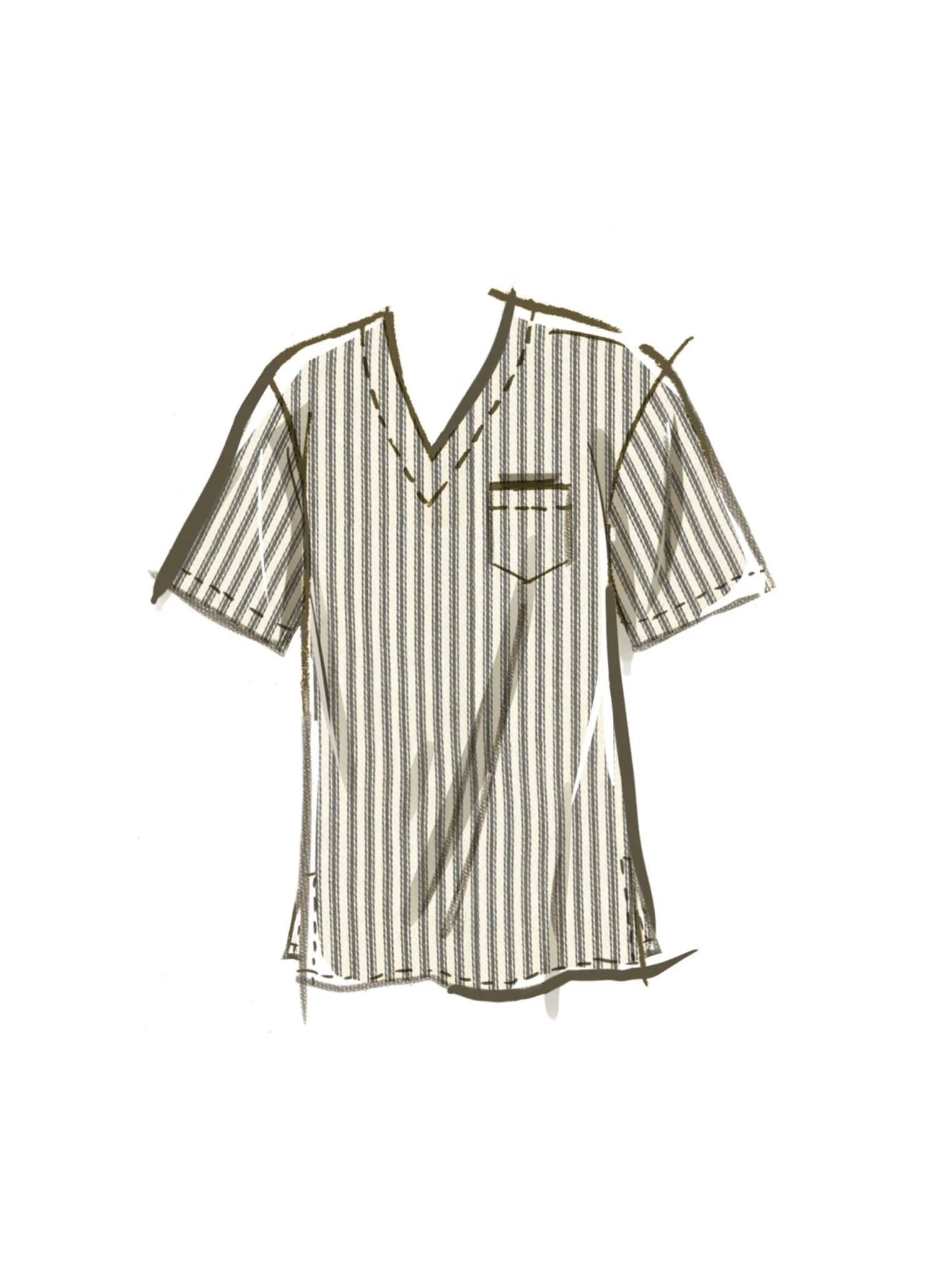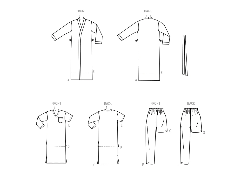 McCall’s sewing pattern for Loose fitting wrap robe in two lengths features patch pockets and tie belt; pullover nightshirt and top have sleeve variations; pull-on pants and short have elastic waist.