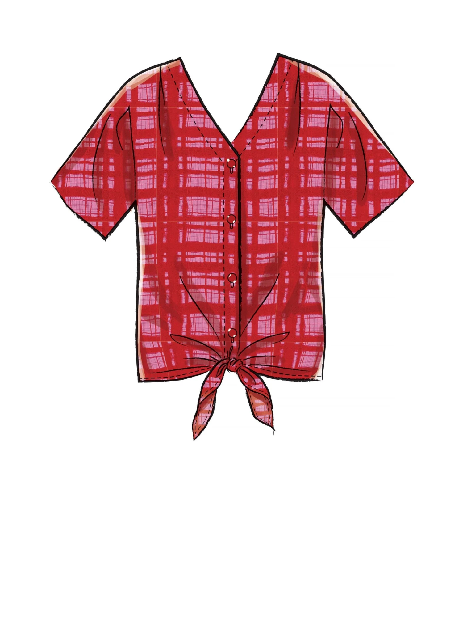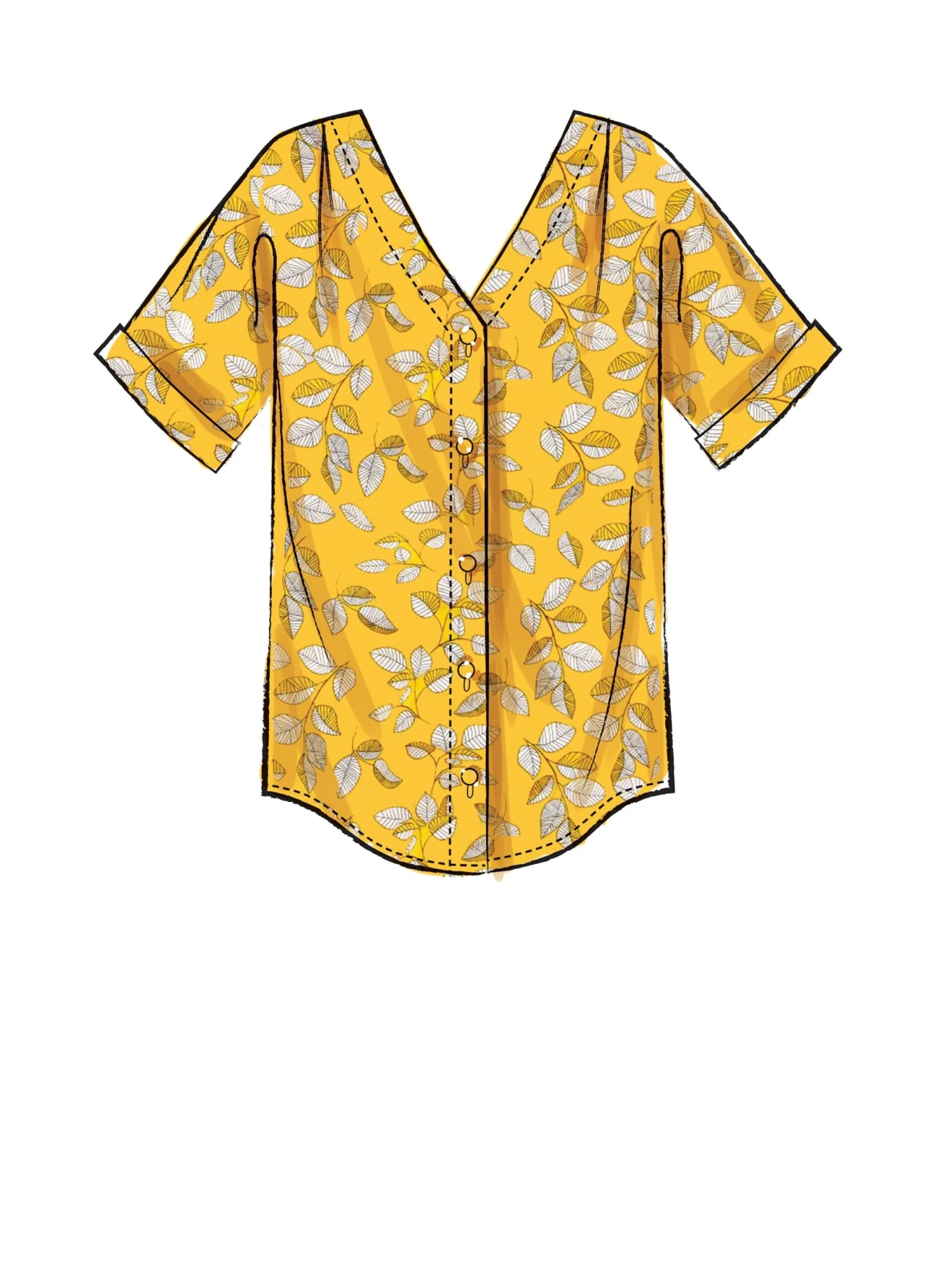 Very loose-fitting tops have yoke back, front shoulder and back pleats, and front button closing. B: Flounce and ties. C: Cuffs. D:Tie ends. C, D: Shaped hemline.