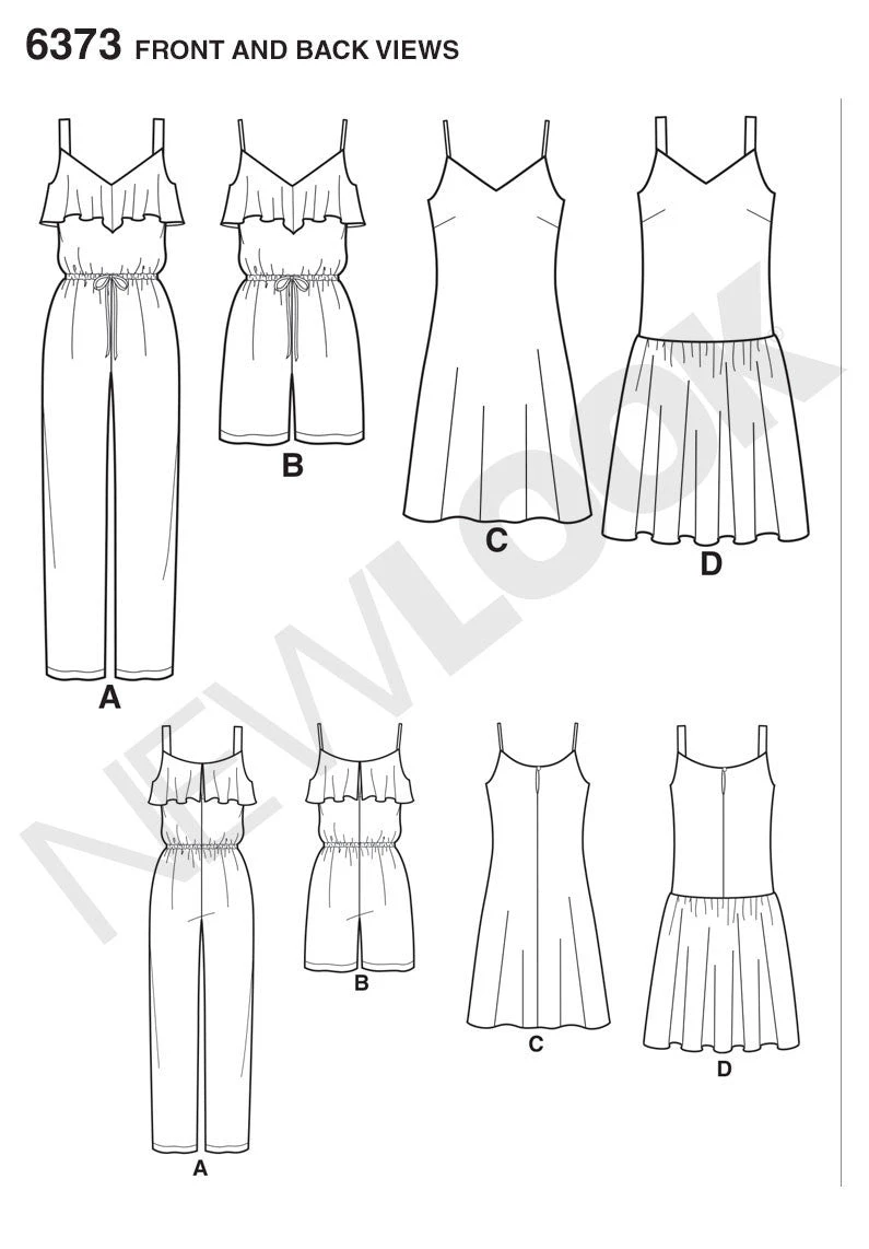 Misses’ Easy pattern includes long jumpsuit and drop waist dress with thick straps, short romper and slip dress with thin straps. New Look 6373 sewing pattern.