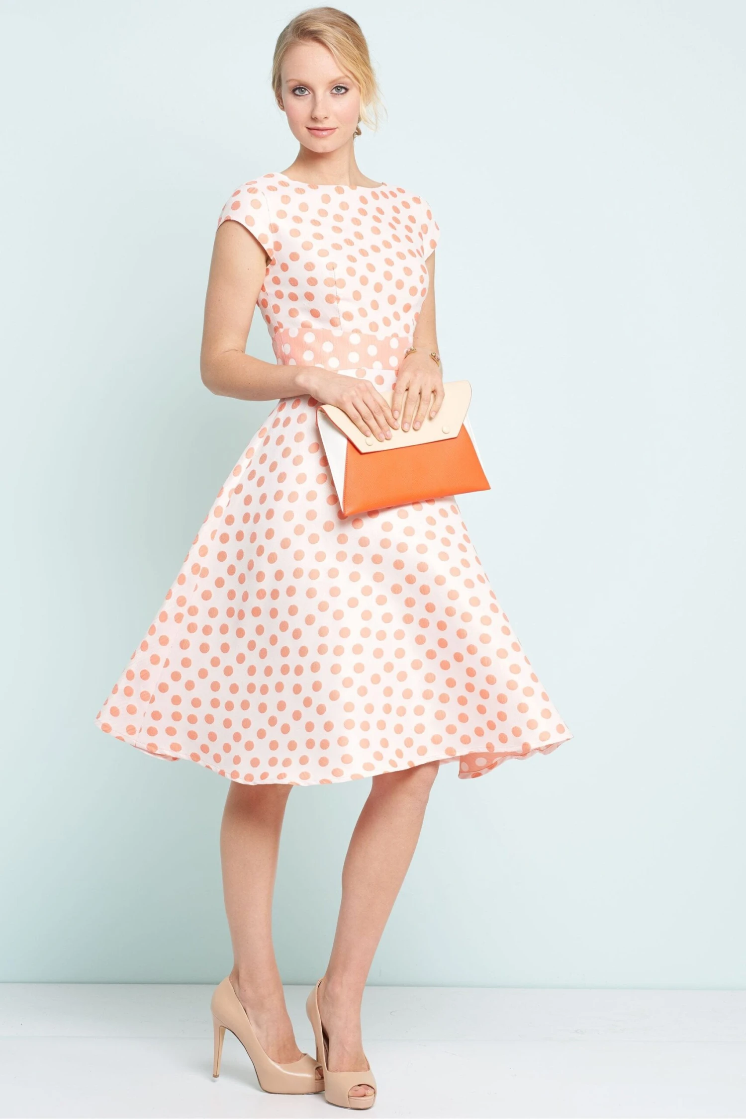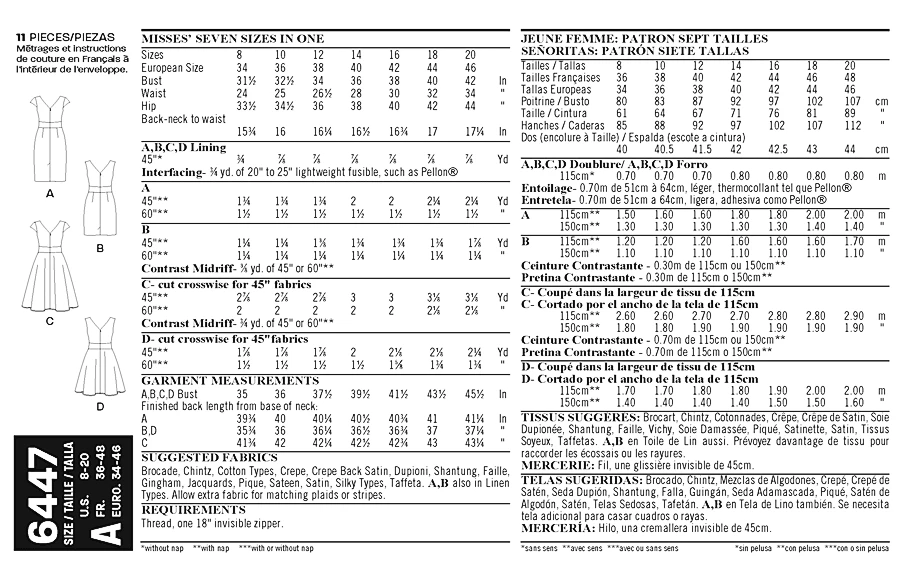Misses’ dress with full or slim skirt, each in two lengths – above the knee or knee length. Shaped waistband can be made in contrasting fabric. Back v-neckline and zipper. New Look 6447 sewing pattern.