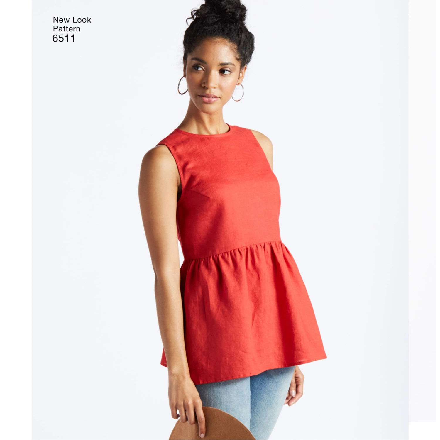 Women’s tops with ruffle includes mini dress, tunic, top and cropped top without ruffle. Tops have cut in sleeveless or cap sleeves and button with elastic loop closure at back neck opening. This New Look Sewing Pattern is easy to sew. New Look 6511 Sewing Pattern.