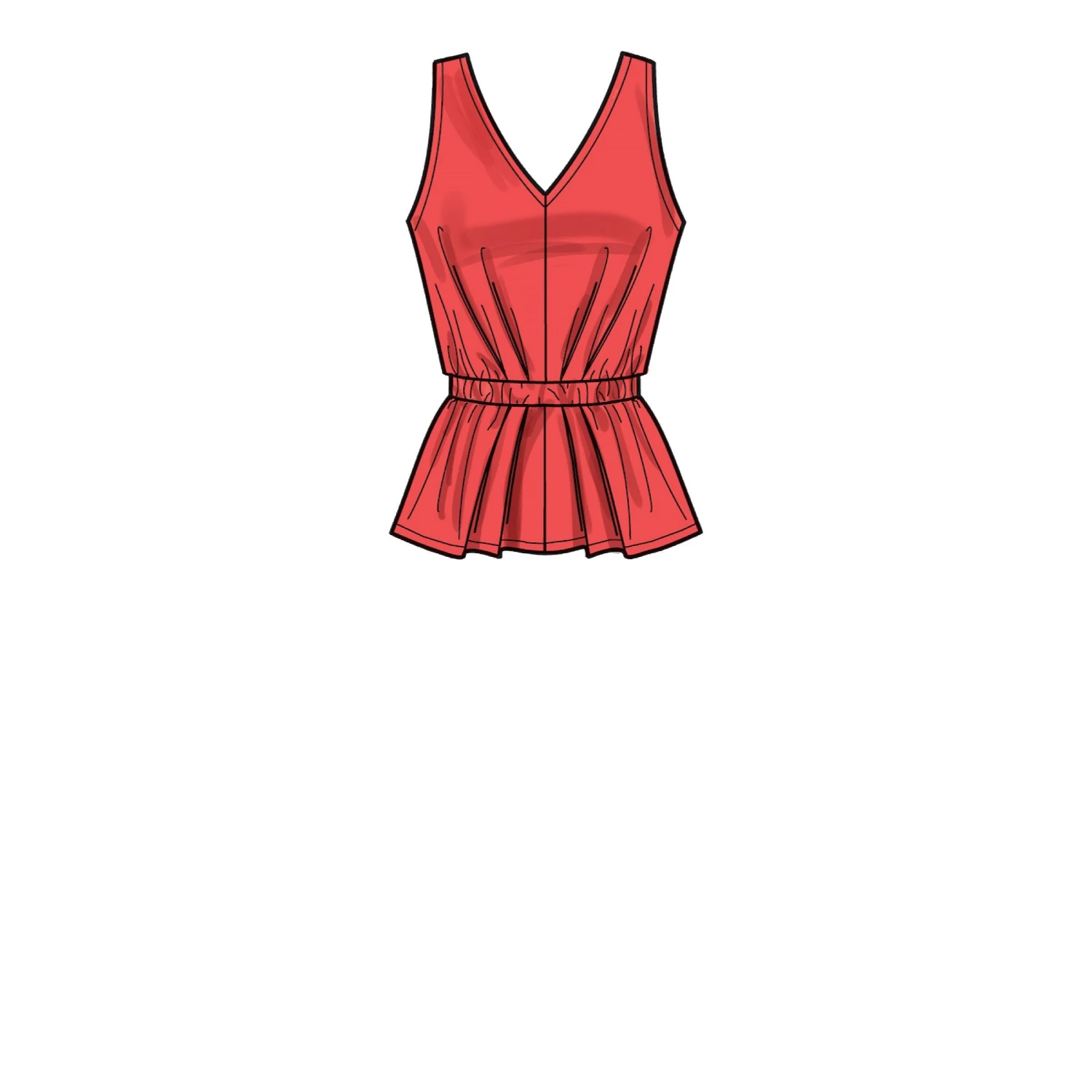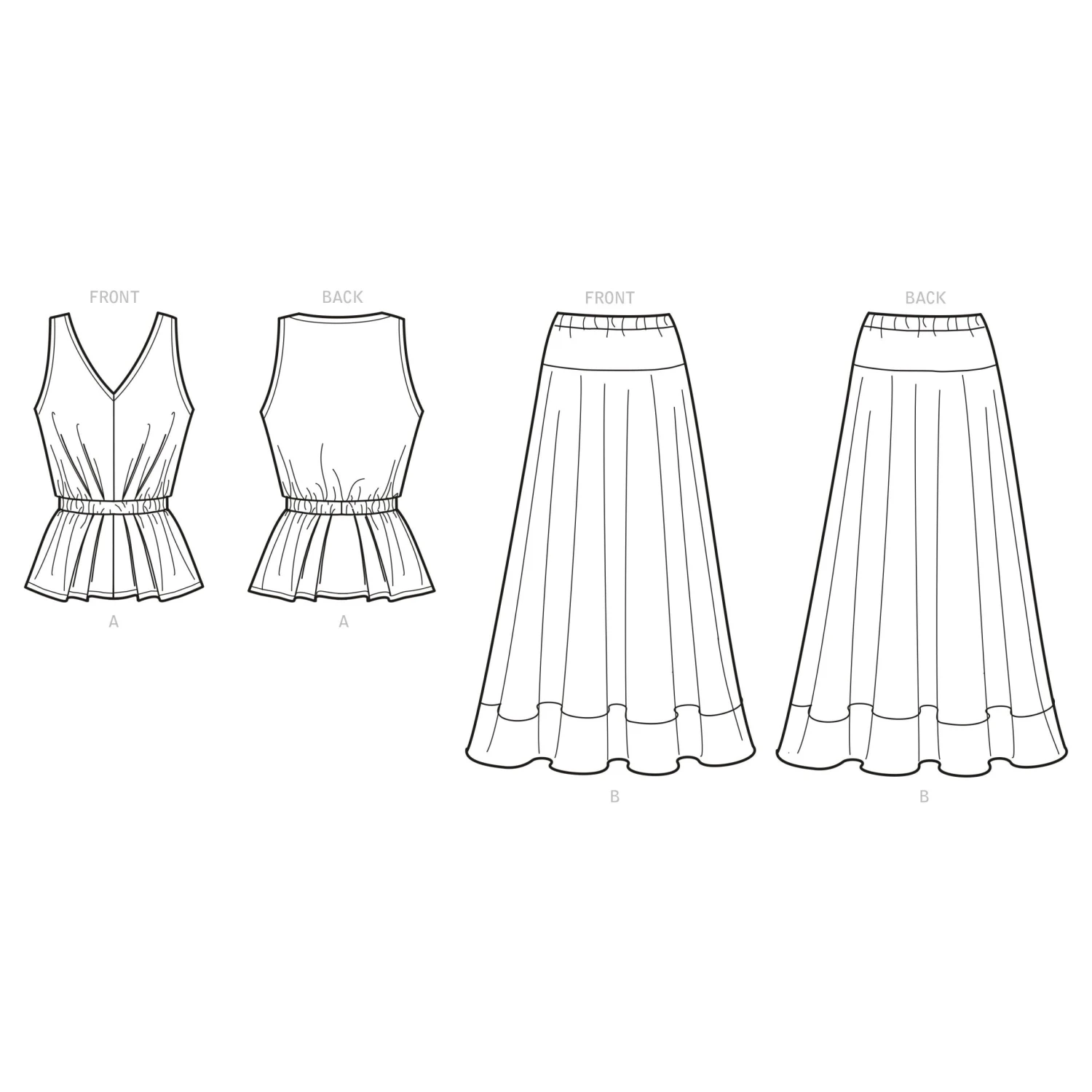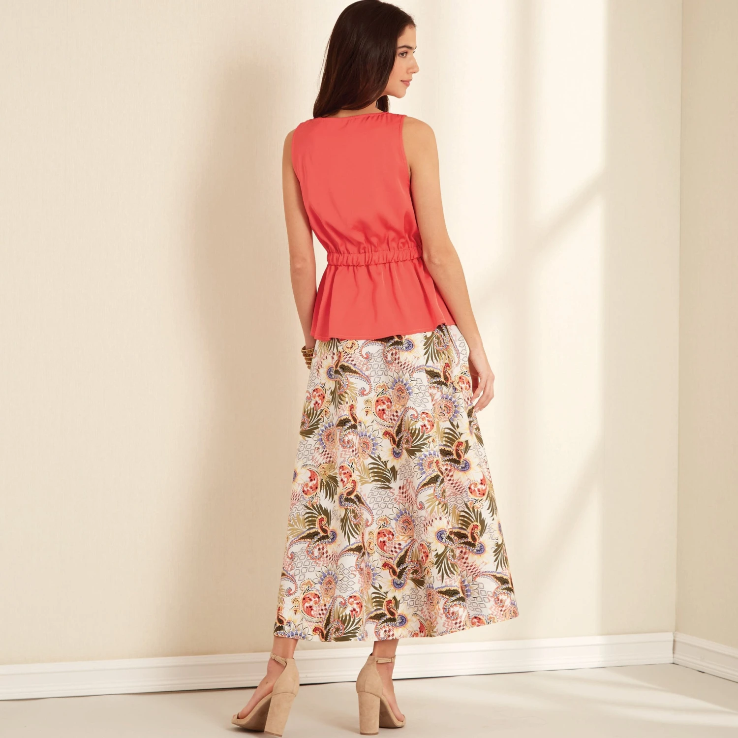 Sewing pattern for Misses’ pull-on V-neck Top with elasticated waist. Pull-on, flared skirt has bias yoke and wide hem.