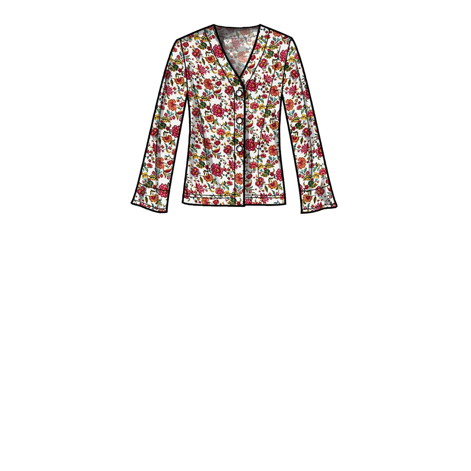 New Look Easy to Sew Pattern. Misses’ knits only V-neck cardigan in two lengths has long sleeves with hem bands and pull-on ankle length flared pants.