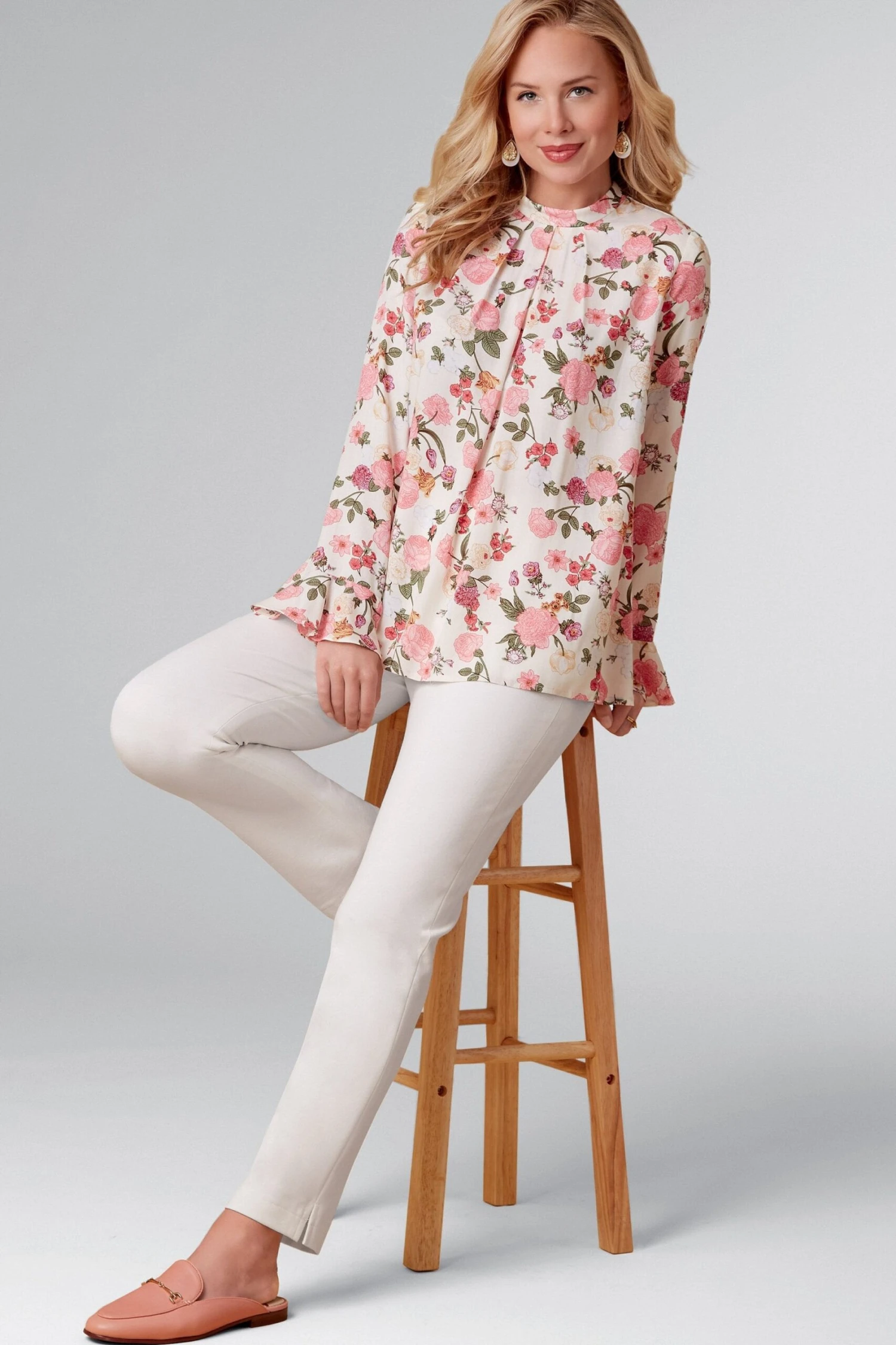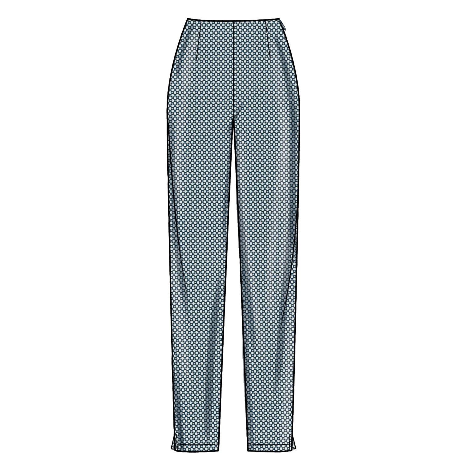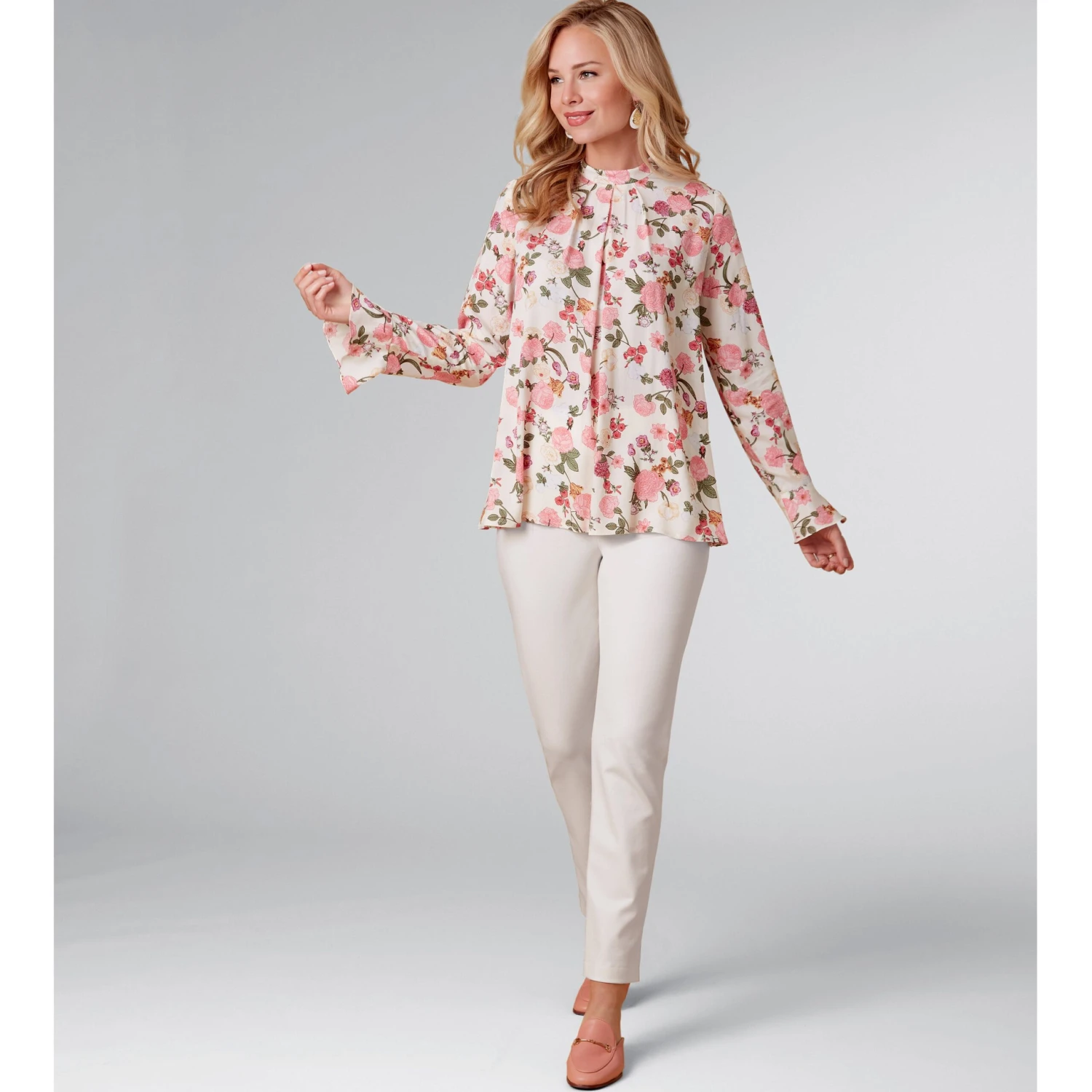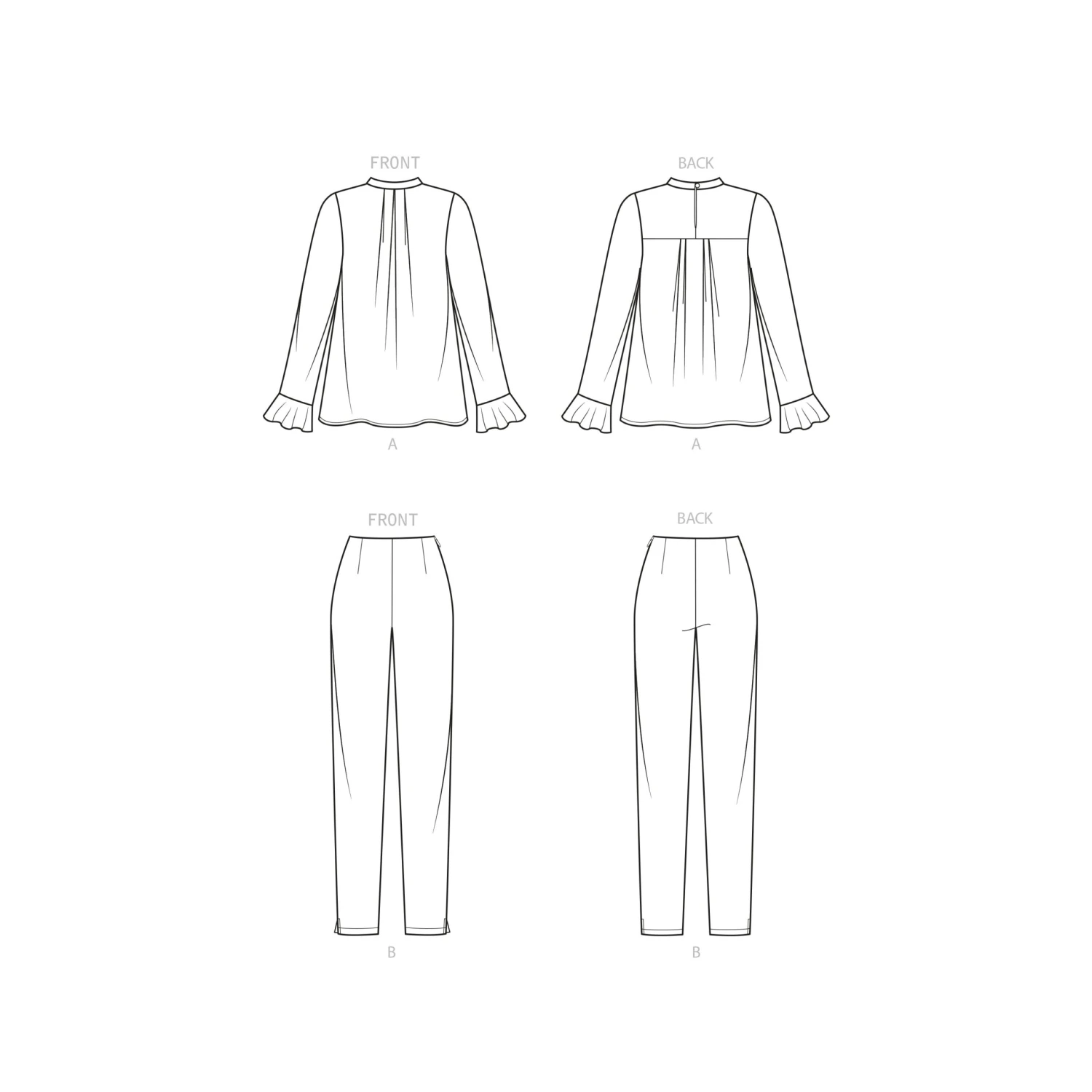 New Look pattern. Pleated top has neck collar, front and back pleats. Back yoke has keyhole opening with button closure. Sleeves flounce at hem. Slim fit ankle length pants with opening at hem on side seams. Invisible zipper in side seam, front and back darts.