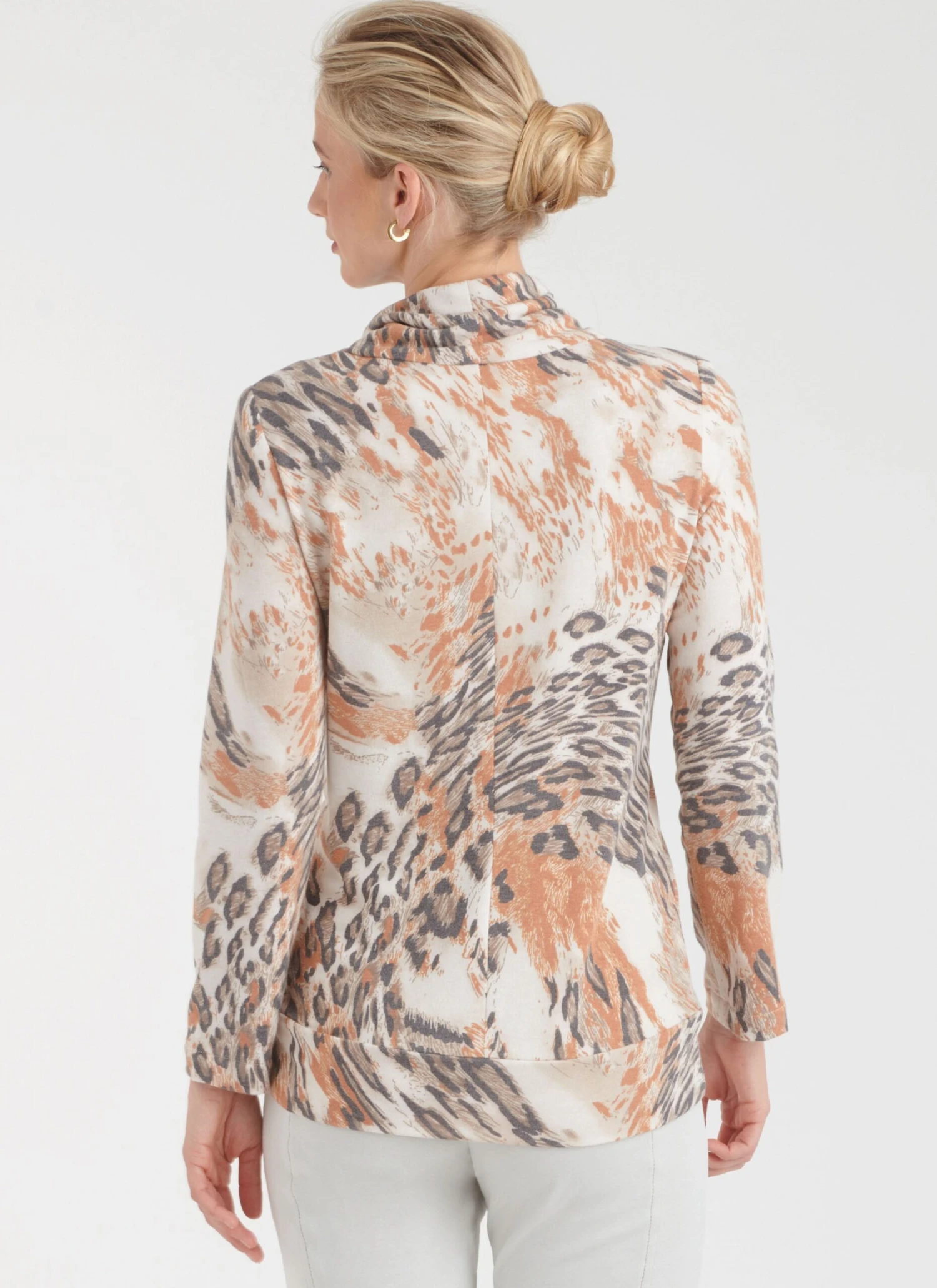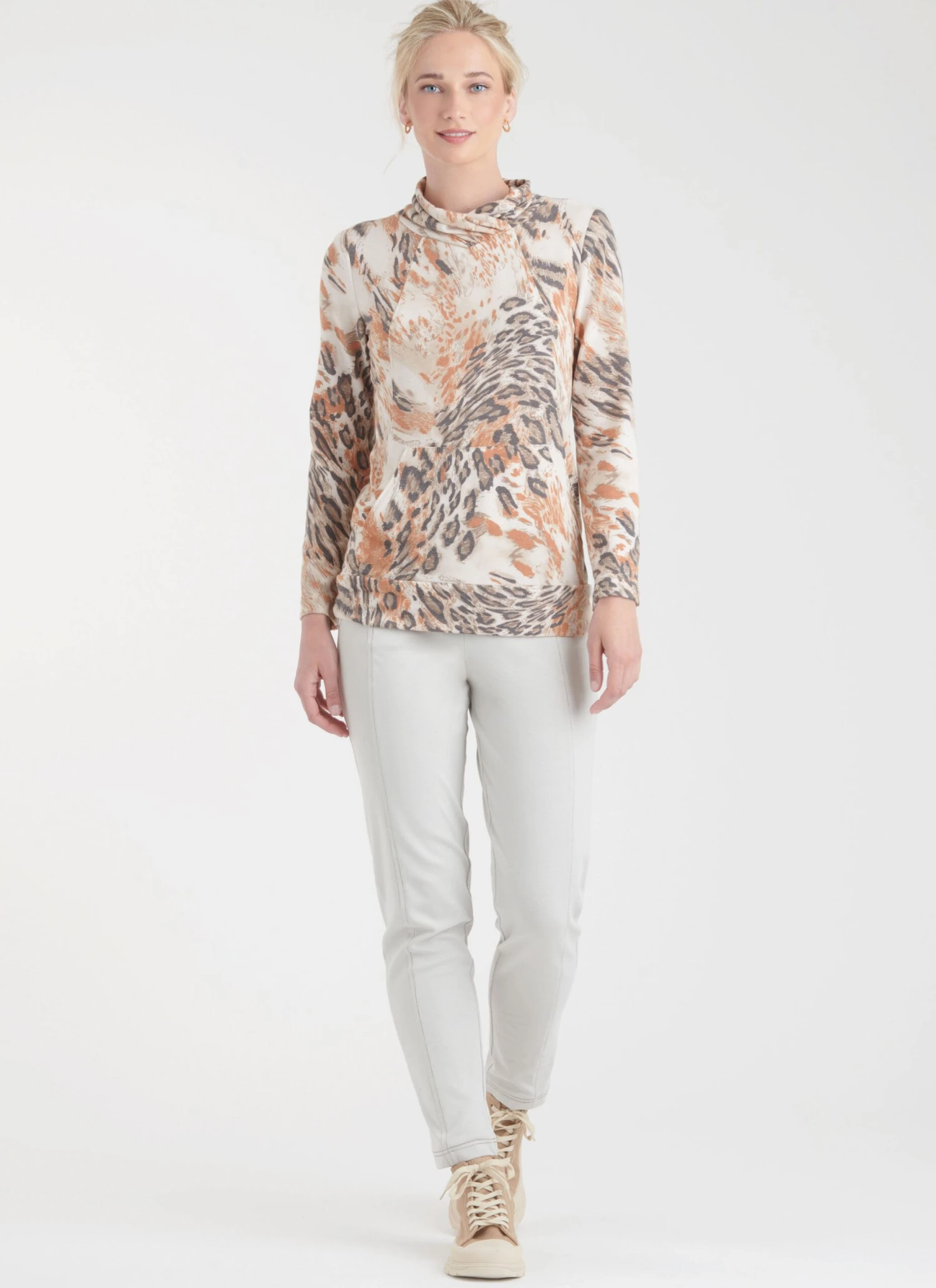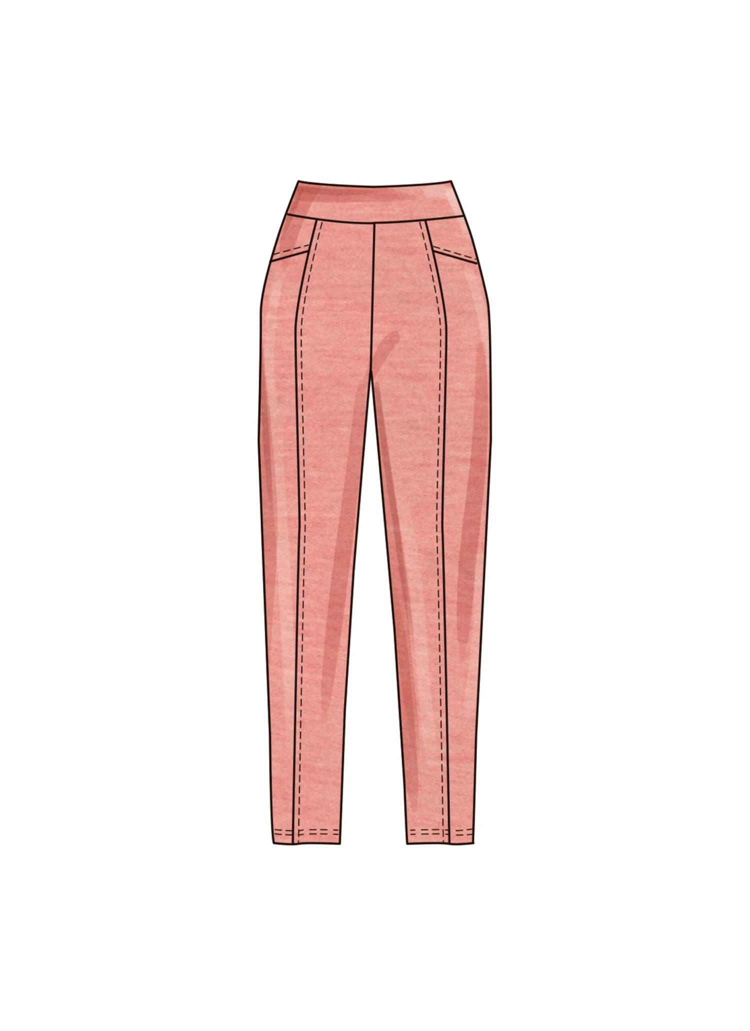 New Look Easy to Sew Pattern for Long sleeve top has princess seams, lapped collar, and low front pocket. Pull-on pants have elasticized waist and seaming details.