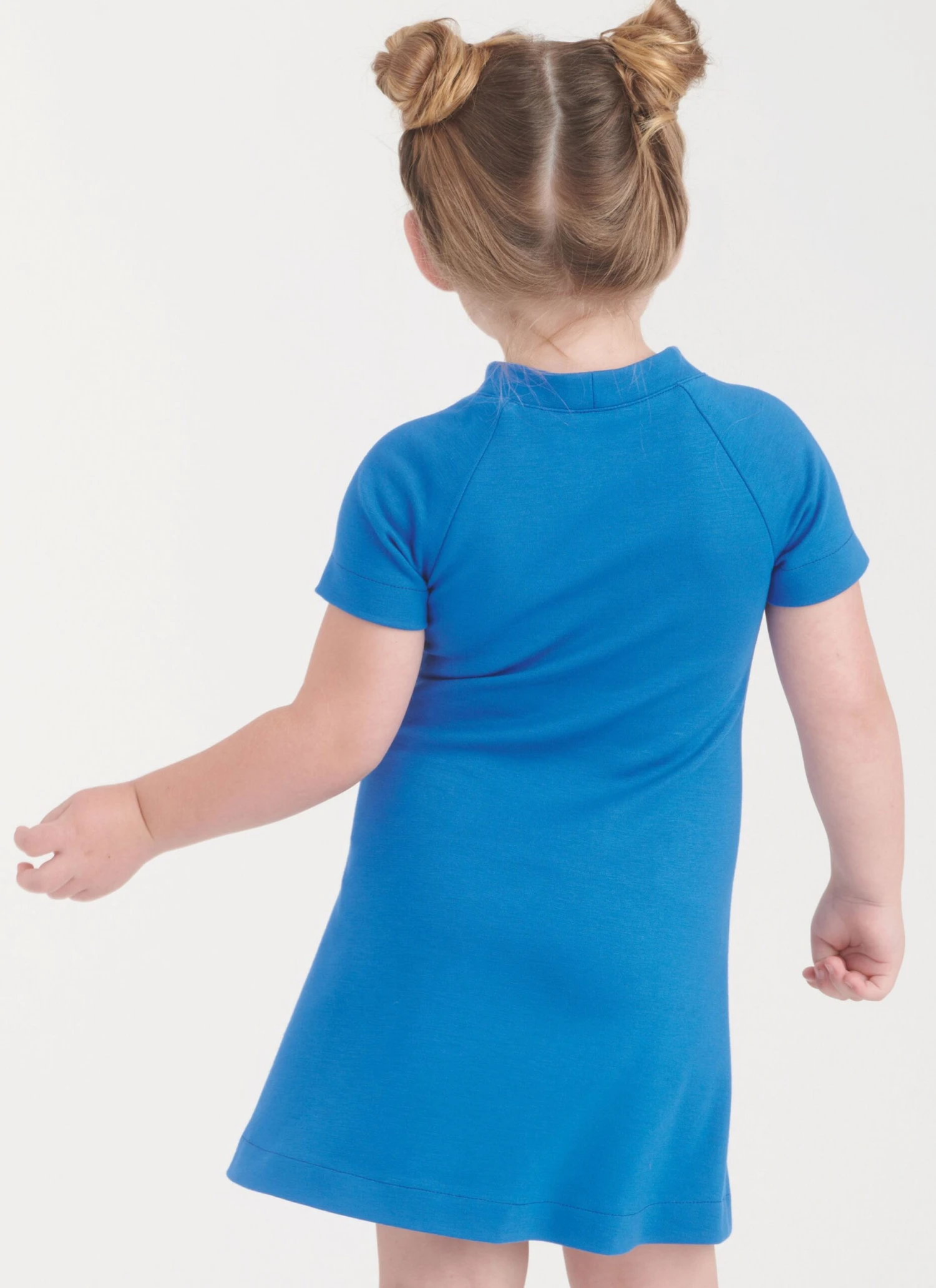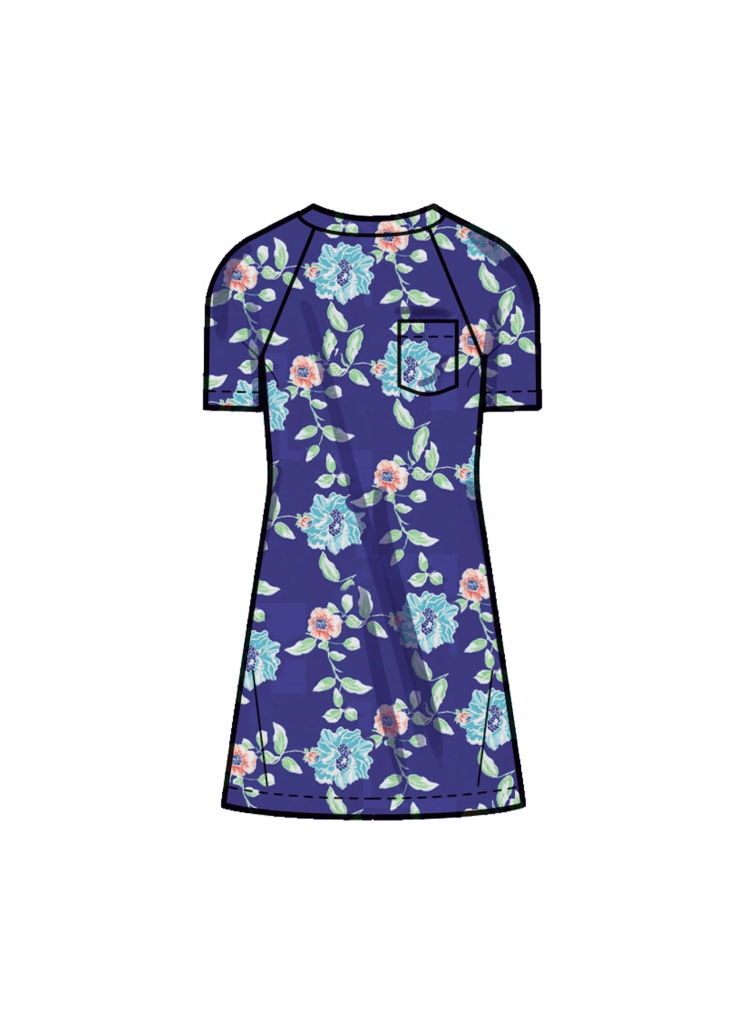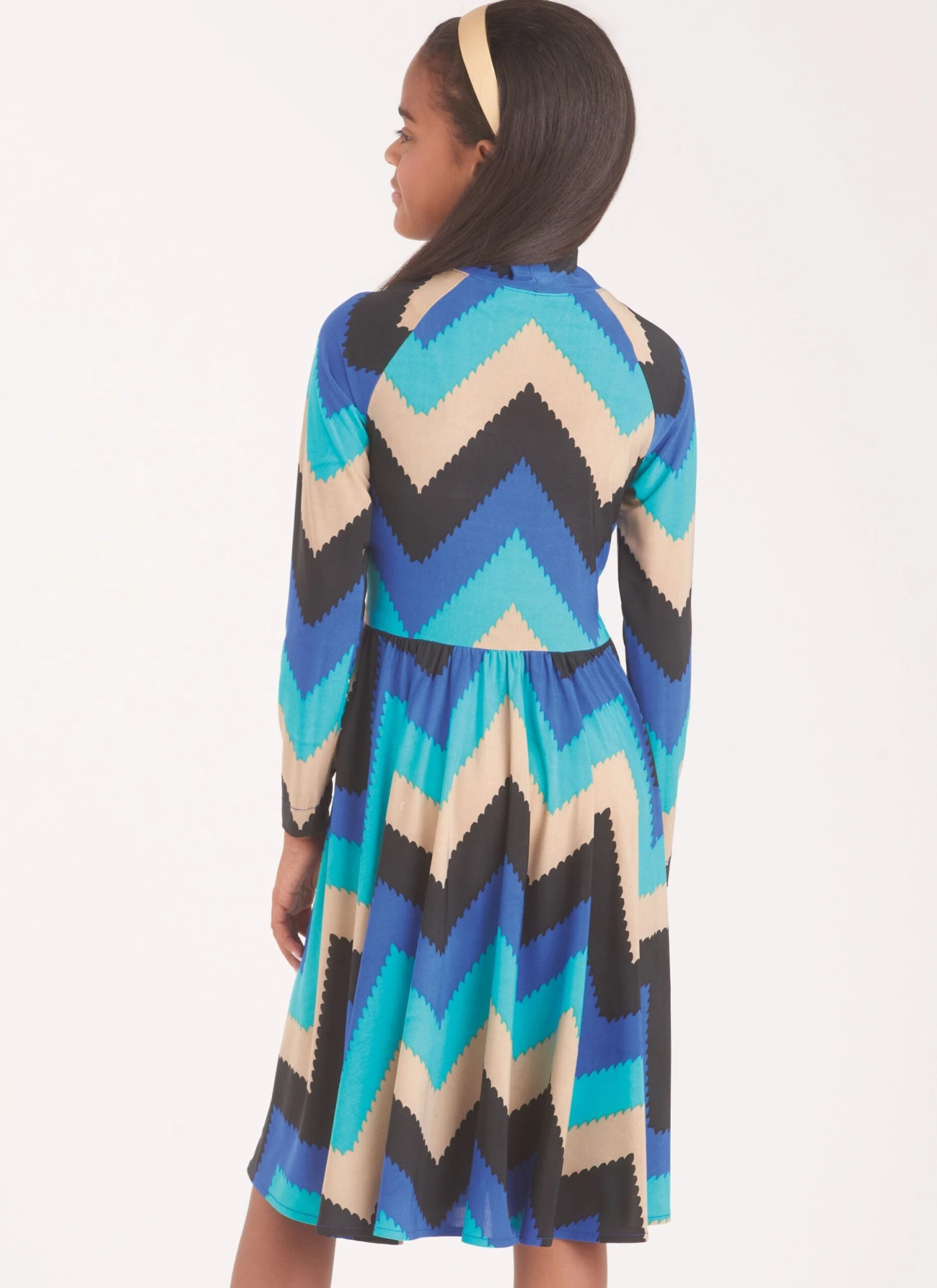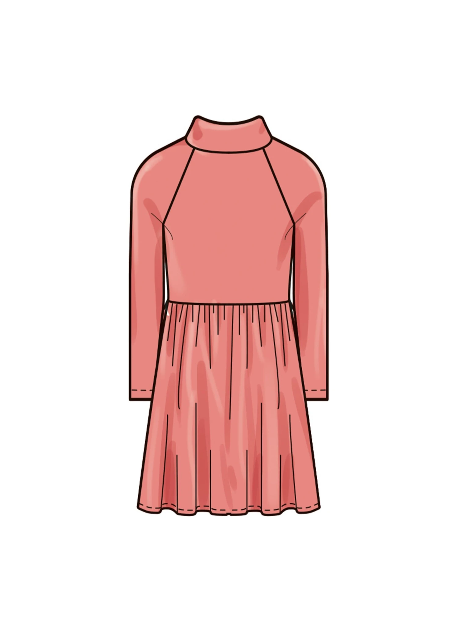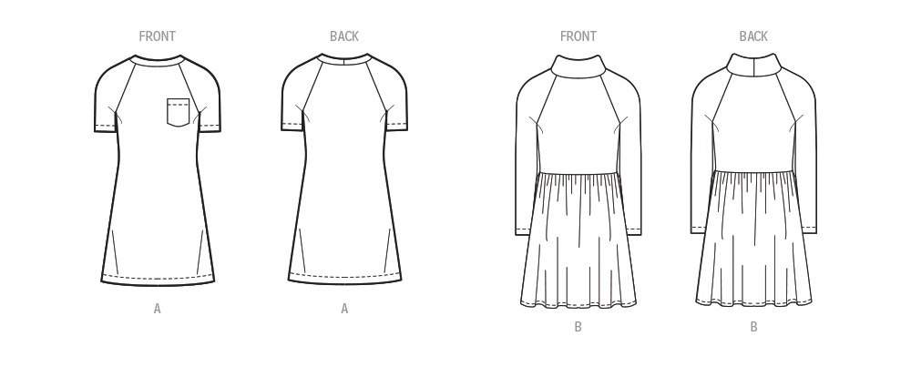 New Look Easy to Sew Pattern for Easy to sew children’s and girls’ dresses. Dress A has a front patch pocket and short raglan sleeves. Dress B features gathered skirt and long raglan sleeves.