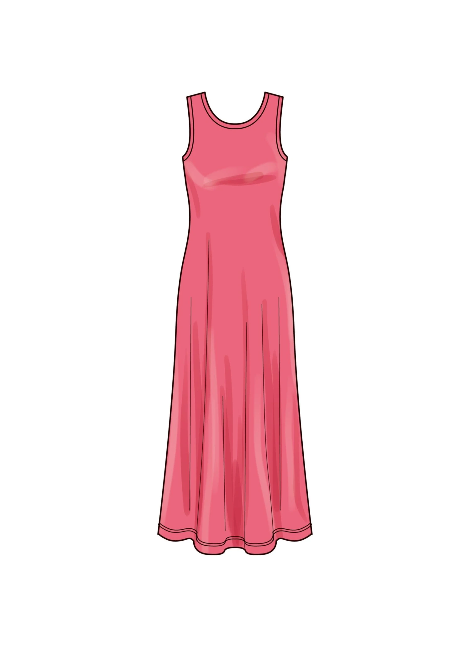 New Look sewing pattern for Easy to sew sleeveless pullover dress sized for stretch knits only has scoop neckline in maxi or short lengths.