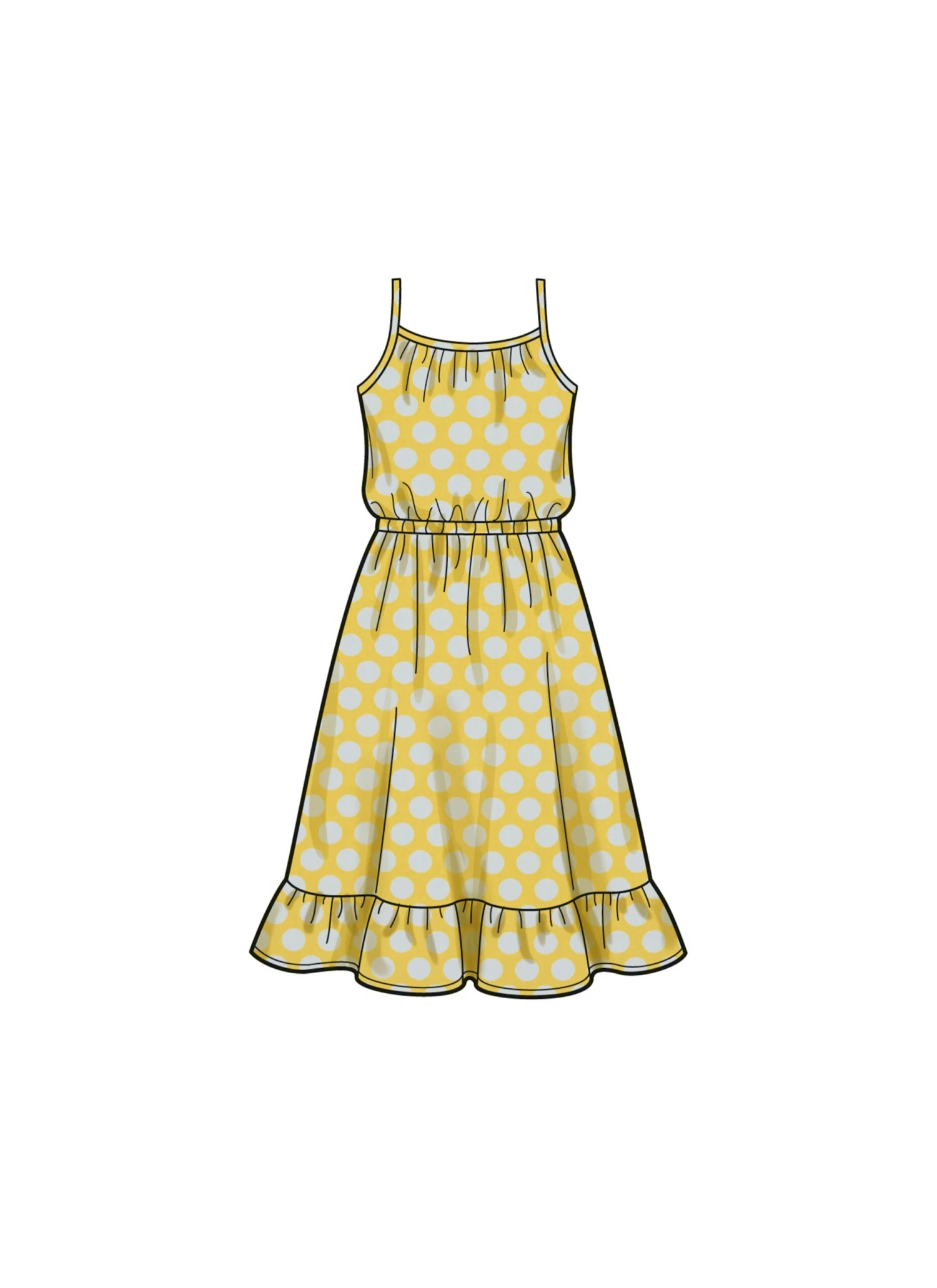 New Look sewing pattern for Create this adorable pull-on jumpsuit with pockets or sundress with bottom ruffle.