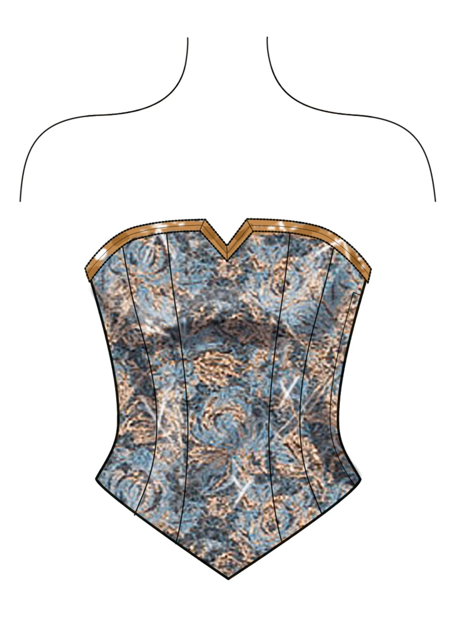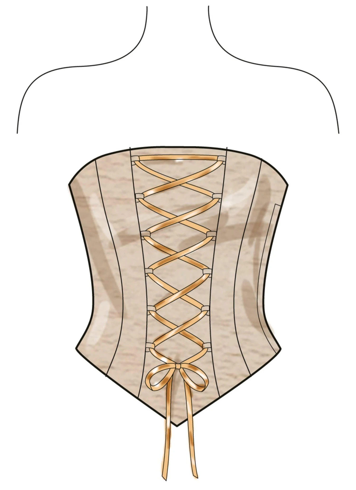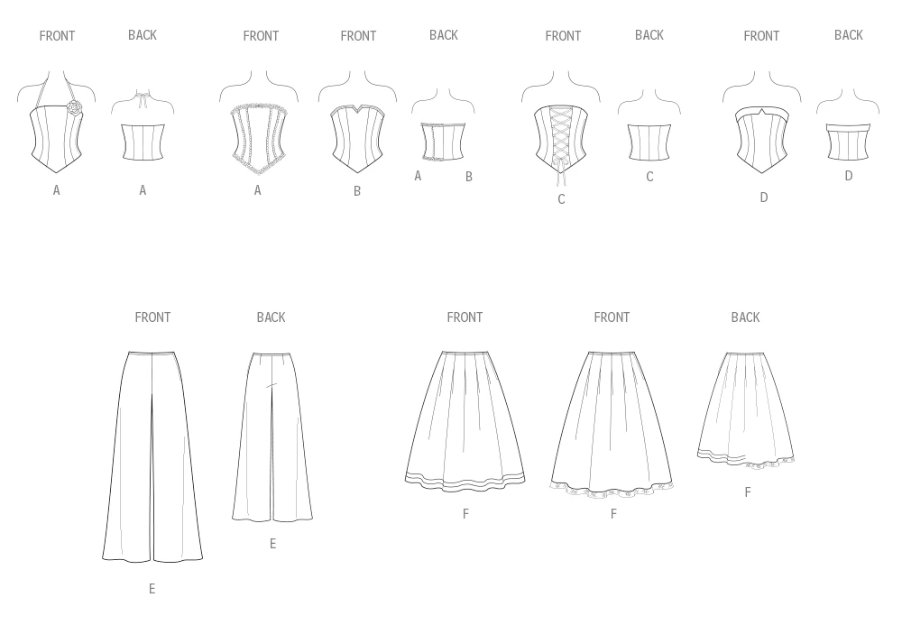 New Look Sewing Pattern for Corsets have neckline and trim variations, boning and side zipper closure. Pants and pleated skirts have side zipper closure. Skirts have optional trim.