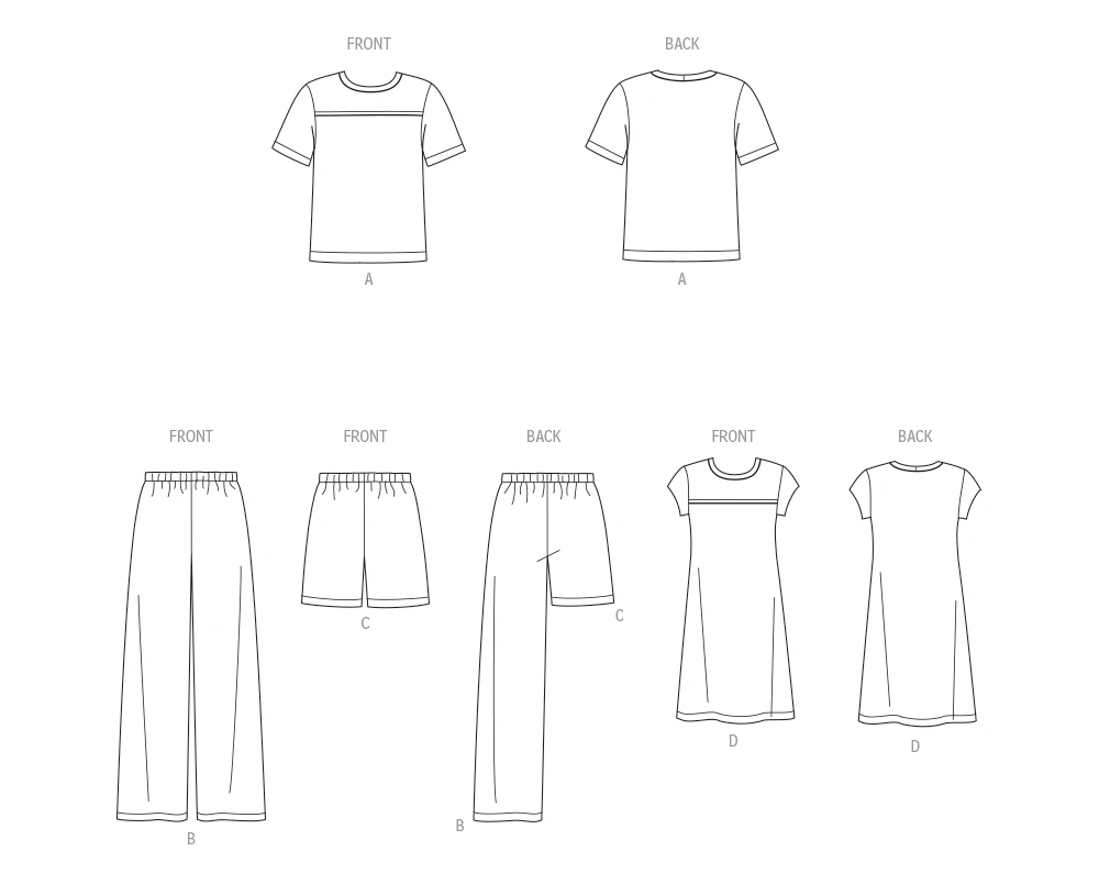 Fabric Suggestion : A,D sized for stretch knits only such as: Cotton Interlock, Jerseys, Lightweight Double Knits, Two-way stretch. See Pick-A-Knit® Rule. B,C also in Baby Cord, Chambray, Cotton and Cotton Blends, Flannel, Gingham, Laundered Cottons.