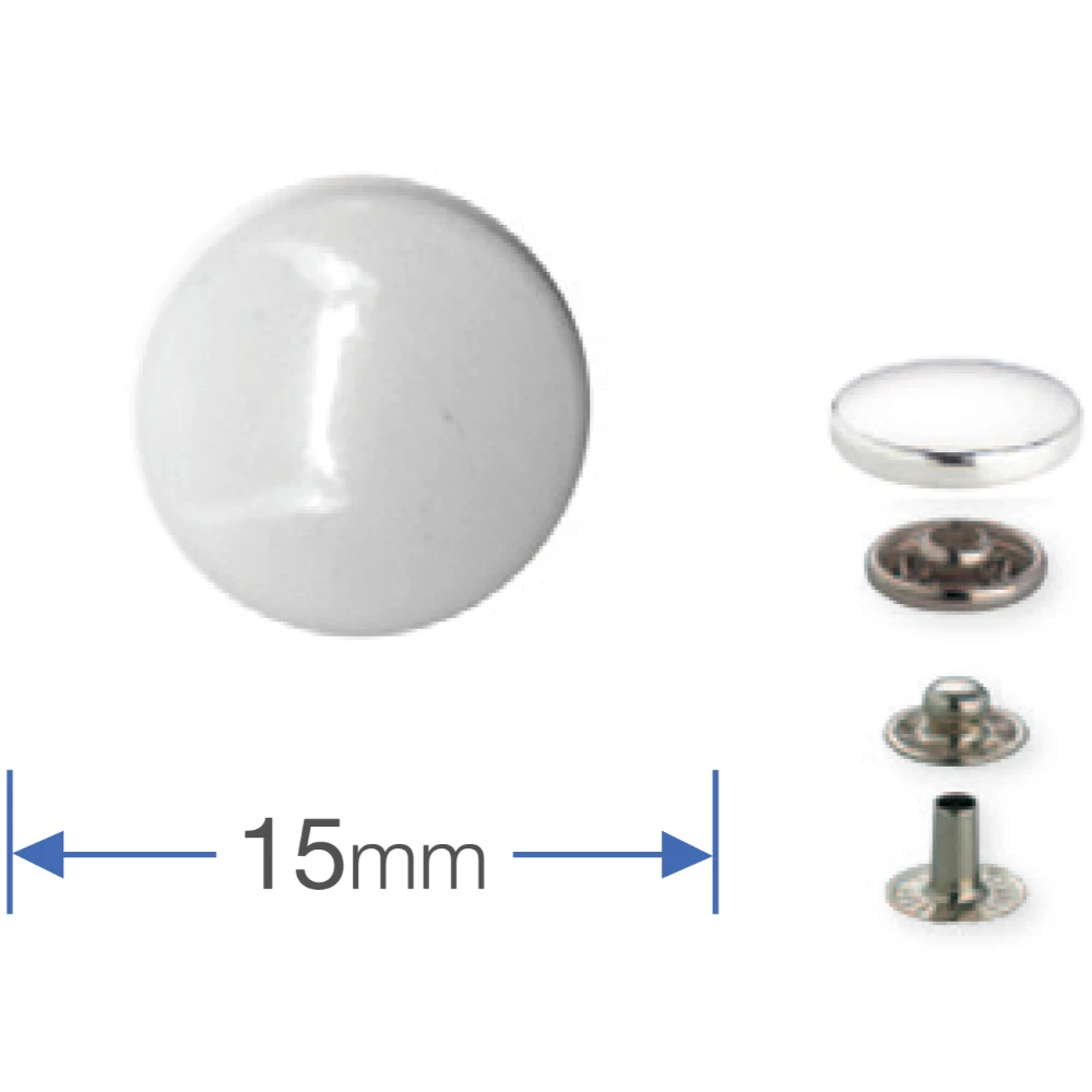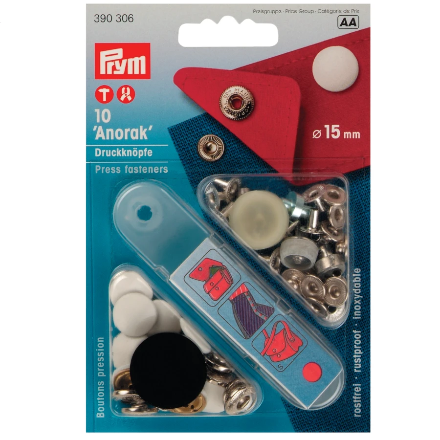 This pack of 10 Prym ‘Anorak’ non sew press fasteners are a neat solution for jackets, anoraks, dresses, skirts and fine leather. In White colour and 15mm size, these fasteners have a medium fastening strength and feature the signature ‘S-Spring’ design by Prym, ensuring smooth and easy opening and closing since 1903. No sewing is necessary, as the fasteners are riveted for a simpler and more durable attachment.