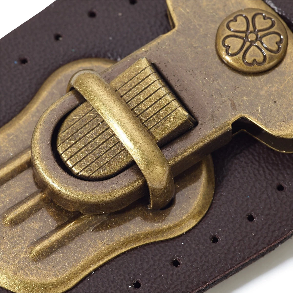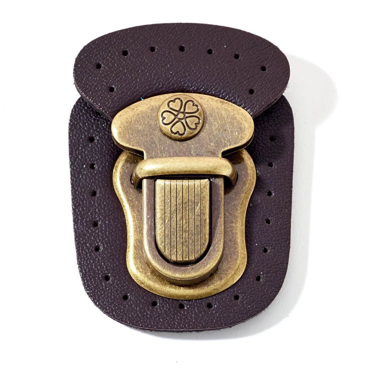 A timeless bag fastening, the tuck lock adapts to various designs – from vintage to modern casual style. The tuck lock consists of two parts: The lower part is located on a genuine, dark brown imitation leather sew-on plate, the top part is also fixed to a sew-on plate. Both parts have pre-punched holes for easy sewing. The clip buckle is made of corrosion proof, brushed metal with narrow longitudinal grooves and has an attractive round, decorative detail on the front.
