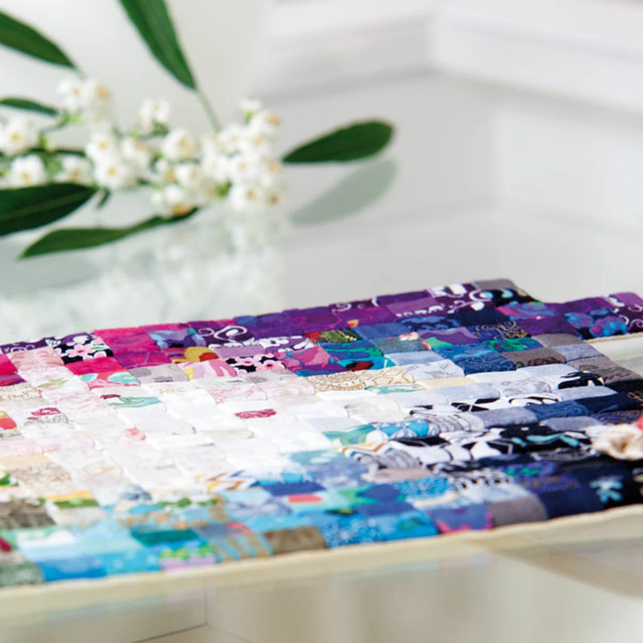 1. Cut the fabrics in squares using a rotary fabric cutter. Arrange the design on the Quilter’s Grid (adhesive facing up) and iron on dry with light pressure for 10–12 seconds.