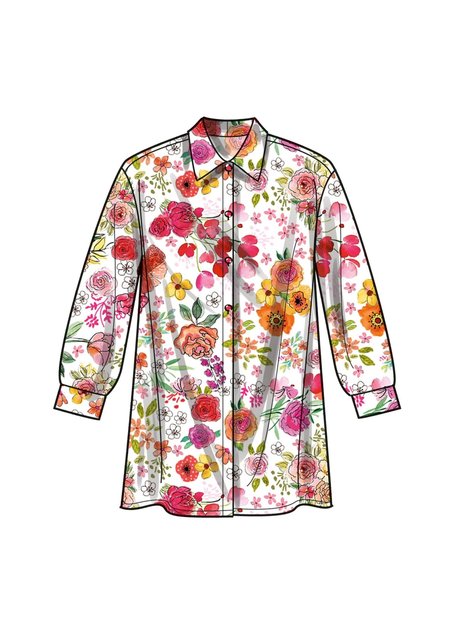 Simplicity Sewing Pattern for Relaxed fit button front shirt in two lengths features yoke, collar, and buttoned cuffs. Views A and C have side seam pockets.