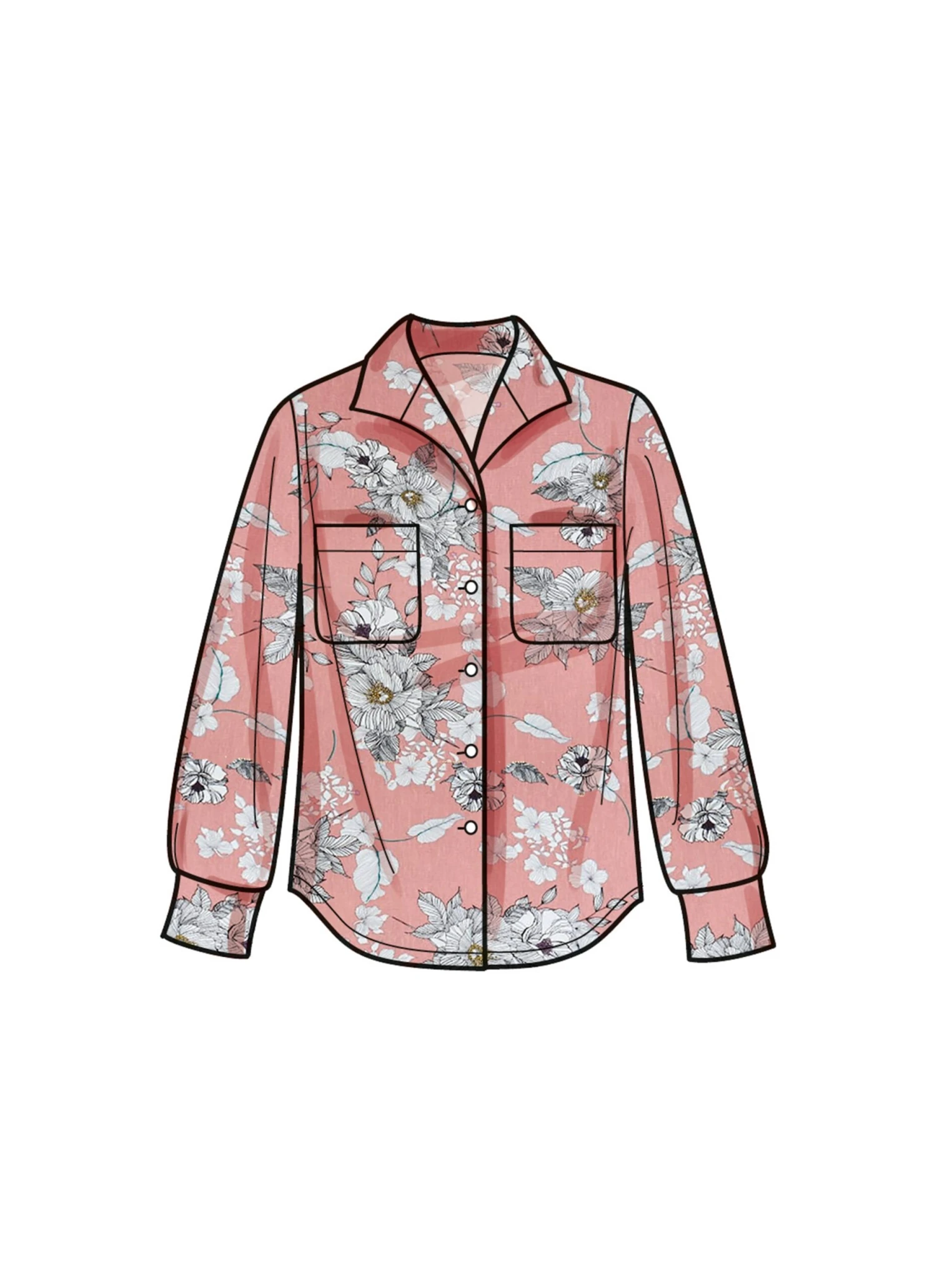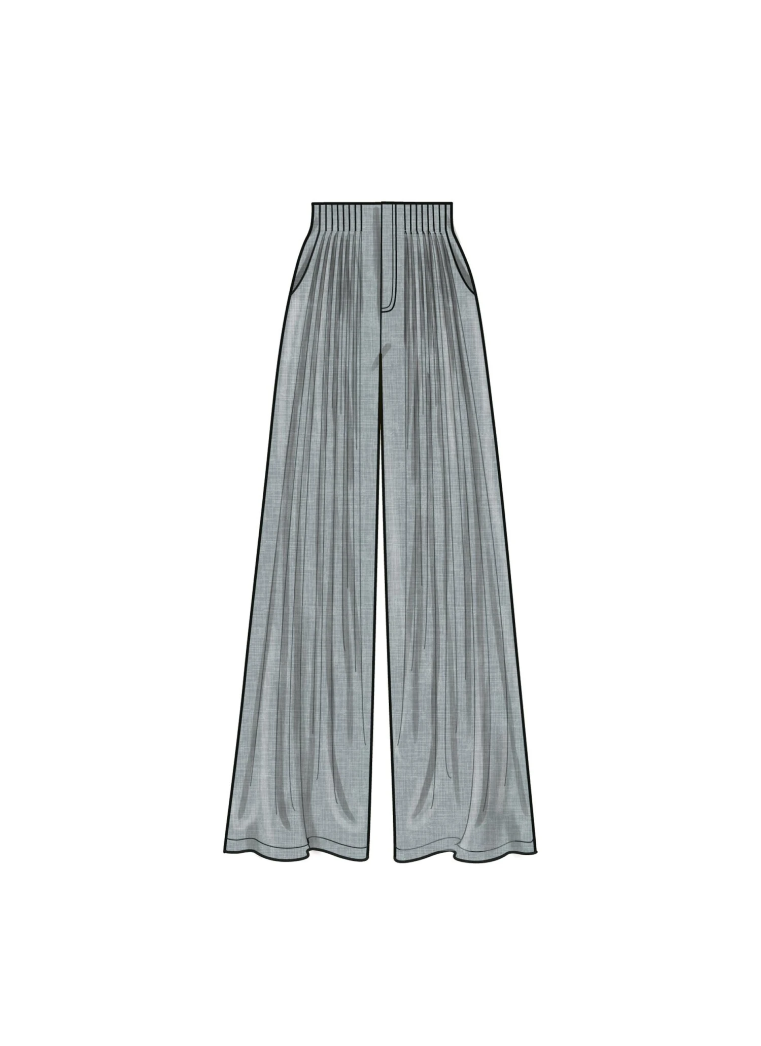 Simplicity Sewing Pattern for Short or long sleeve button down shirt and high waisted wide leg pants with cutting line for shorts have pleats, pockets and fly front opening.