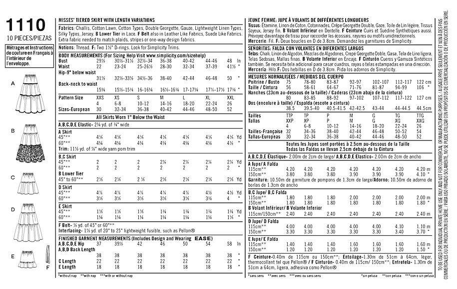 This Easy-to-Sew skirt for misses’ can feature three tiers with yarn pom trim, lace overlay, or high low hemline, or two tiers in knee length or mini. Pattern also includes belt. Simplicity sewing pattern.