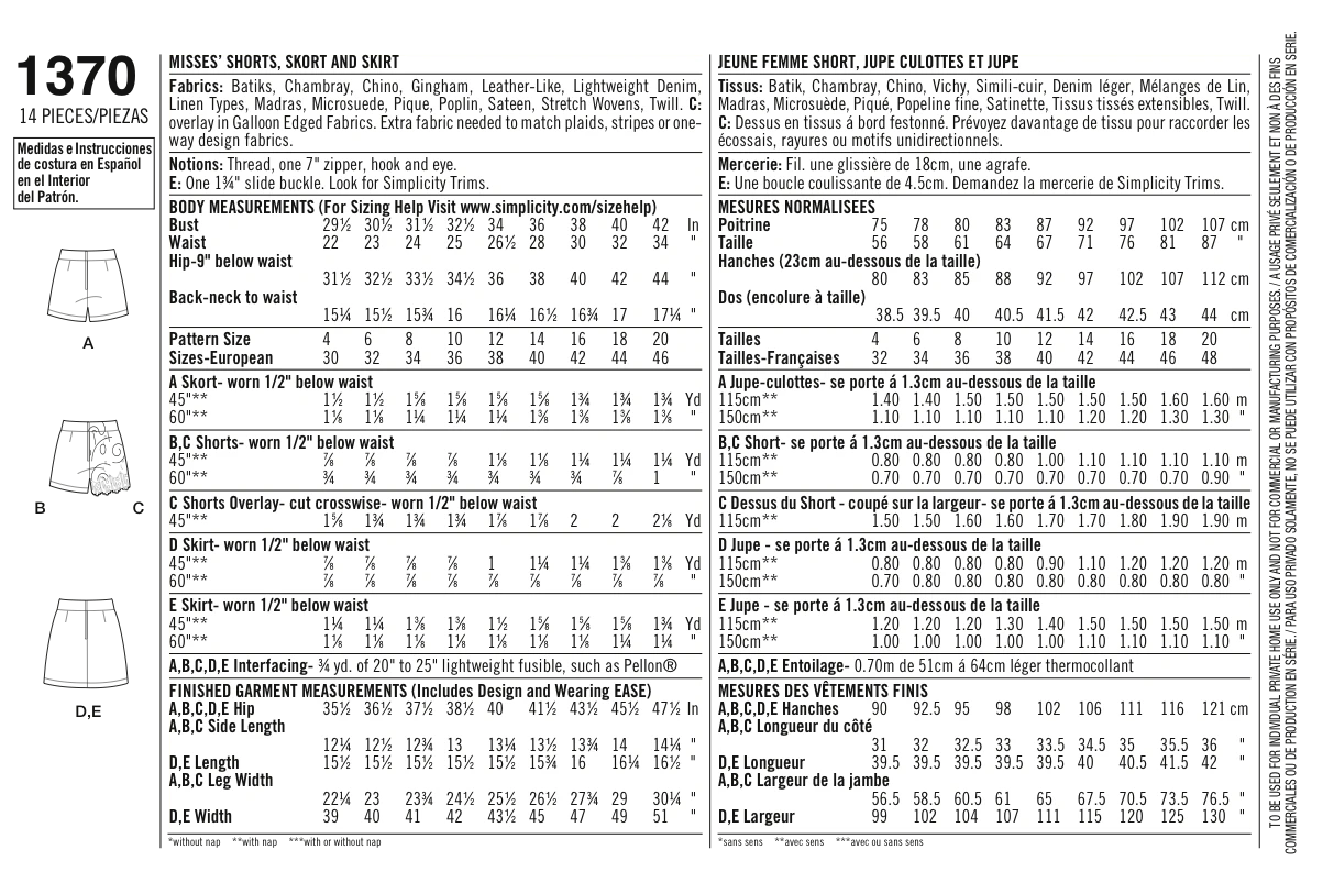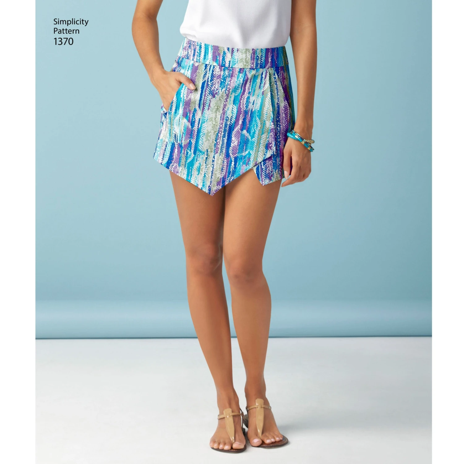 Misses asymmetric ‘skort’ with pockets or mini skirt with buckle, shorts with or without scalloped overlay and mini skirt are must haves for this season. All have back zipper. Simplicity sewing pattern by In K.