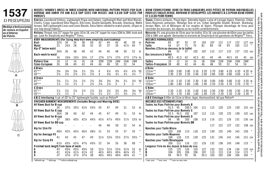 Misses’ & Plus Size dress in 3 lengths & sleeve variations. Individual patterns included for slim, average & curvy fit and cup sizes B, C, D for miss & C, D, DD for plus.