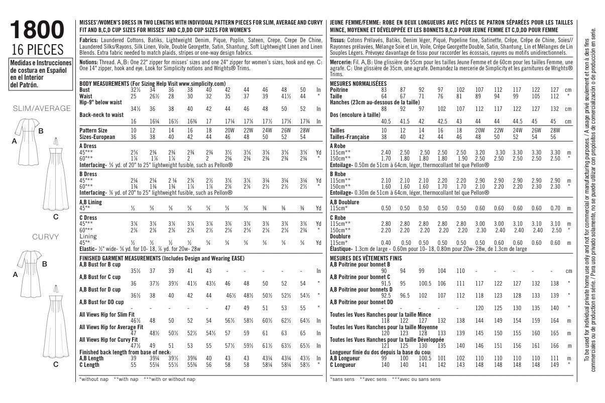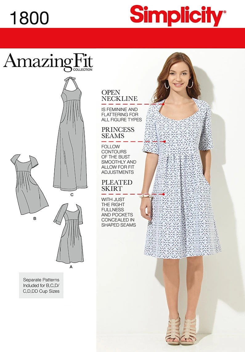 Misses’ & Plus Size dresses in two lengths with individual patterns for slim, average and curvy fit and B, C, D cup sizes for miss (size range 10-18) and C, D, DD cup sizes for plus sizes (size range 20-28). Amazing Fit Collection by Simplicity.