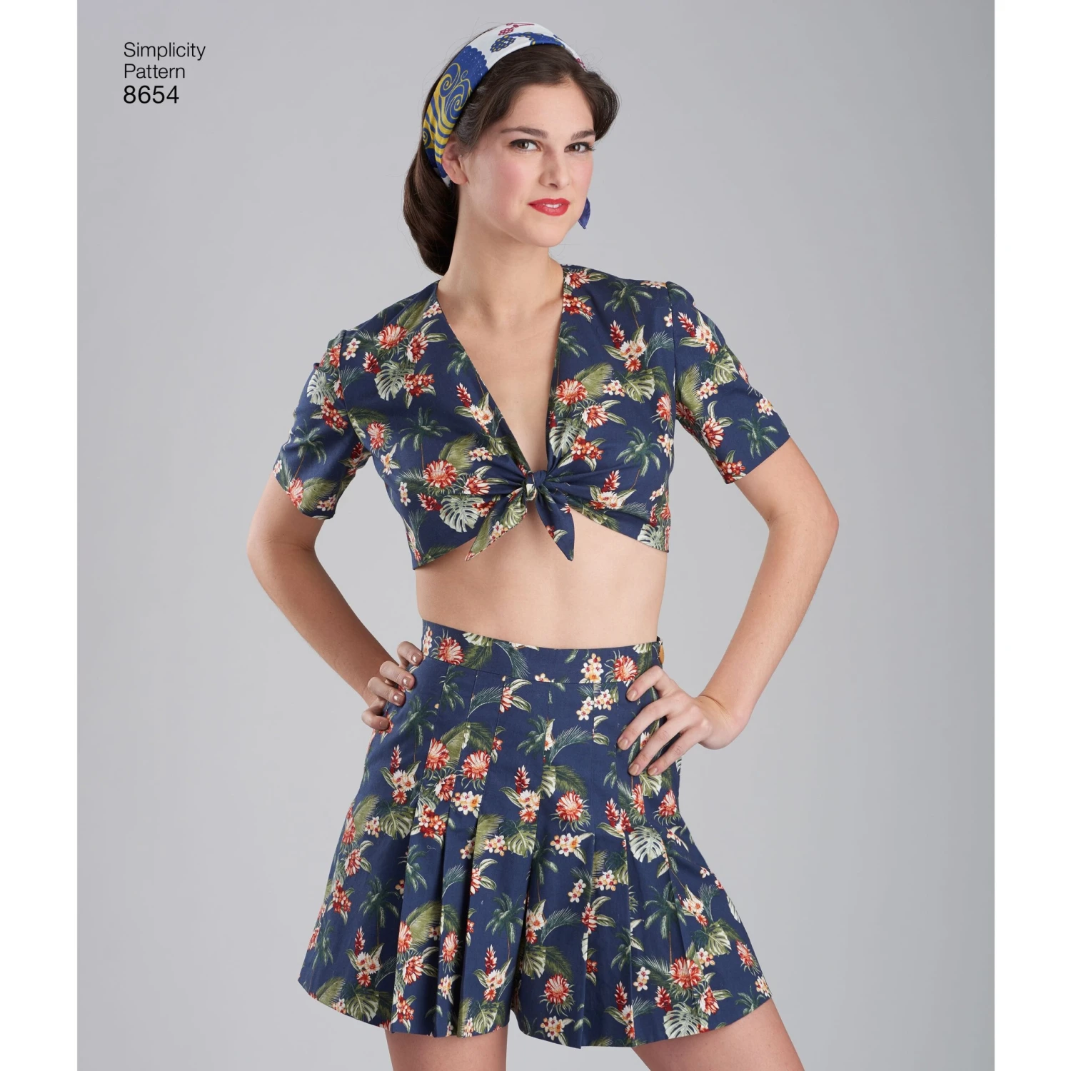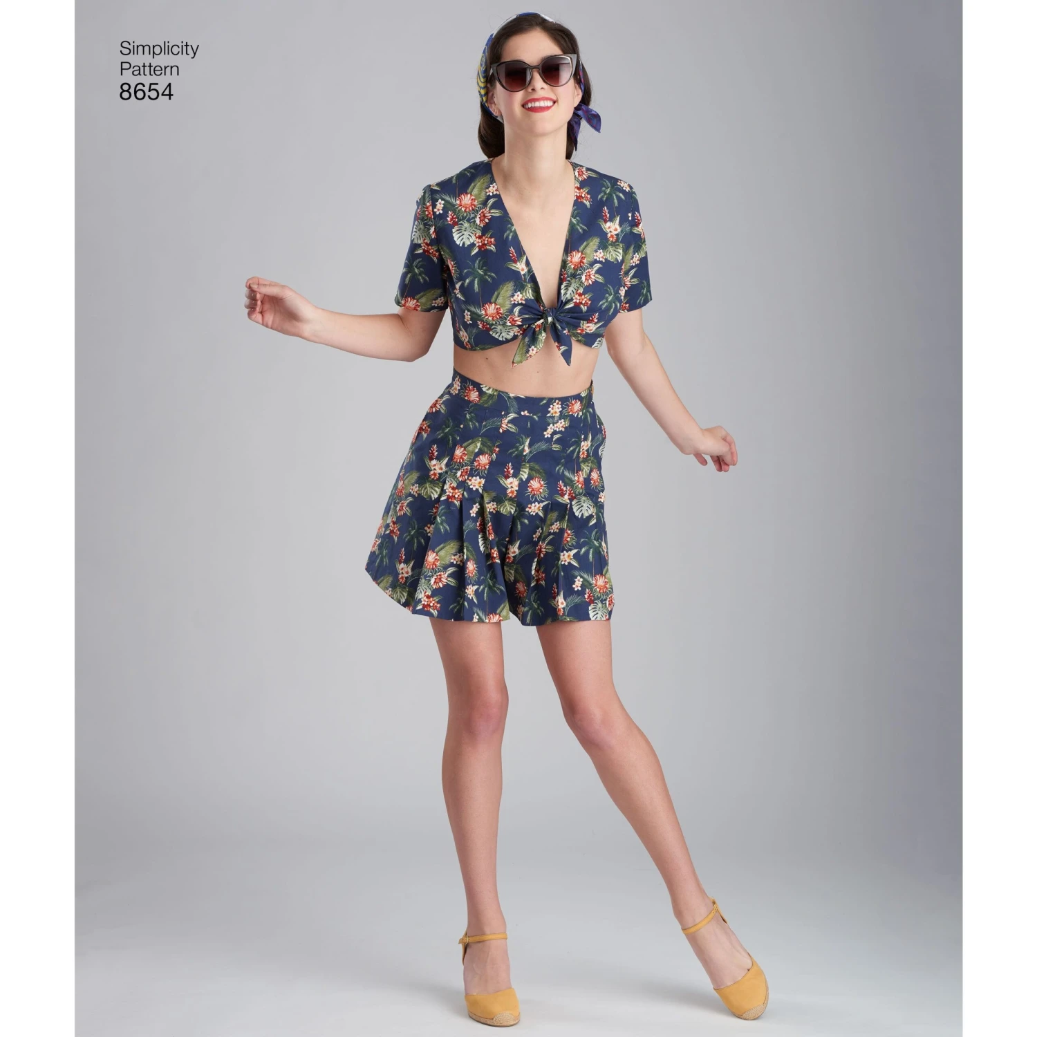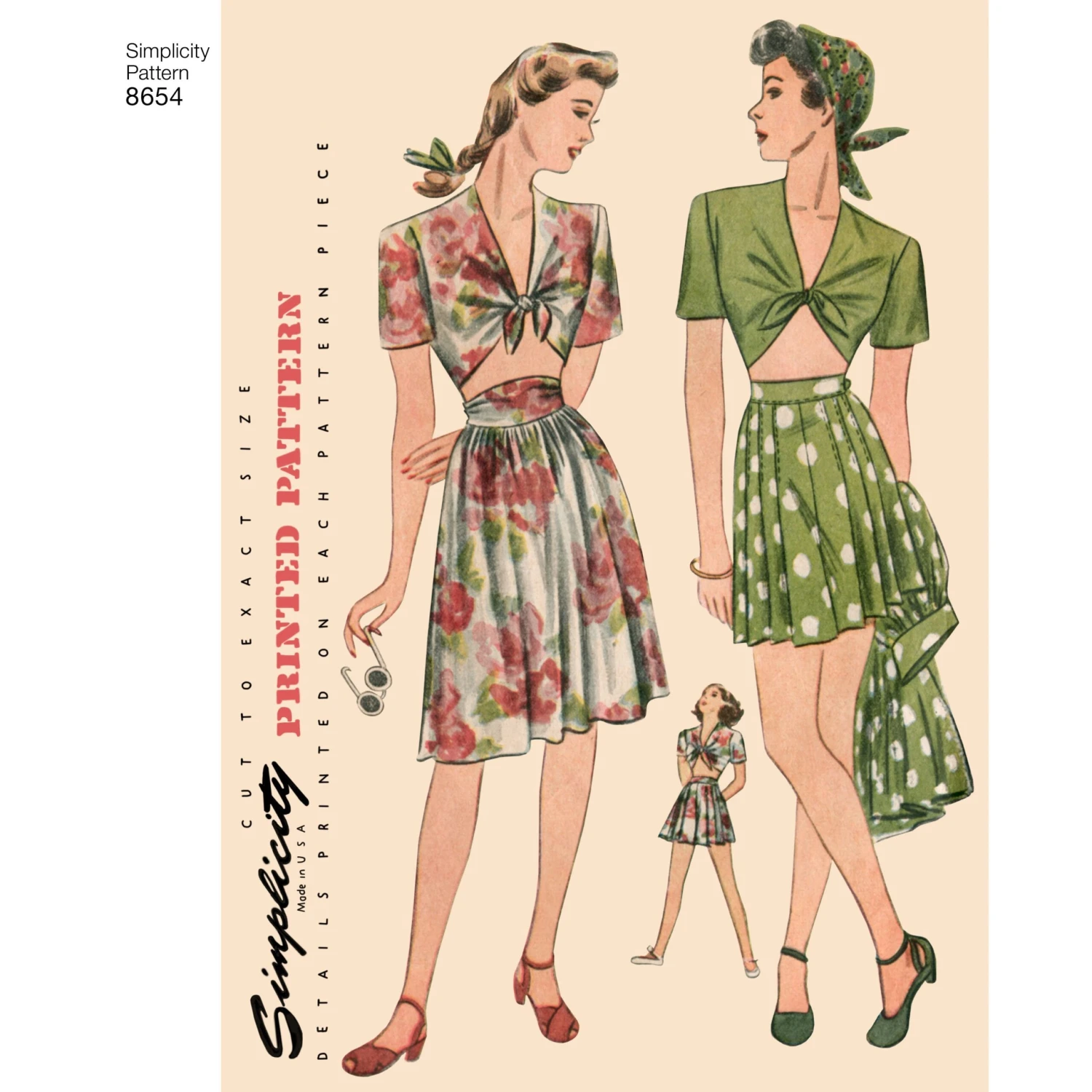 Simplicity 1940’s Vintage Pattern. The short sleeved top ties in a knot in front leaving a bare midriff. The shorts are smartly pleated in front and back and finished with a waist band. A shaped yoke, gathered at the sides, releases the soft fullness of the skirt.Â