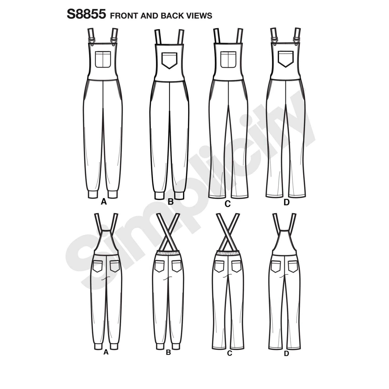 | Relax is style with this knit overalls for misses. Pattern feature kangaroo pocket detail with strap variations and can be made in bell or cuffed hem. Simplicity sewing pattern. |