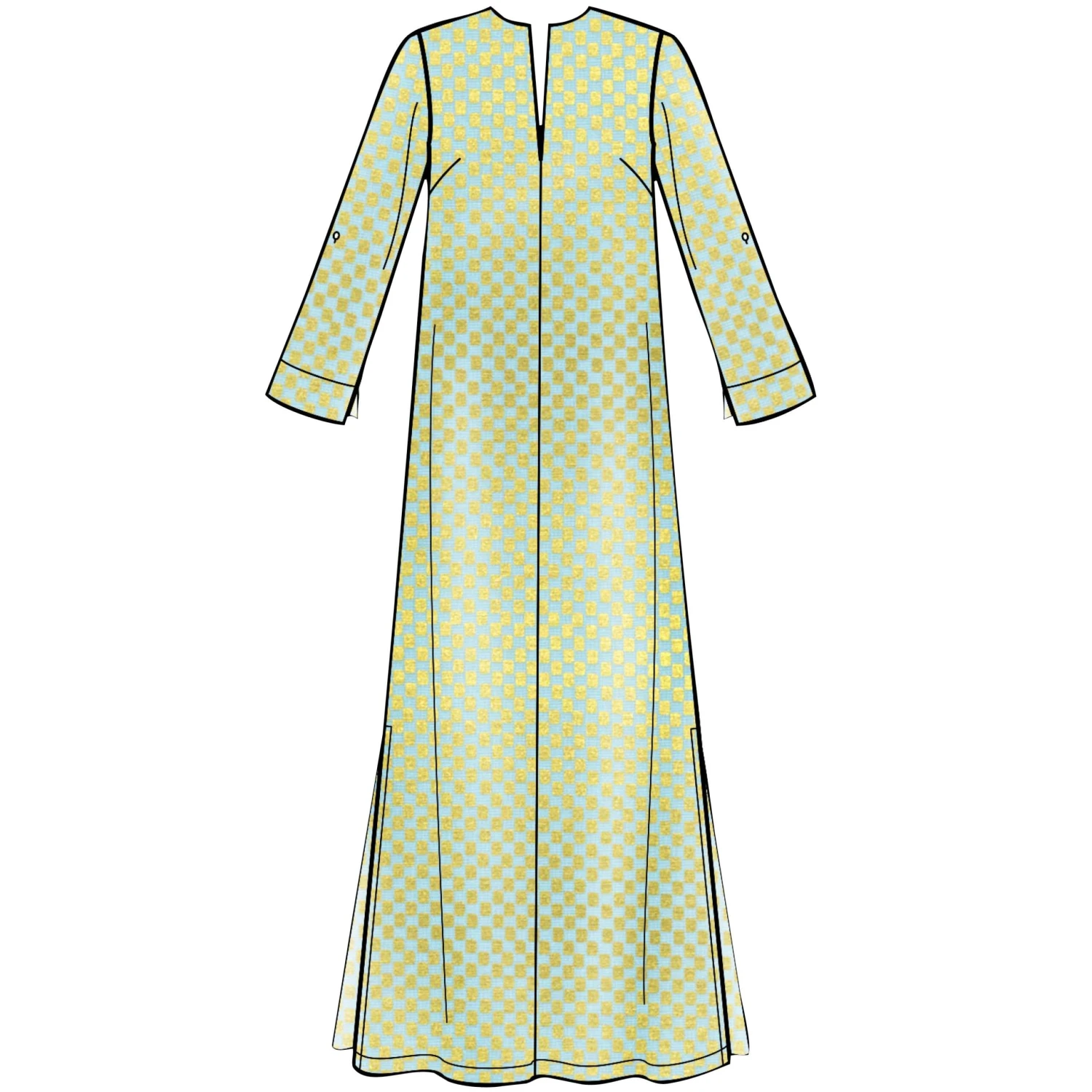 Misses slip-on maxi or short dresses. Front or side split options on maxi dress. View B has narrow tie belt. Sleeveless, mid or full sleeve options. View B and C have small stand collar.