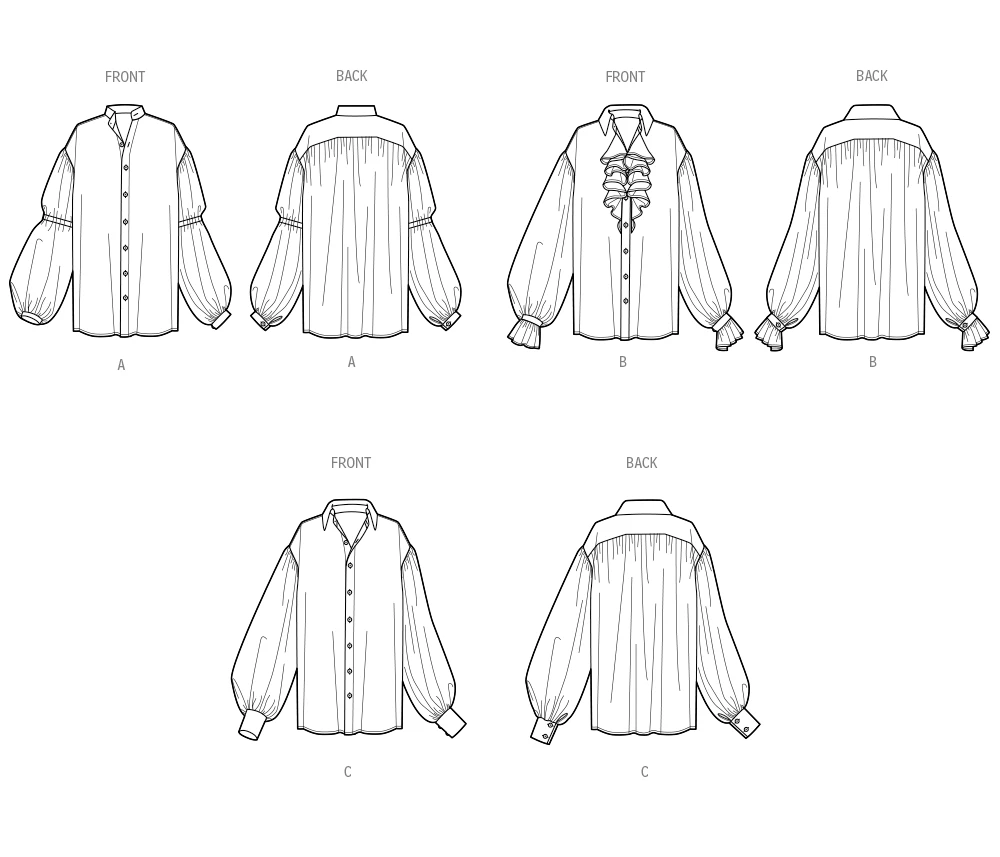 Simplicity sewing pattern for perfect staple garment for Cosplay and Reenactment enthusiasts. Loose fitting shirts have a back yoke, front button closure with full sleeve and collar variations. Cuffs have a continuous lap button closure.
