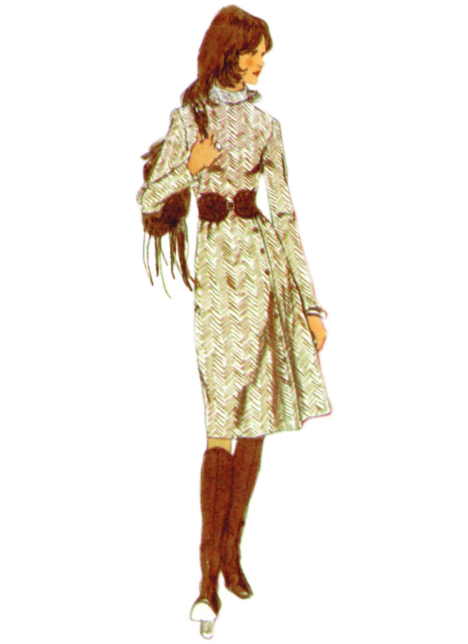 Simplicity Sewing Pattern for Vintage Simplicity 1970’s dress with front-wrap skirt and scarf sewing pattern. The dress with front-wrap skirt softly gathered to bodice has back zipper, stand up collar and long set-in sleeves. Version one features embroidered braid or ribbon trim. Version two has topstitching and button trim. Version three has button trim. Version four with contrasting skirt and scarf features fringe trim. Version five has contrasting skirt. Versions two, three, four, and five have purchased belt. Authentic Vintage Reproduction includes additional sizes and cutting layouts.