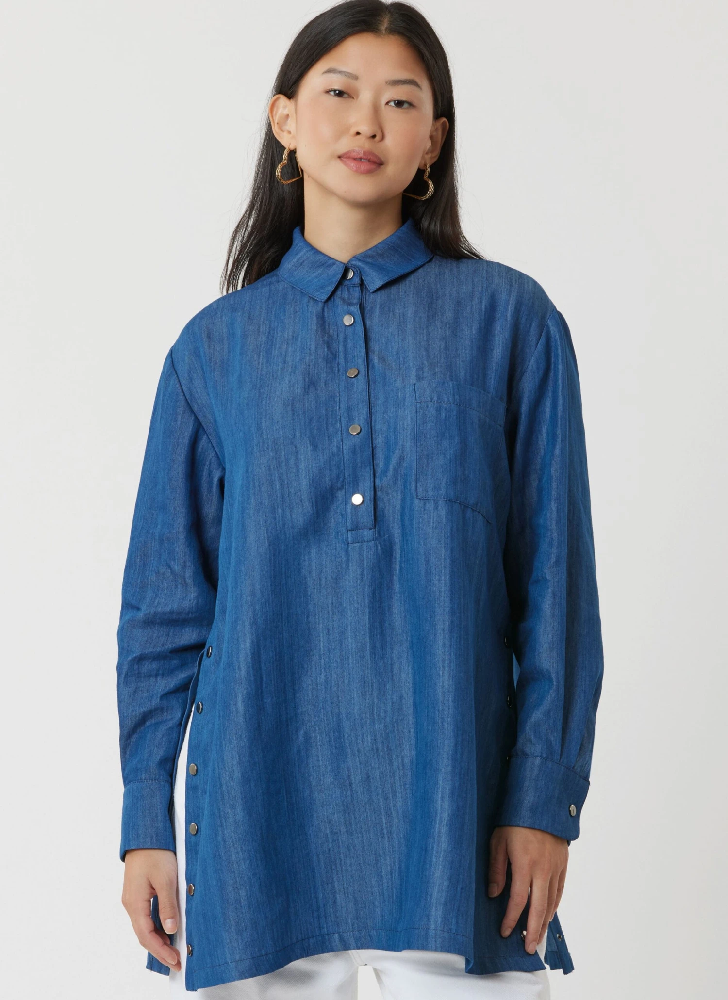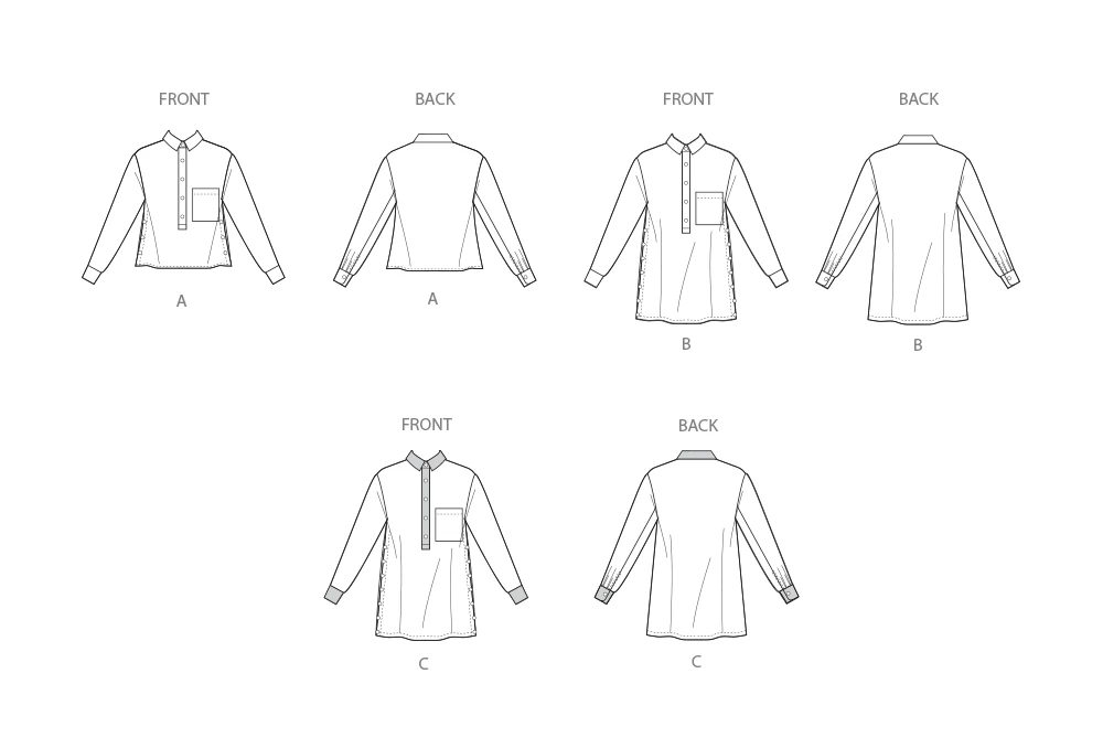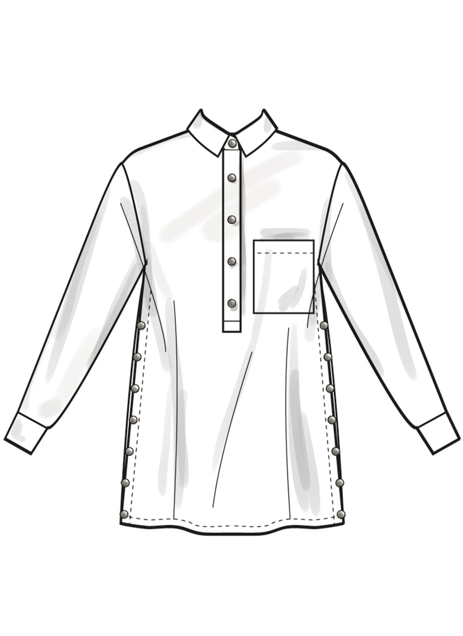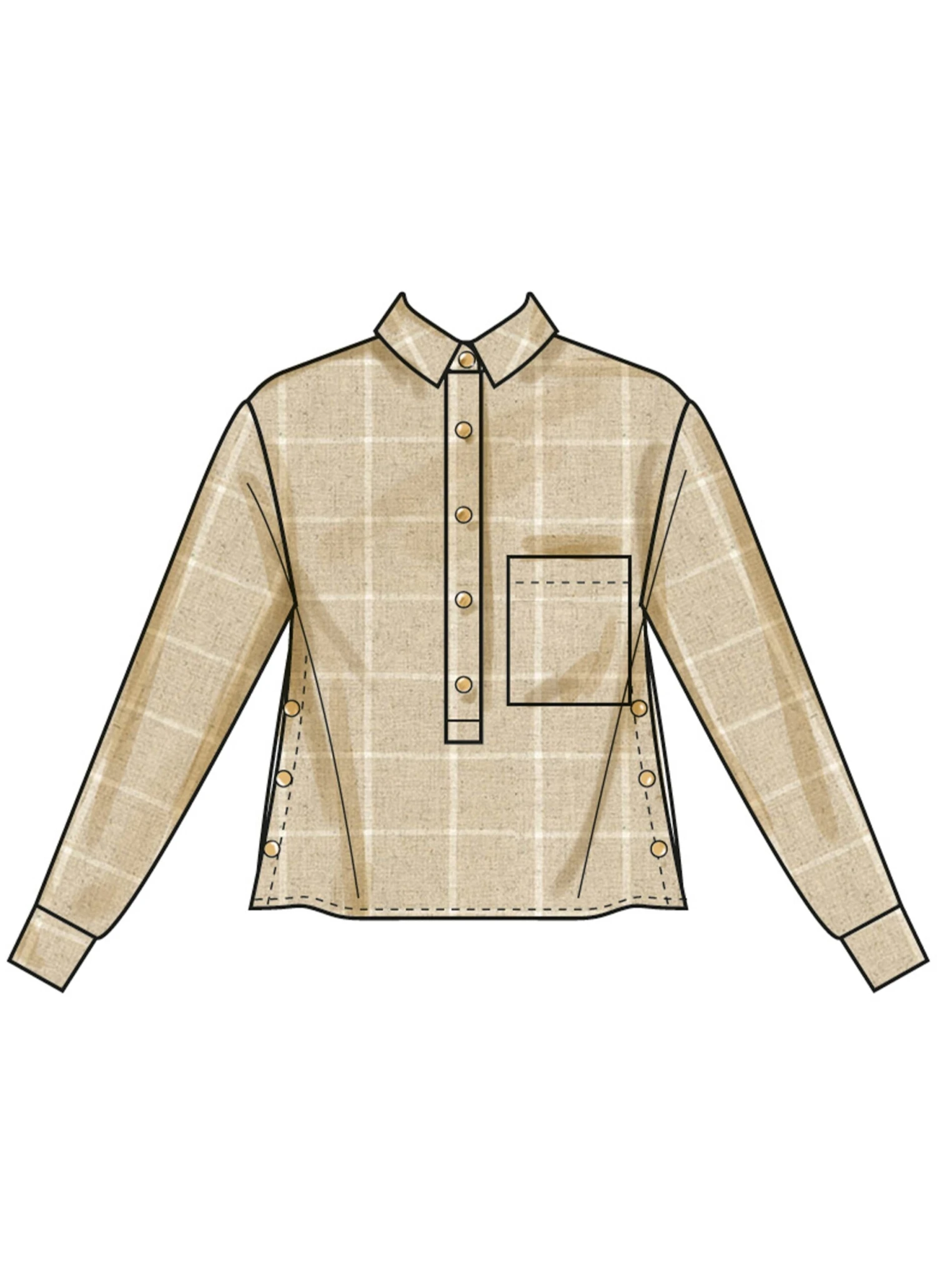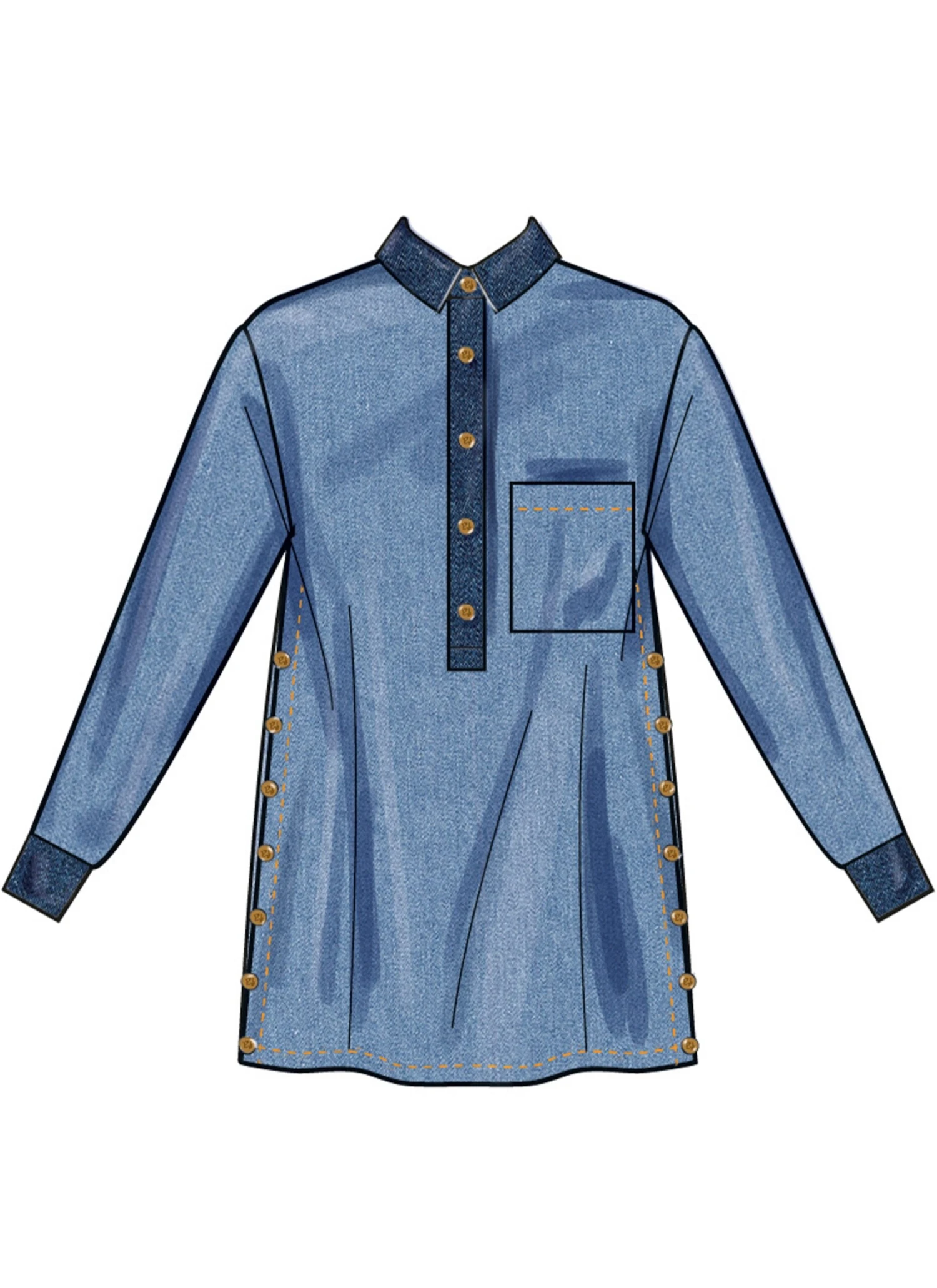 Simplicity sewing pattern for Misses’ Top and Tunics feature metal snaps at side seams, fold down collar, partial front placket with snaps, front patch pocket, and pleated sleeves with snaps at cuffs. View A top has narrow hem. View C tunic has contrast collar, placket and cuffs.
