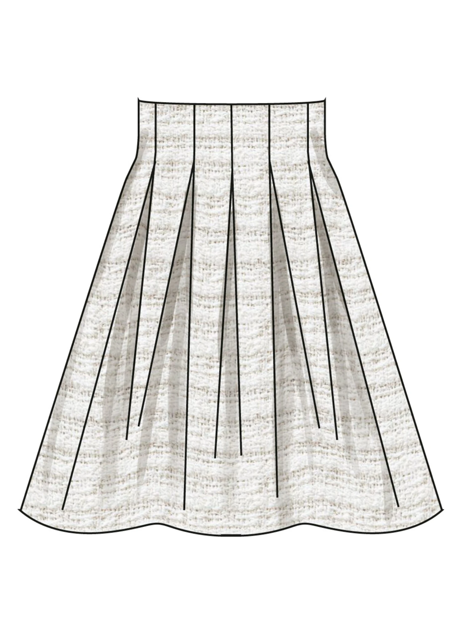 Sewing pattern for High waisted pleated skirt has side seam pockets, invisible zipper closure and length variations. View C skirt has belt.