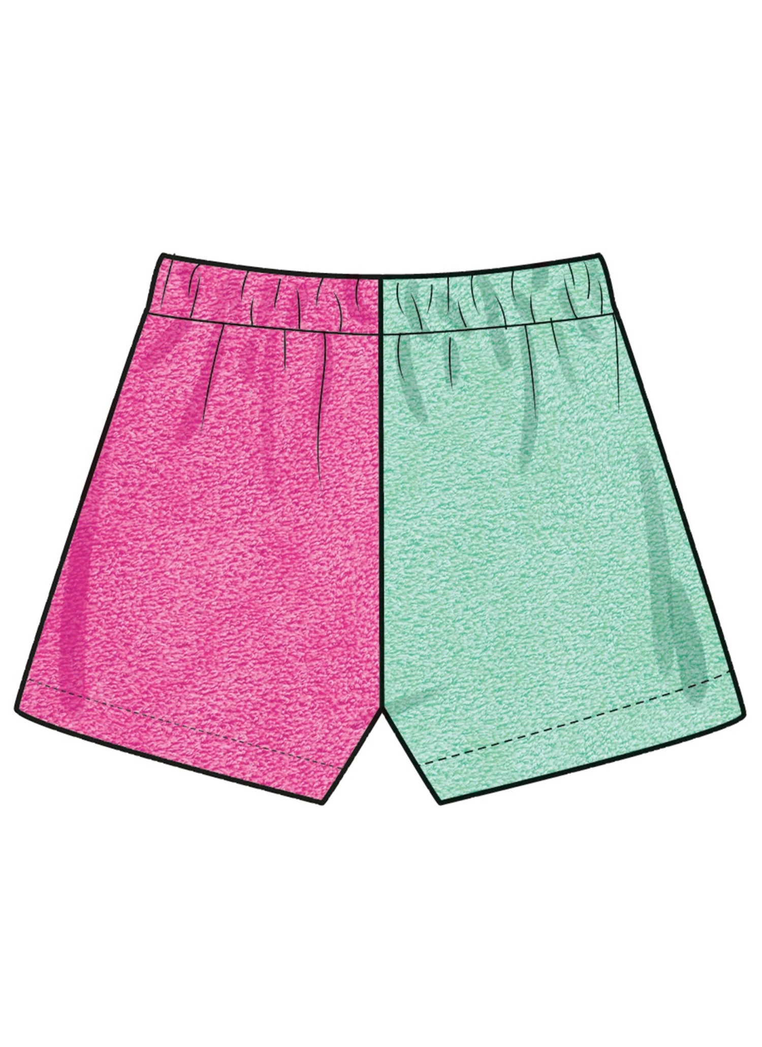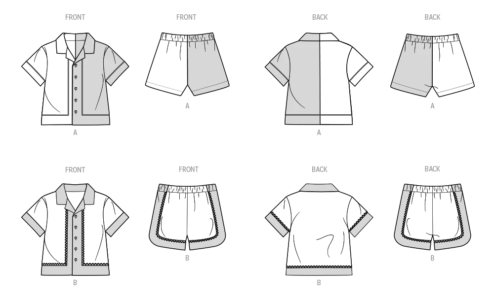 Sewing pattern for Short sleeve shirt has collar, front button opening, optional applique, purchased piping or rick rack trim. Pull on shorts have elastic waistband.