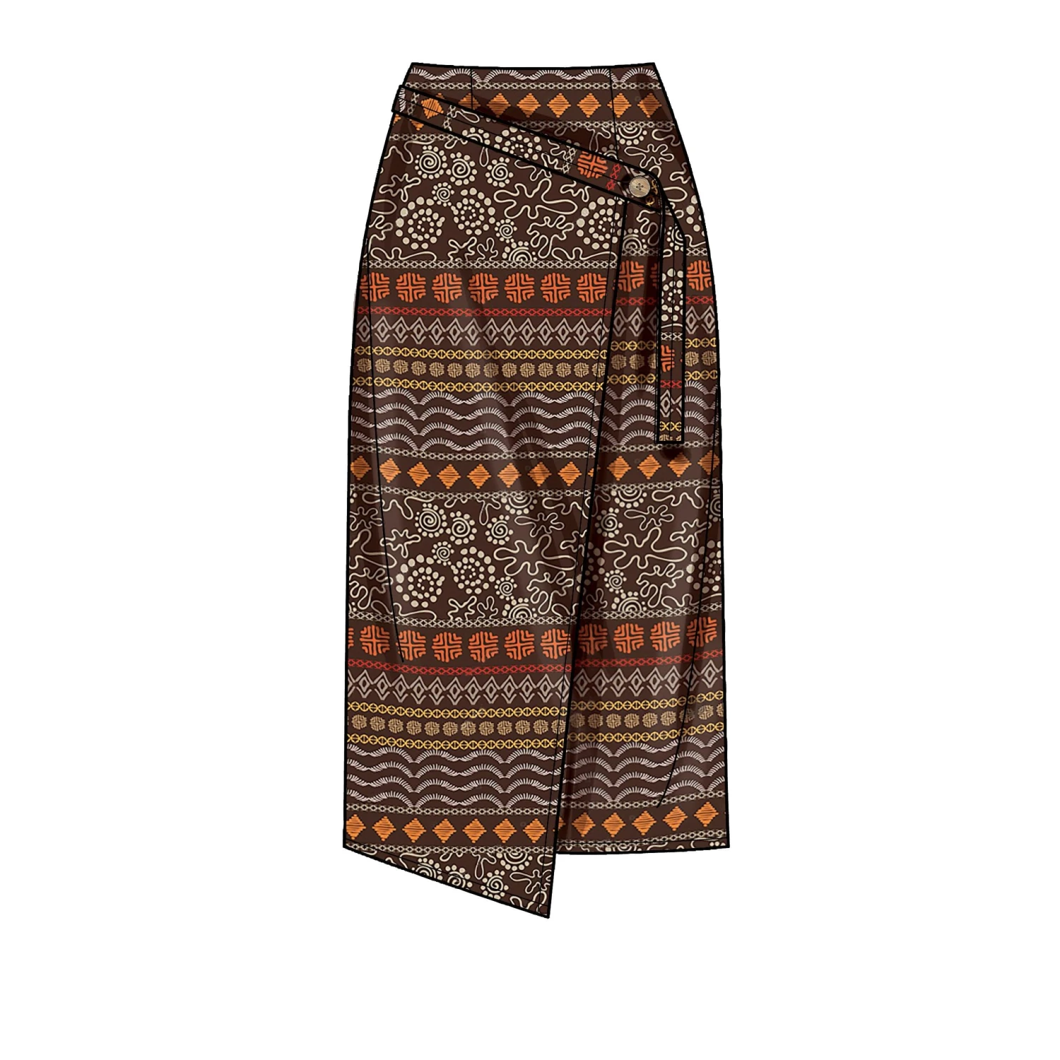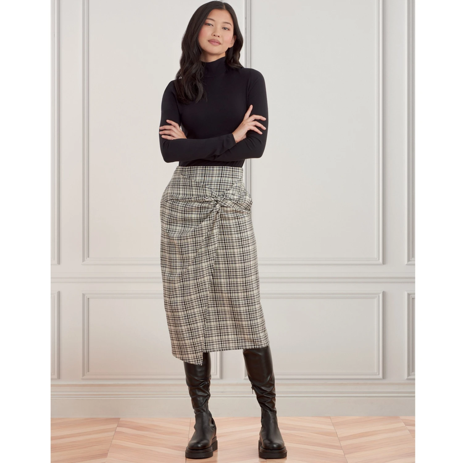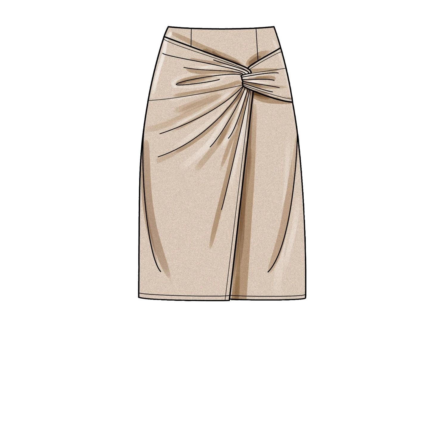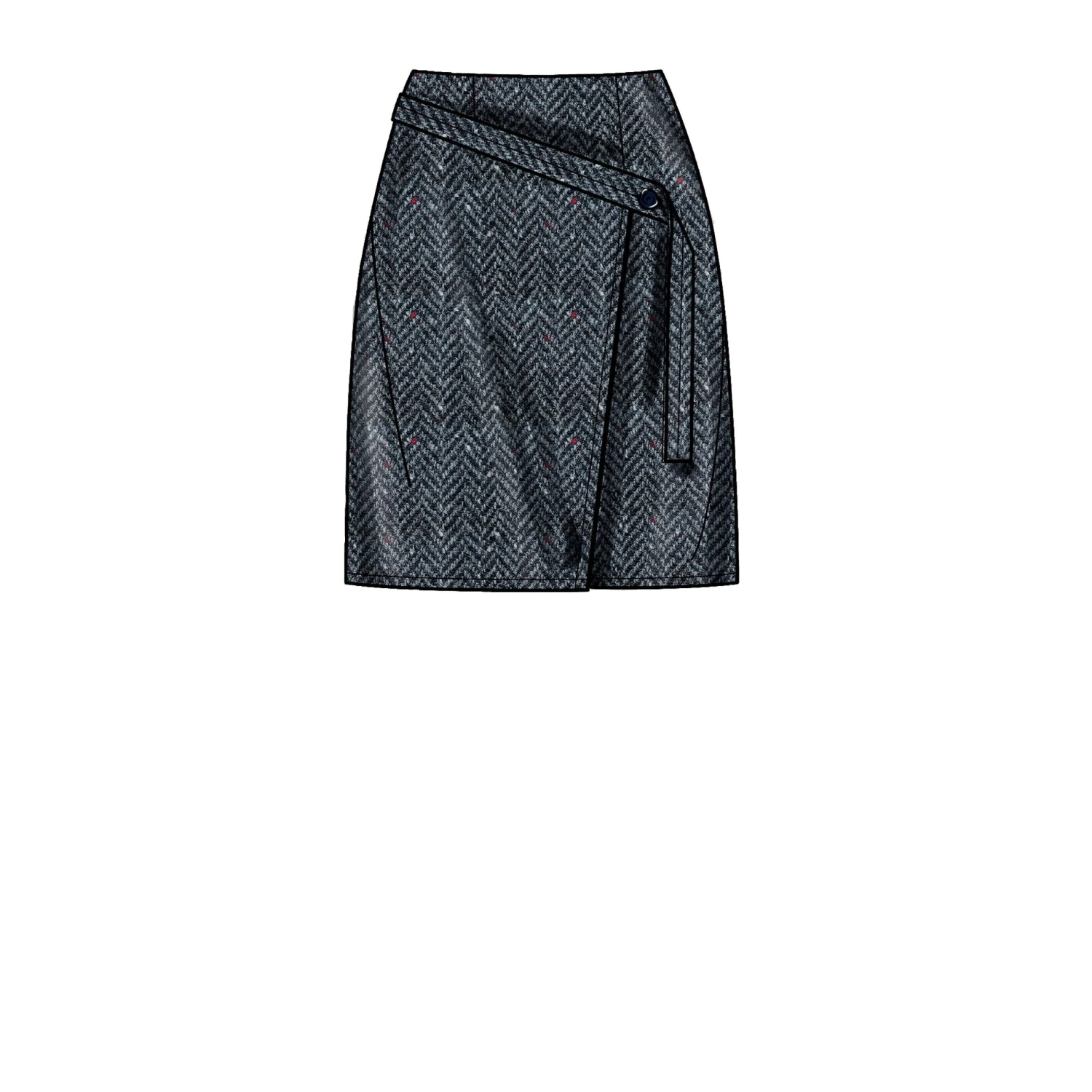 Simplicity Sewing Pattern for Faux wrap skirt with twist has side seam pockets, front and back darts and center back invisible zipper. Variation for flat wrap front with button closure on extended strap.