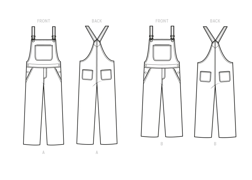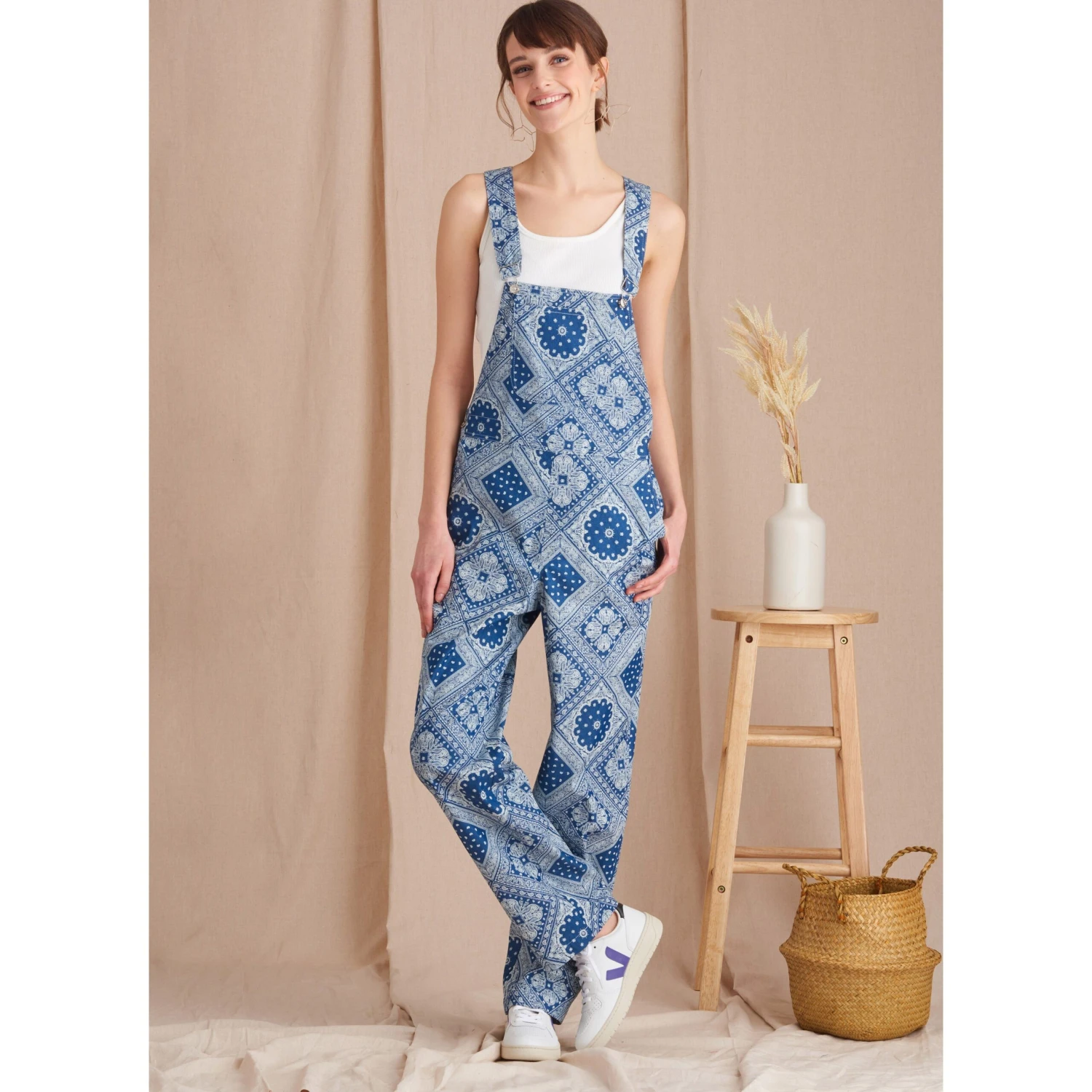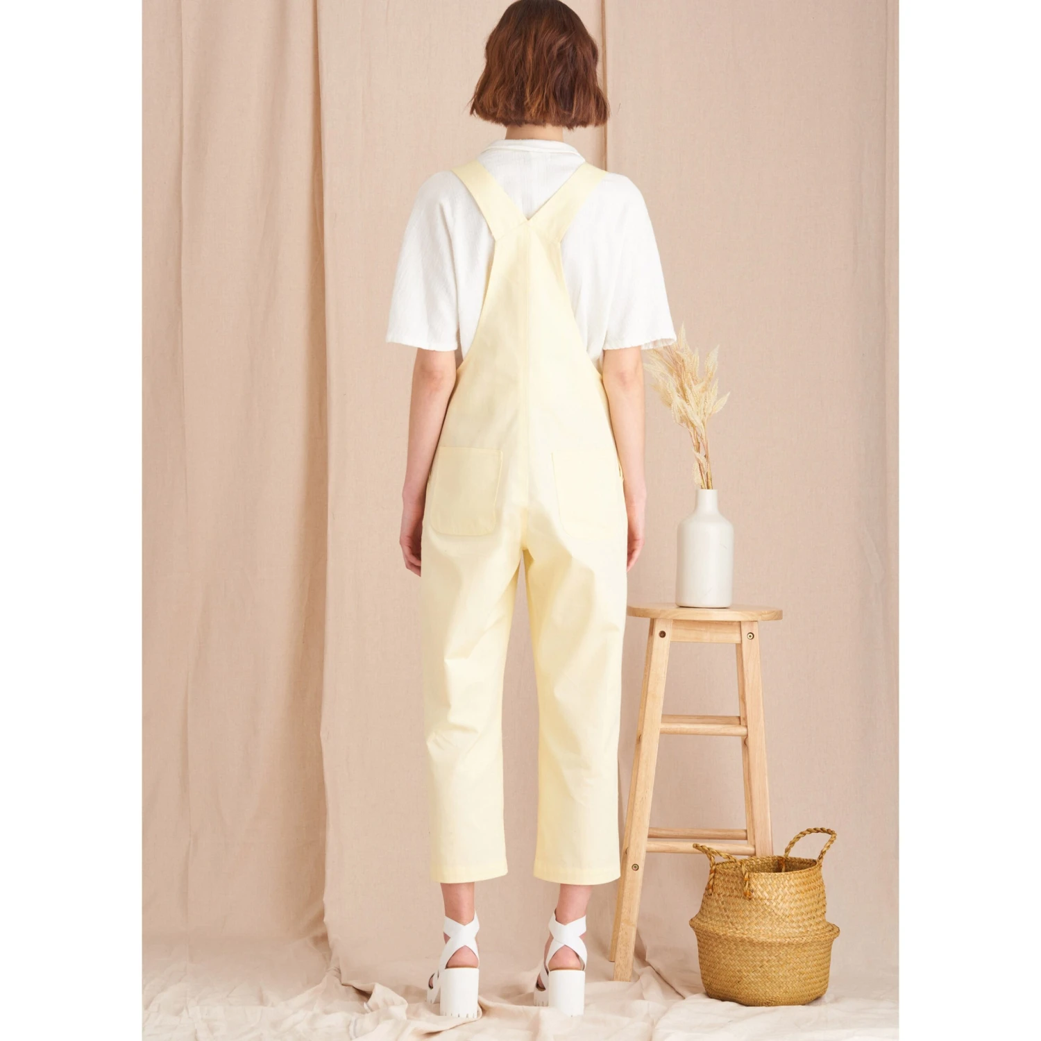 Simplicity sewing pattern for Relaxed fit, straight leg overalls in ankle and cropped lengths have adjustable shoulder straps attaching to bib with overall buckles. Features bib and back patch pockets, front yoke and pockets, button closures and top stitched details.