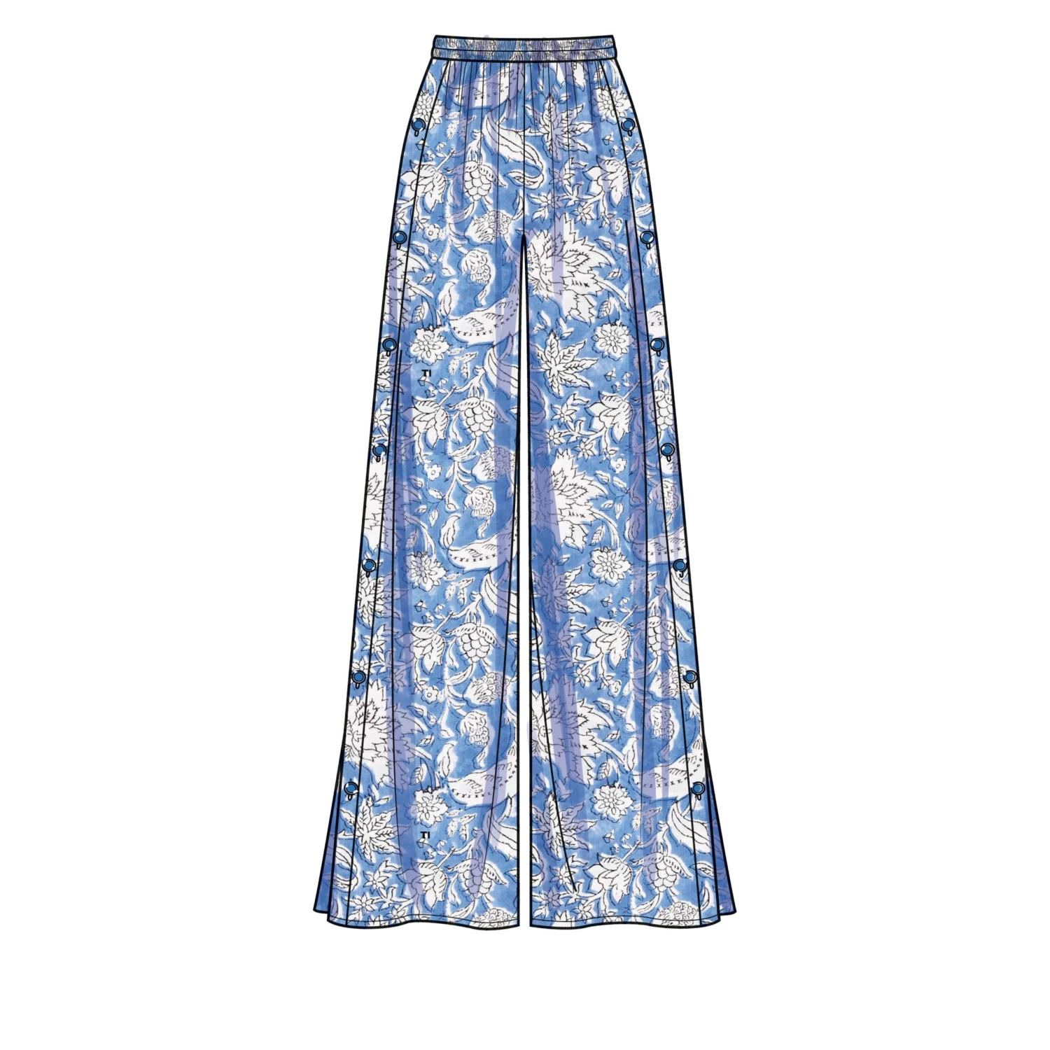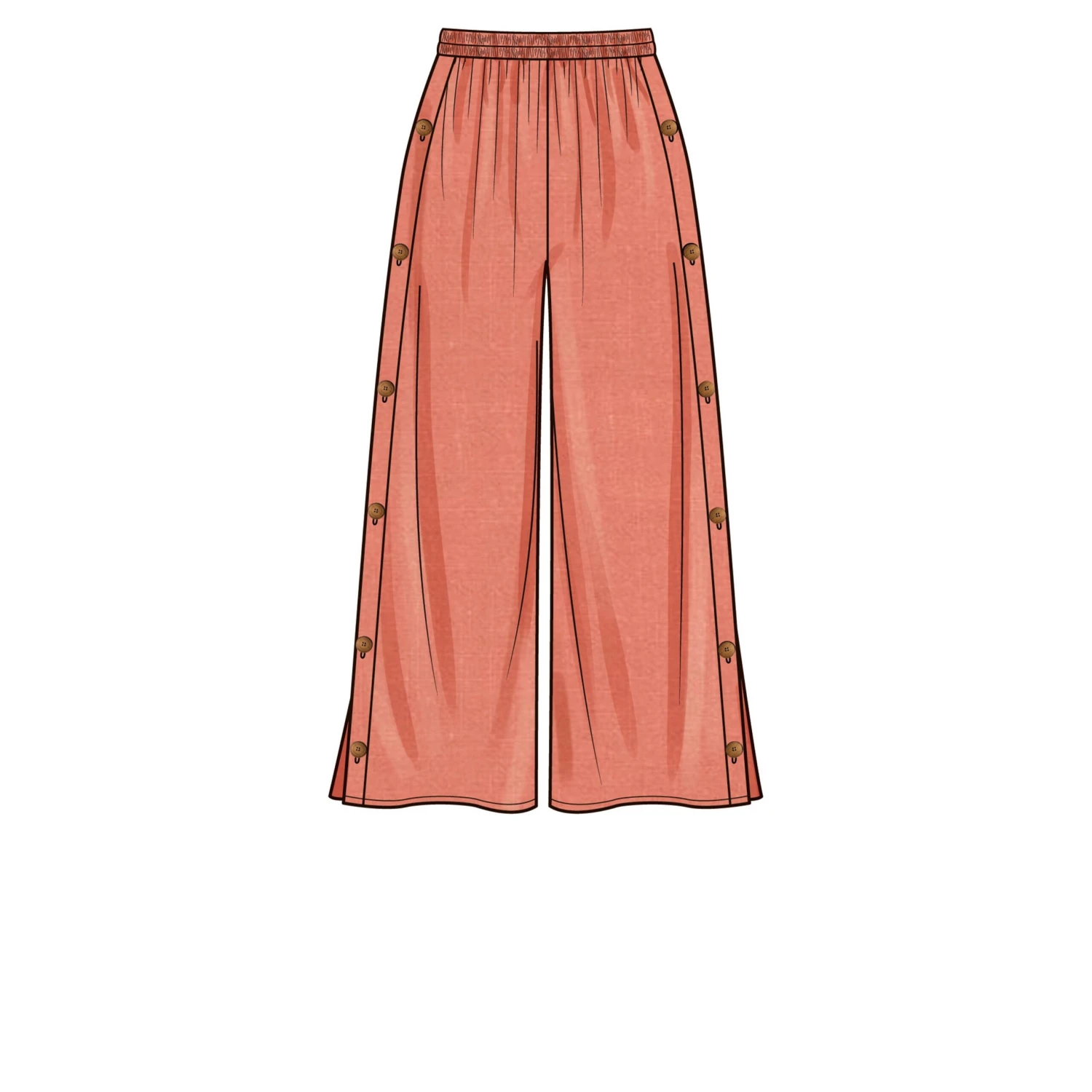 Simplicity sewing pattern for Wide leg trousers and skirt have elasticized waistband and functional button placket on side seams. Pants have variations for long and cropped lengths.