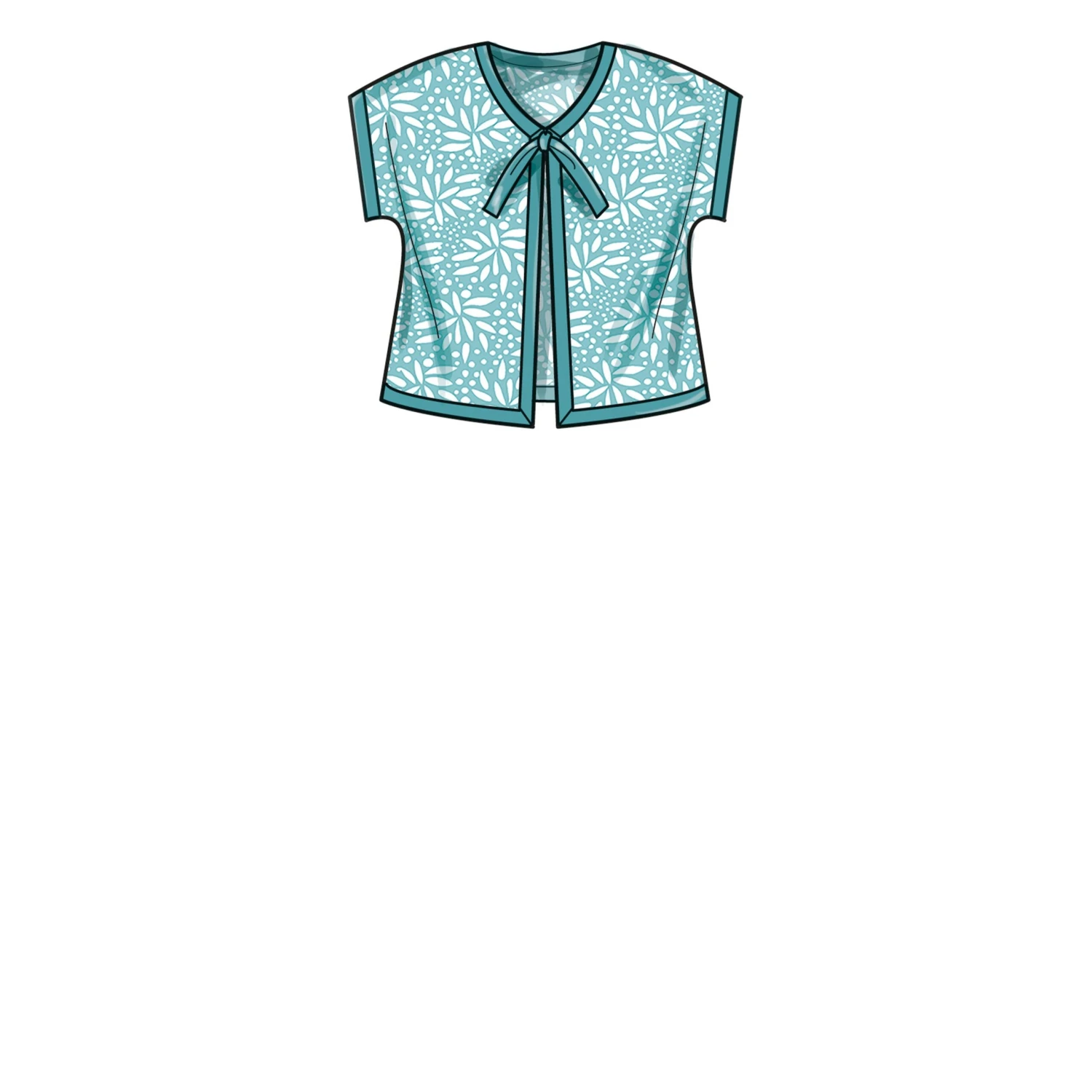 V-neck jacket with all-in-one sleeves is finished with bias tape. Pullover knit tee-shirts have short sleeves and sleeve ruffle variations. Pull-on pants have ruffle hem or cargo pockets. Bucket hat in three sizes S-M-L.