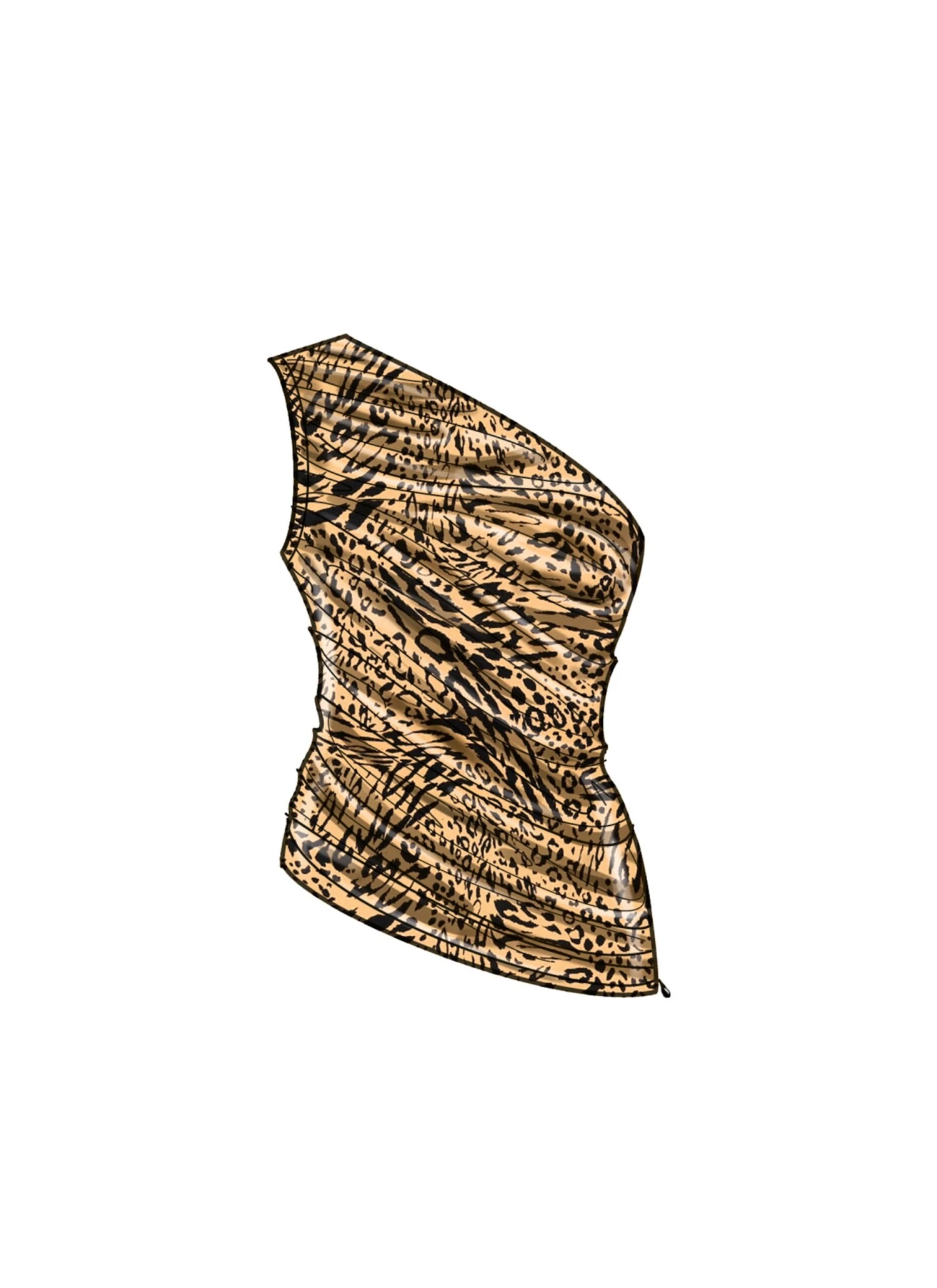 Simplicity sewing pattern for Asymmetrical draped top with one shoulder or shoulder tie. Wide leg pants and slim skirt with slit have wide yoke. Sized for stretch knits only.